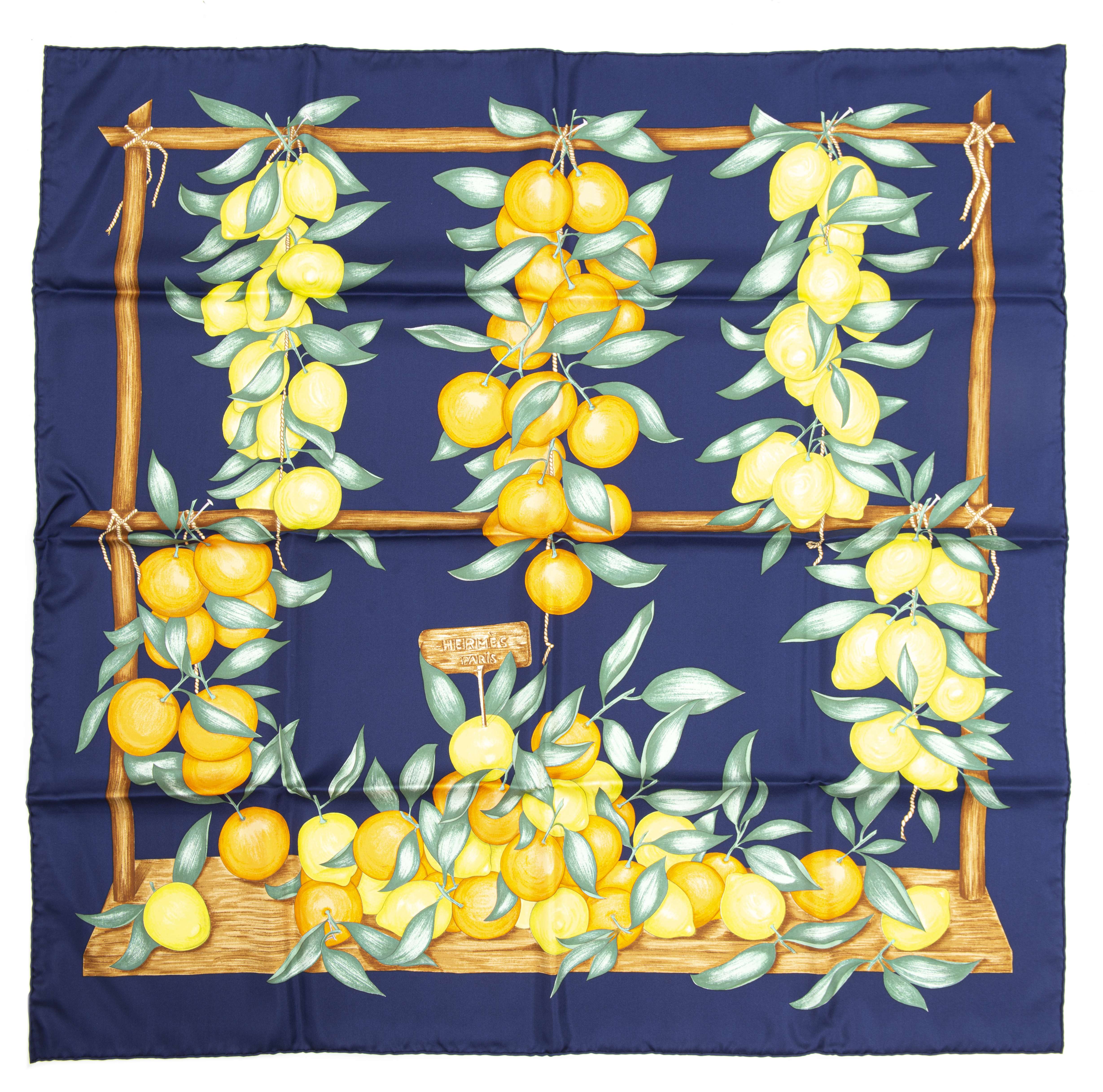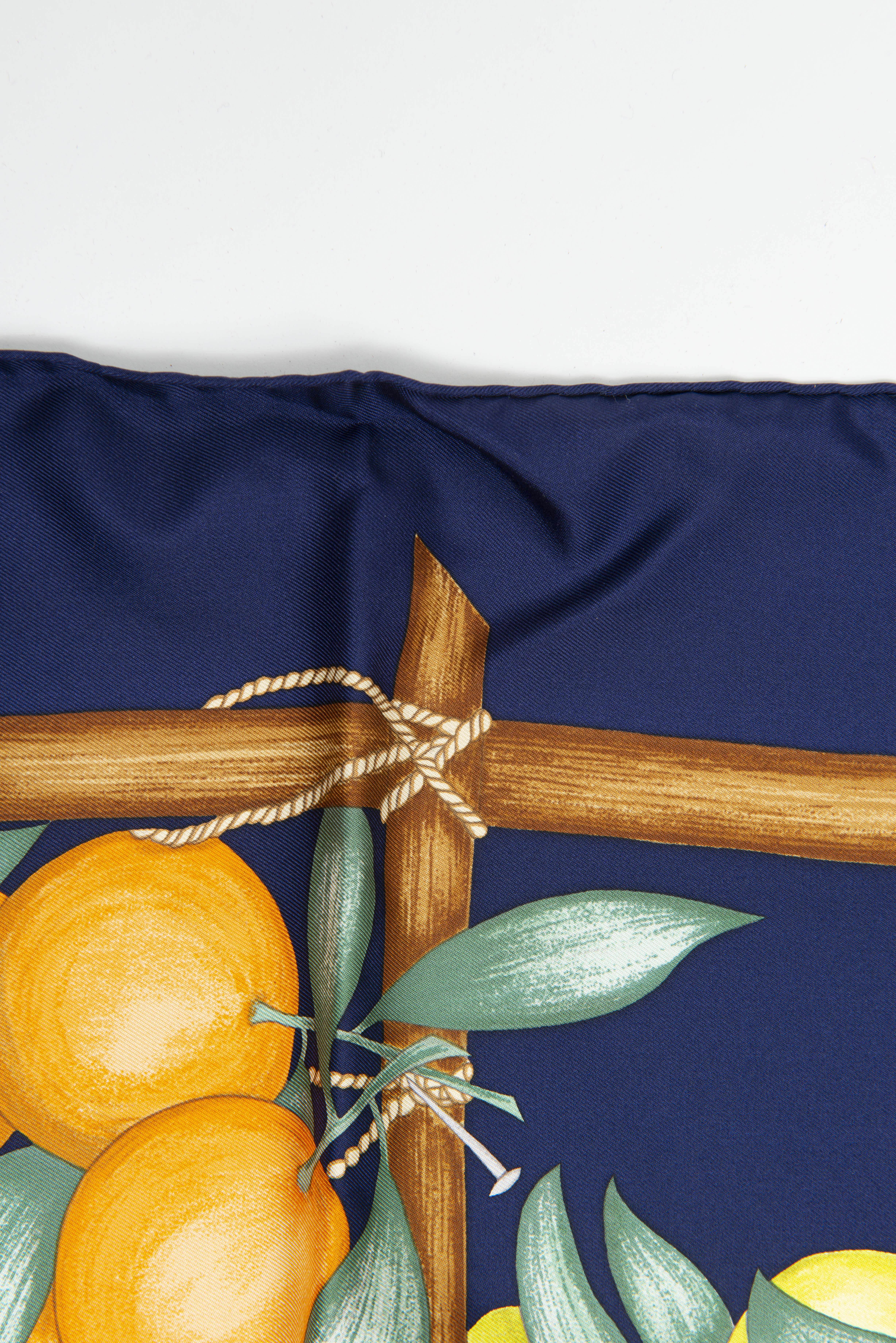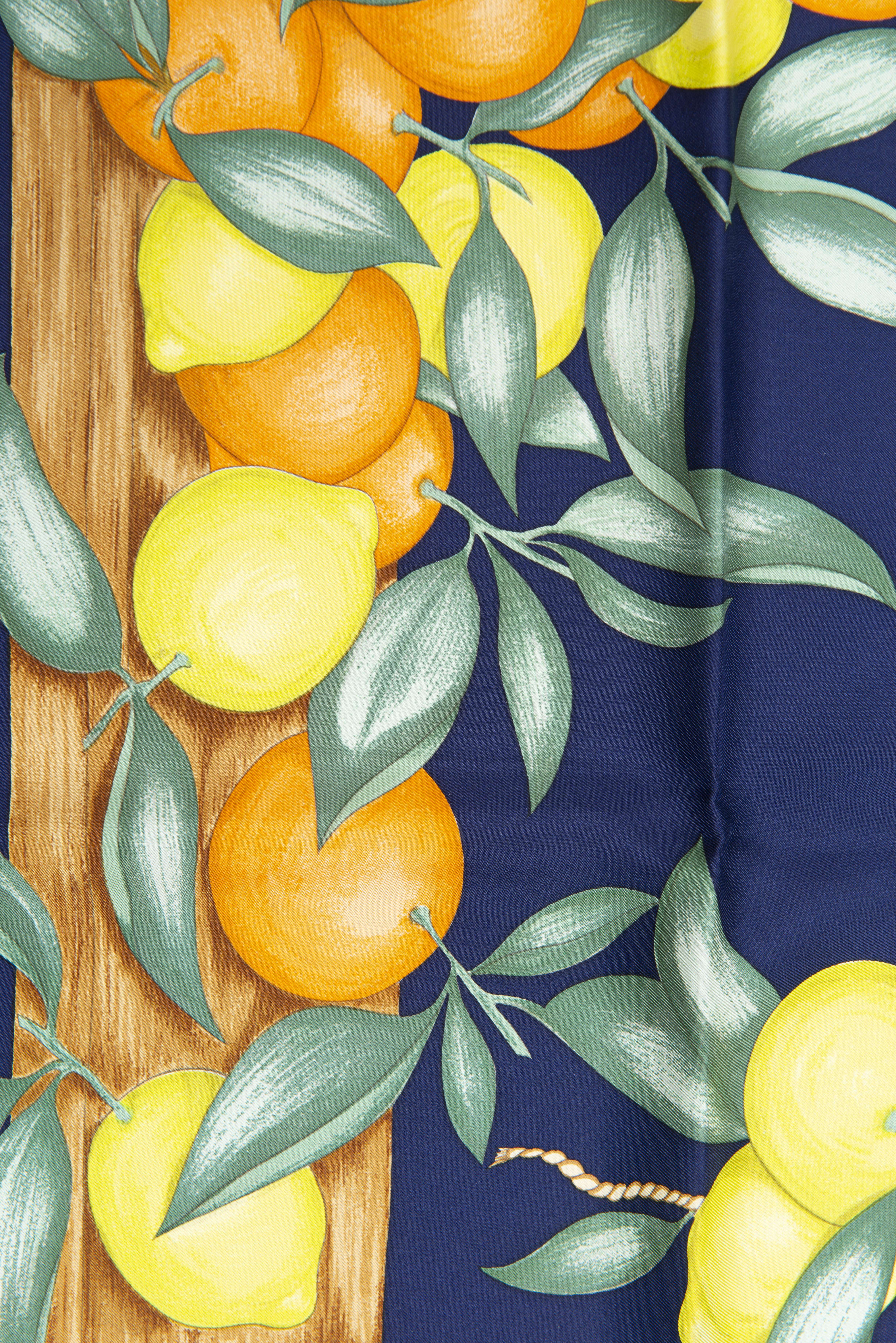 HERMÈS, Carré en twill de soie "Citrons et oranges sur fond bleu" par Valerie Dawlat-Dumoulin