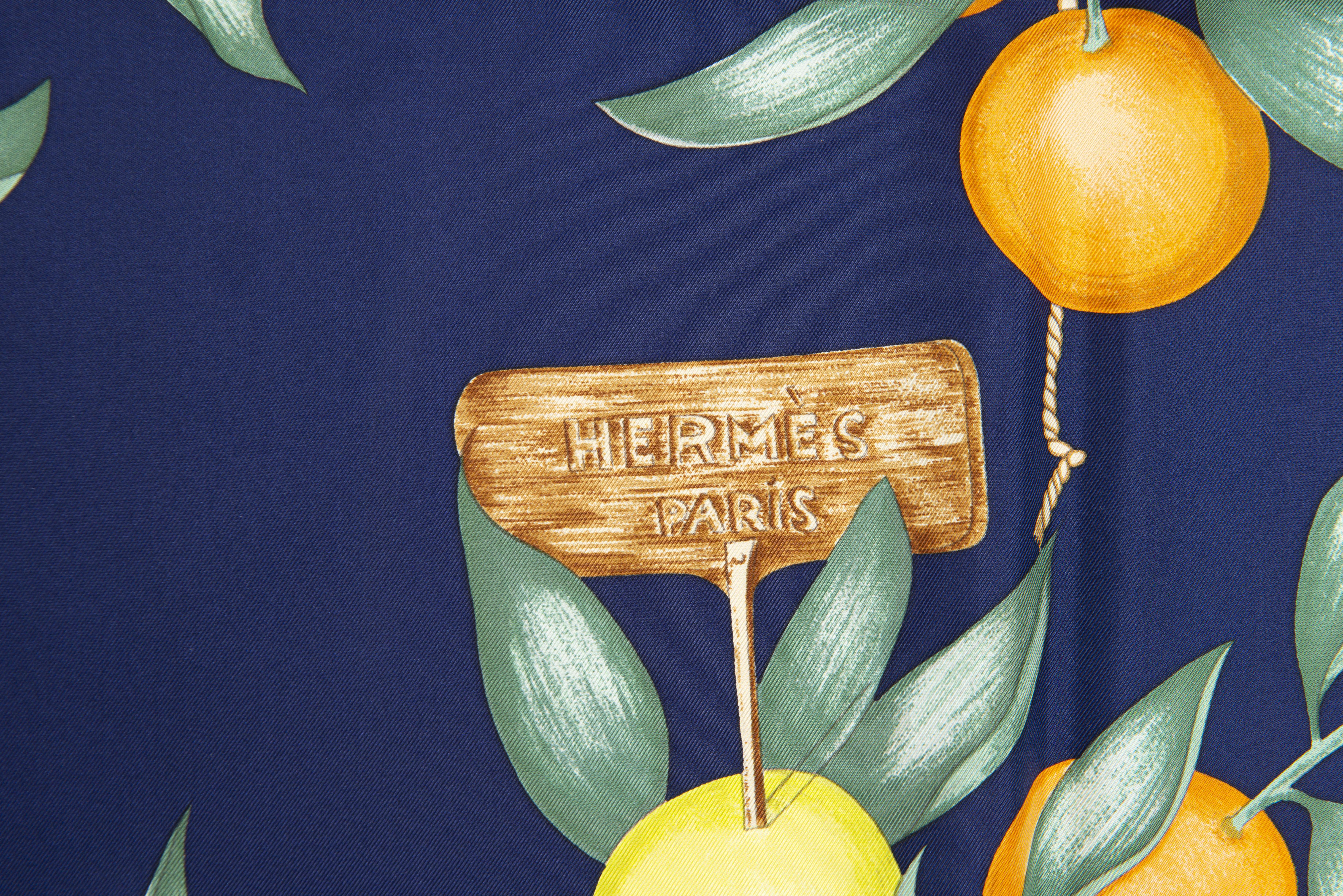 HERMÈS, Carré en twill de soie imprimé, modèle "Citrons et oranges sur fond bleu" dessiné par Valerie Dawlat-Dumoulin dite Madame La Torre, 2003.