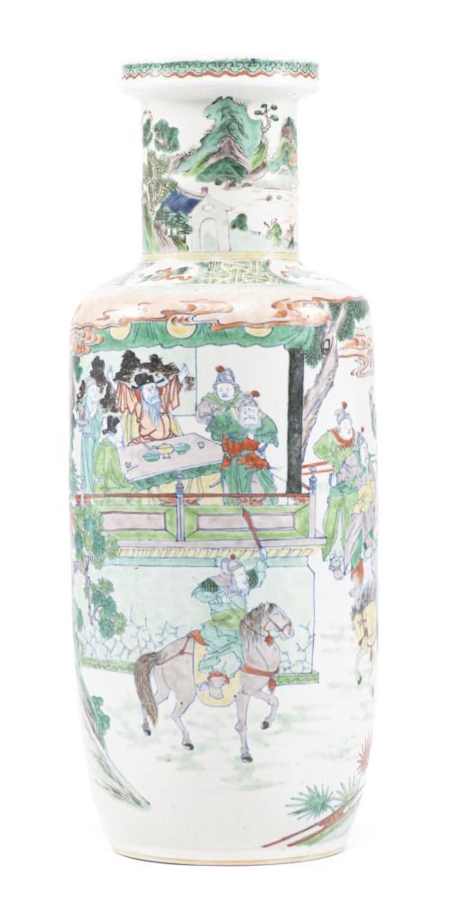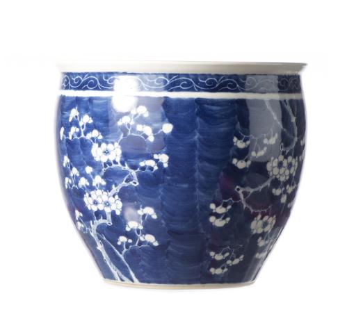 Quatre coupelles en émail de canton XIXe à décor central d'une scène de personnages et médaillon de paysage sur un champ bleu à décor floral.