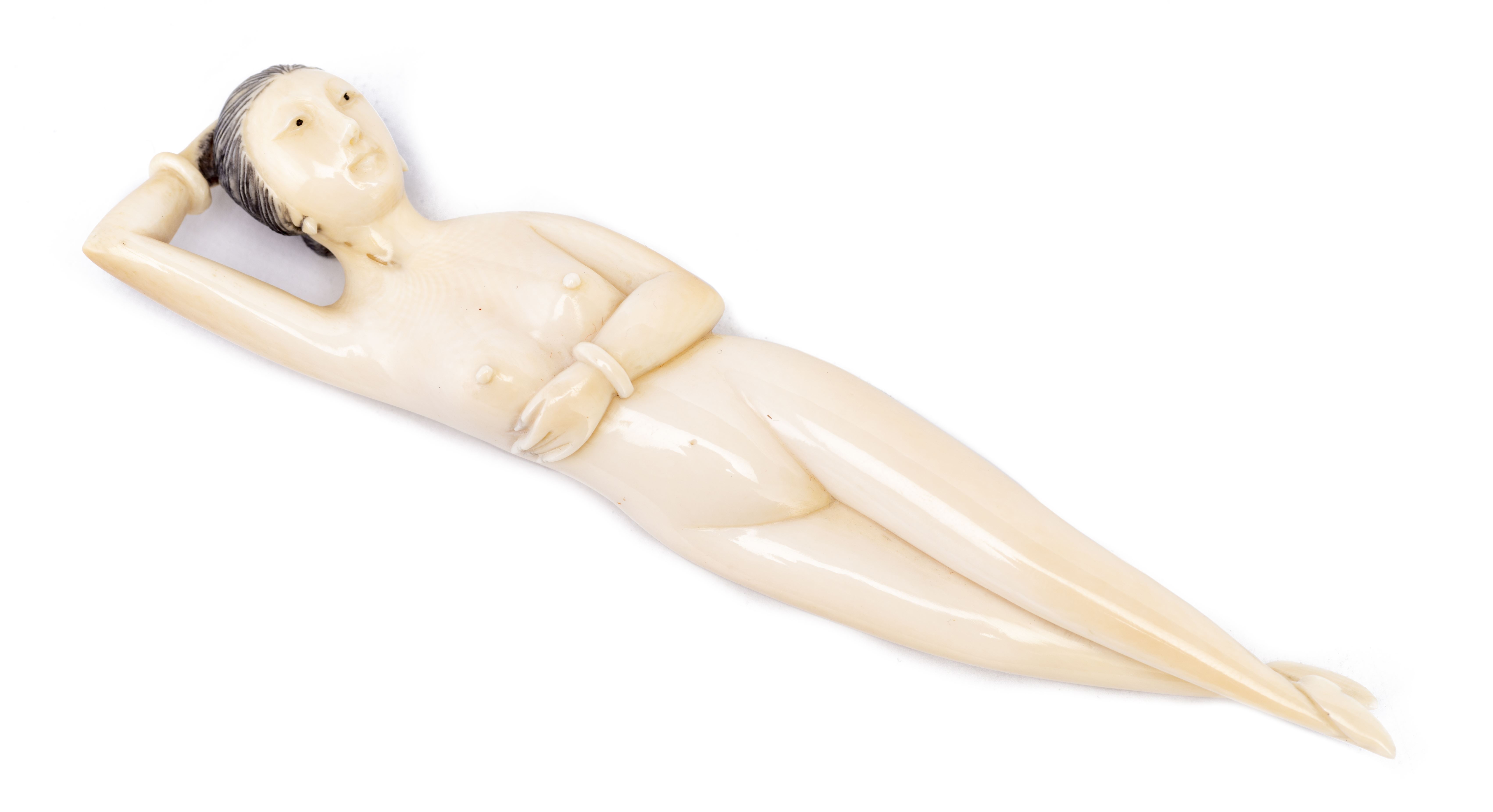 CHINE, Sculpture d'une "femme de médecine" couchée en ivoire, la main droite derrière la tête et la main gauche sous le sein droit. La sculpture est couchée allongée.