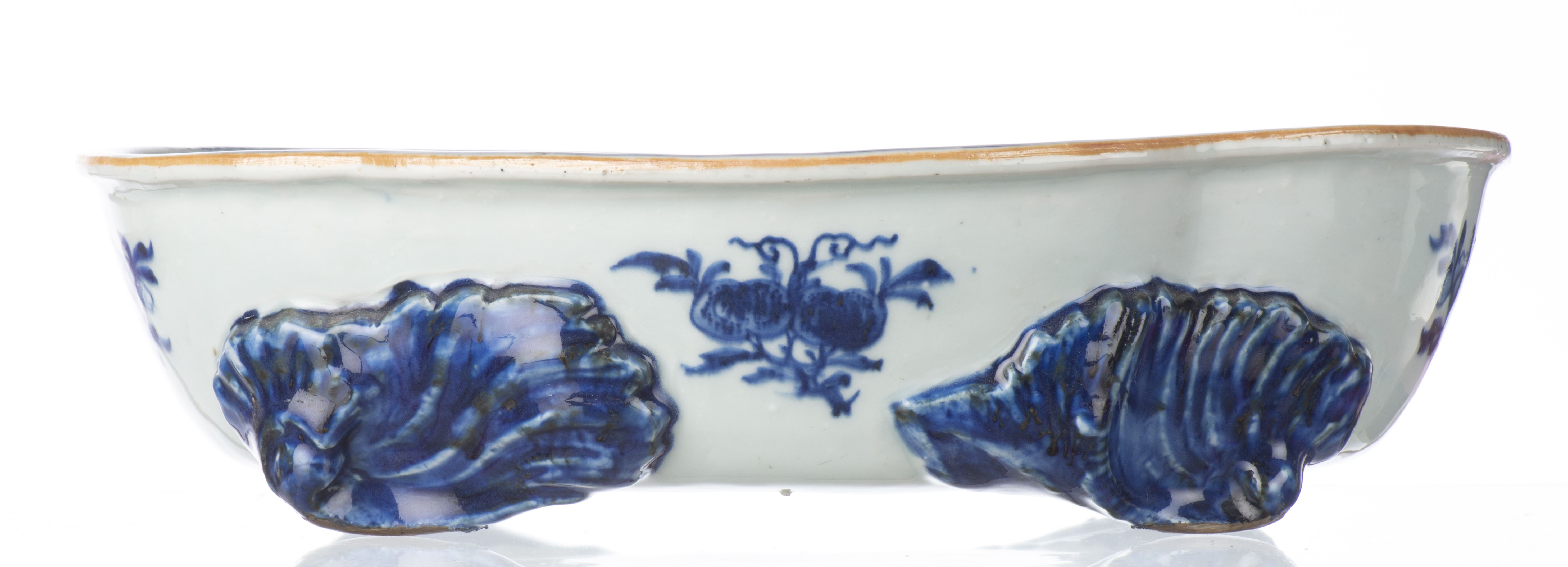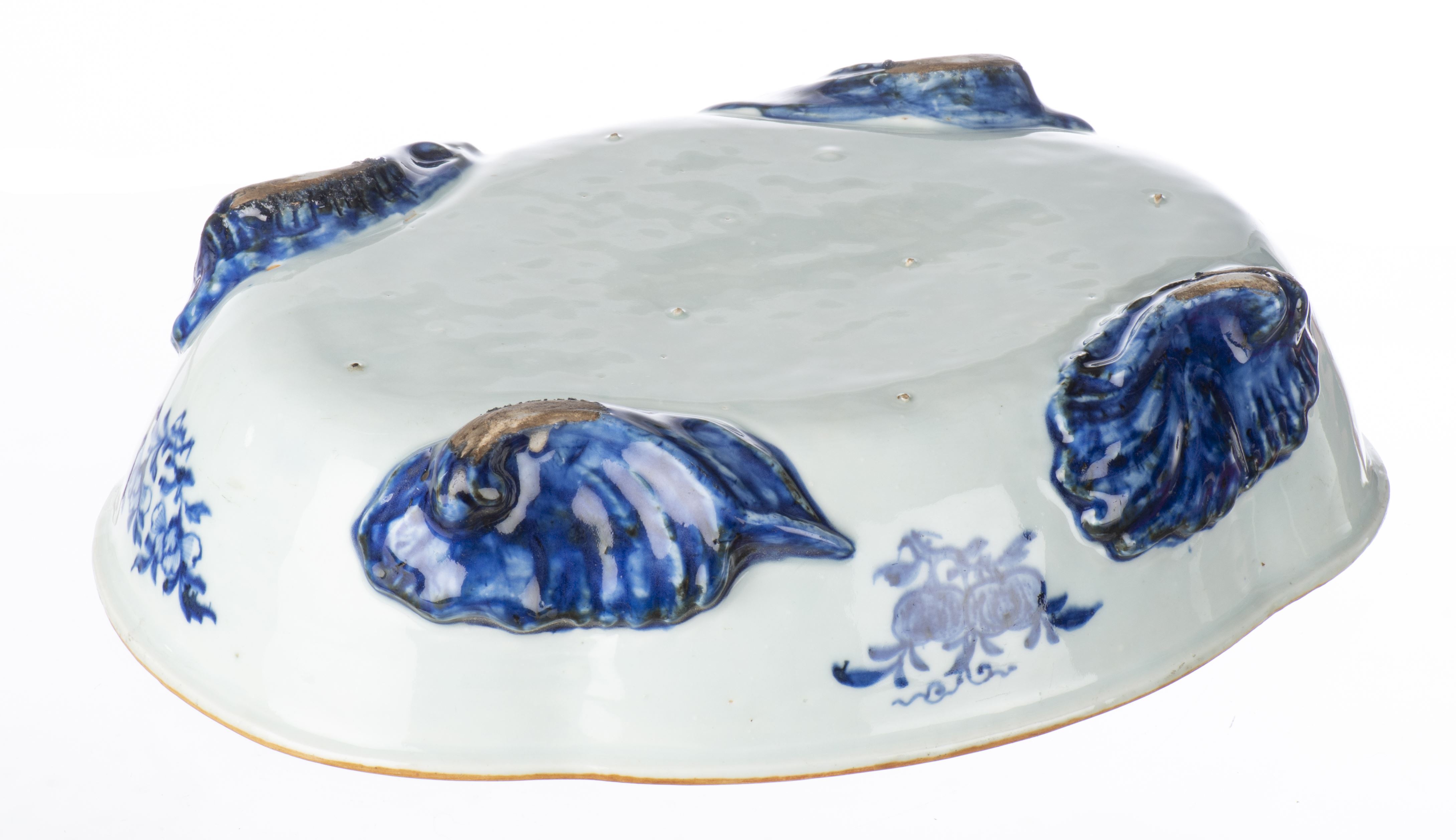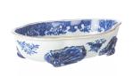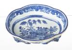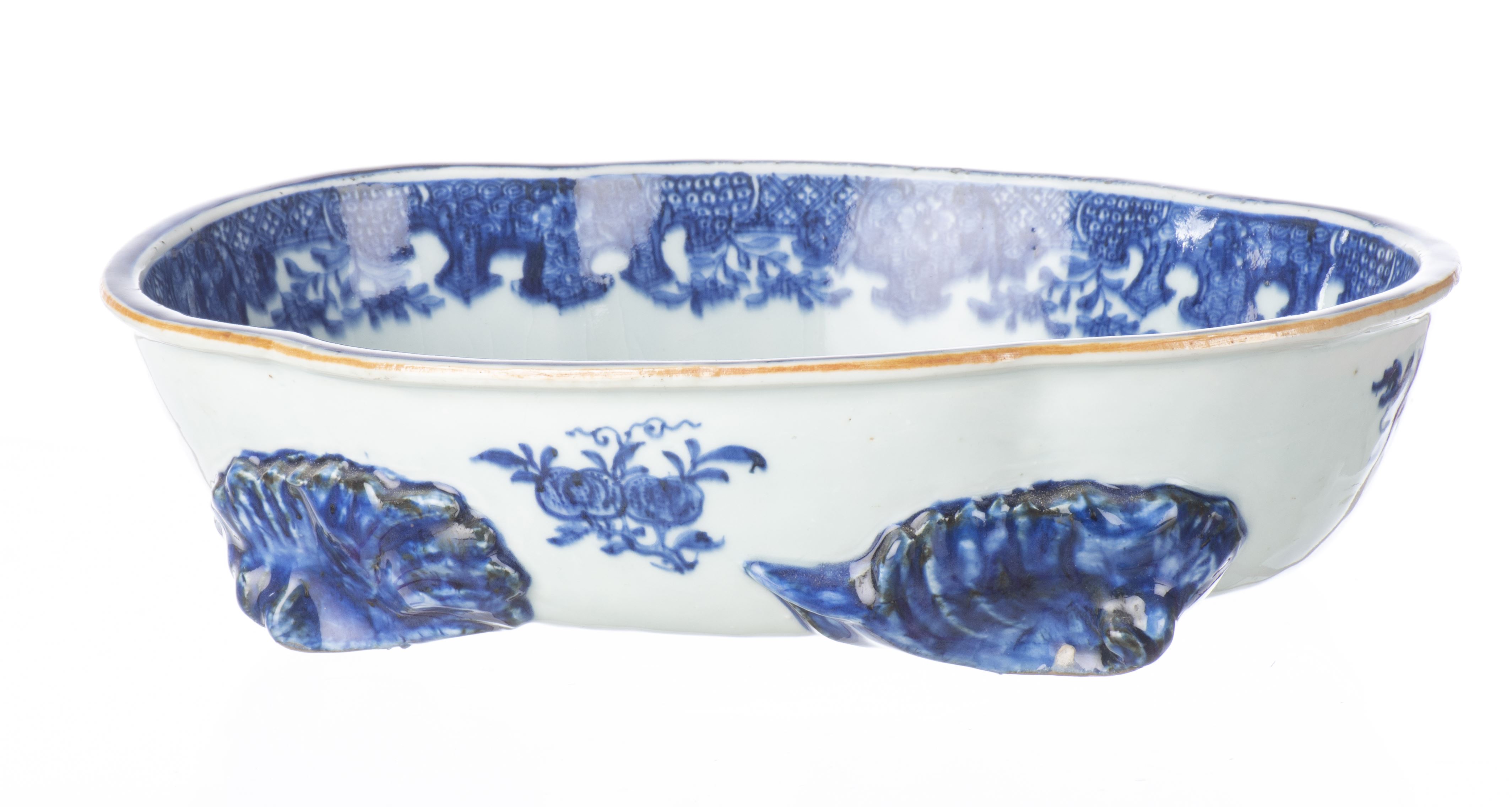CHINE, Bassin en porcelaine de la Compagnie des Indes, époque Qianlong circa 1760, à décor en bleu & blanc de pivoines, ruyi et saules dans un jardin, avec une barrière à décor de ruyi. Bordure à décor de grenades et branches fleuries sur champ de treillis en losange. Le bassin est polylobé et monté sur 4 pieds en forme de coquille.