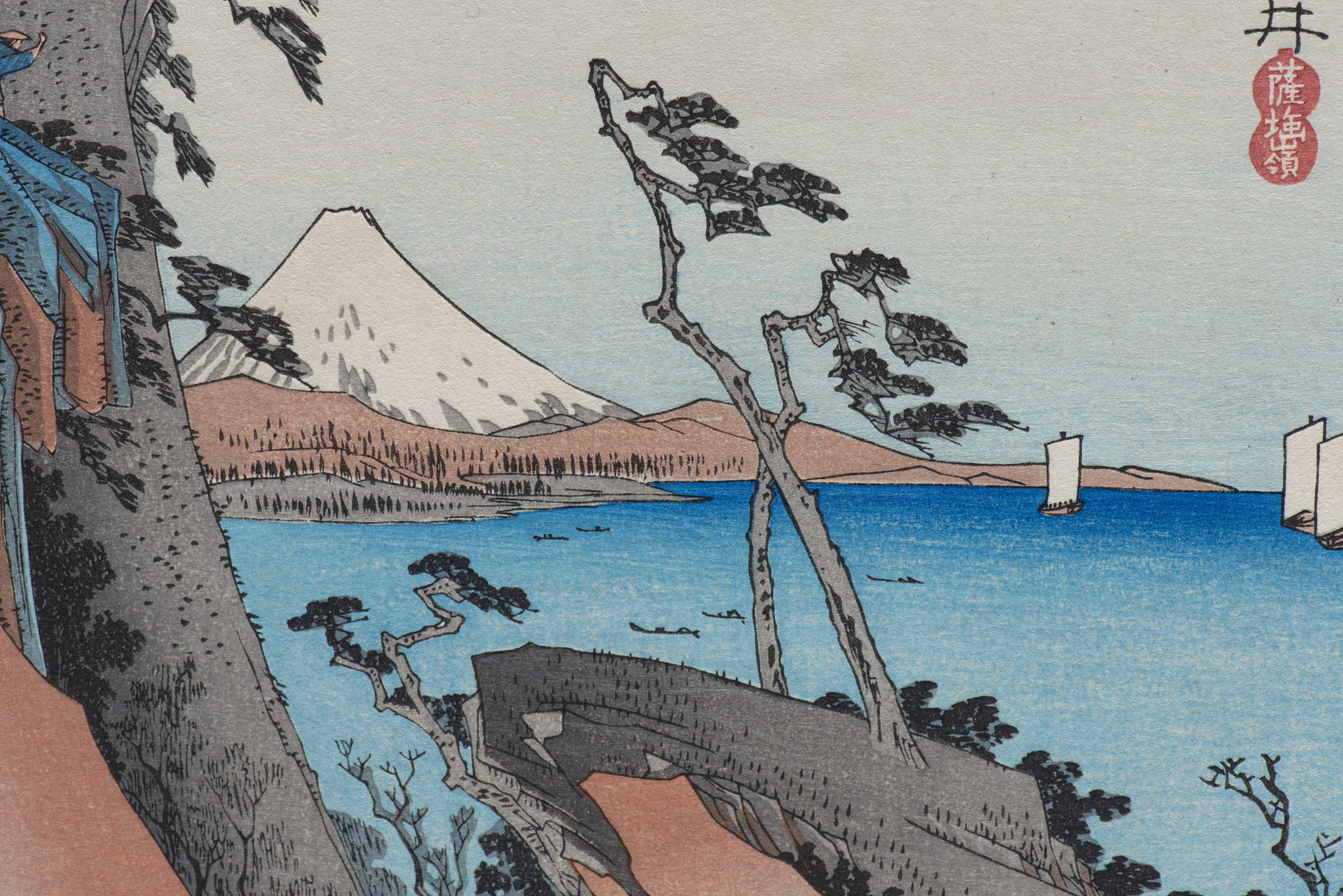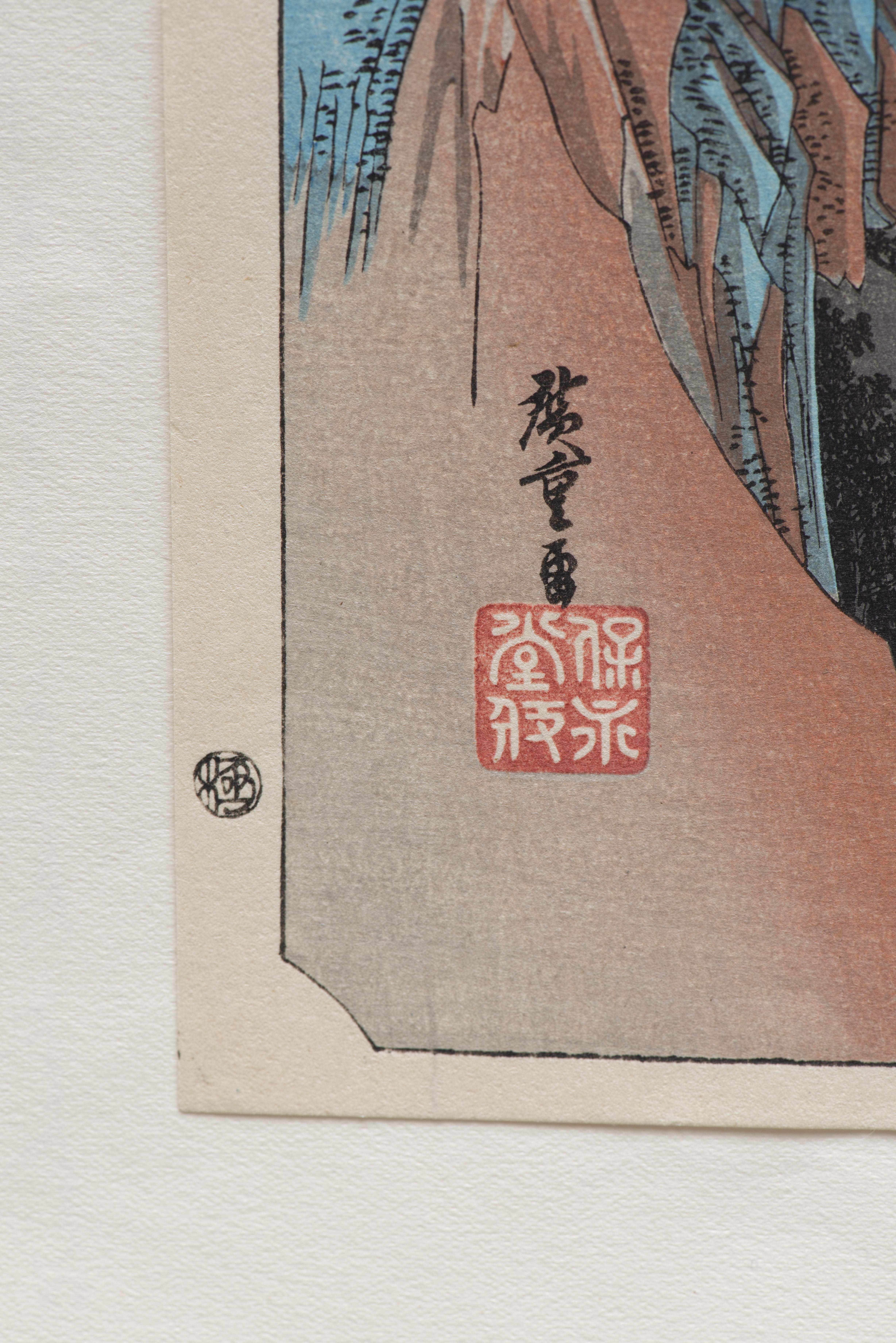 JAPON, Utagawa Hiroshige (1797-1858),"Yui satta mine" (Le pic de Satta près de Yui), estampe japonaise, N°17 de la série "Cinquante Stations du Tokaido (Hoedo Tokaido)", signature et sceau de l'artiste au centre à gauche.