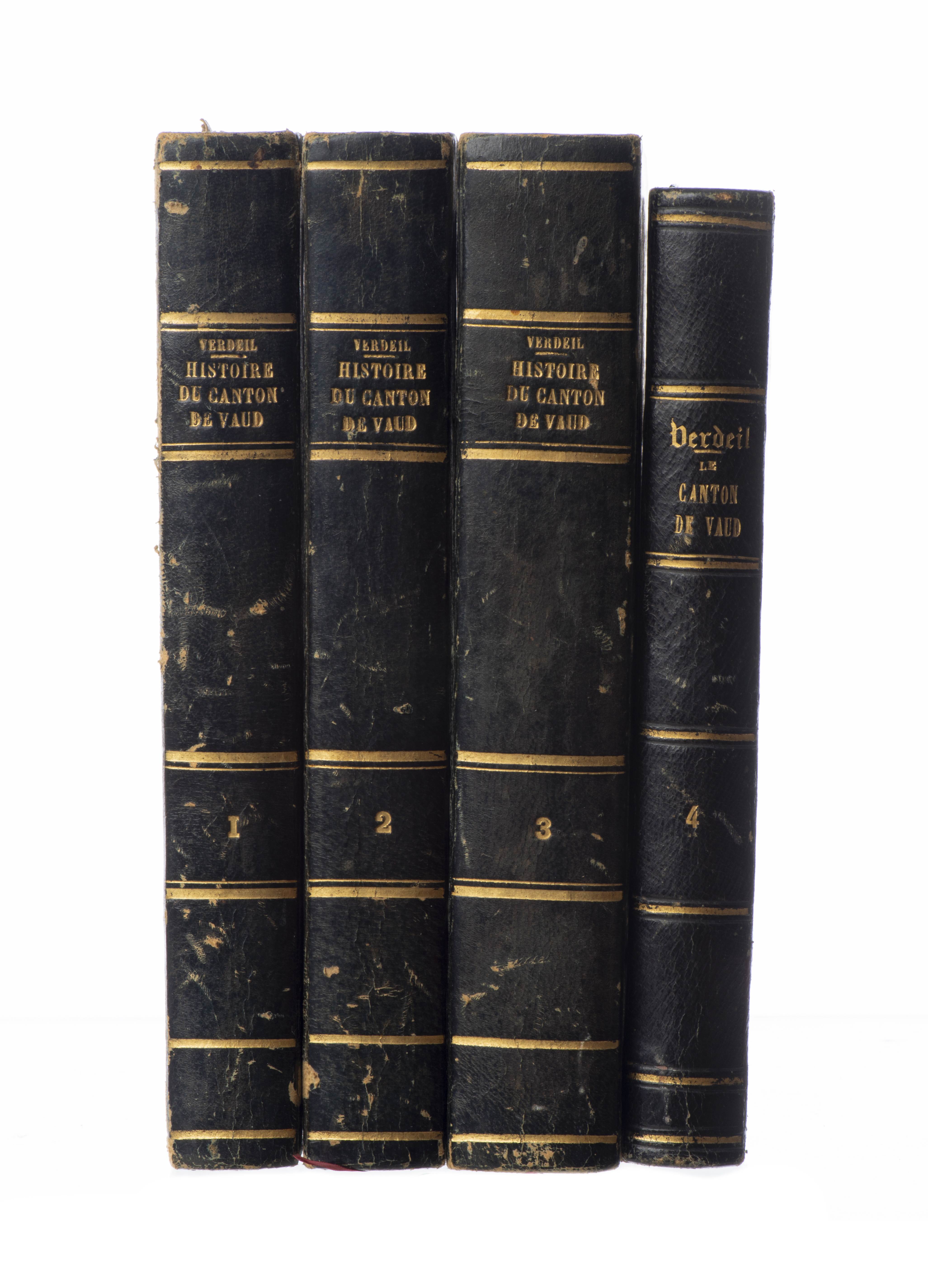 Auguste VERDEIL, "Histoire du Canton de Vaud", en 4 volumes, Lausanne, Martignier, 1849 à 1857, demi-reliure basane noir In-8, charmant exemplaire, Tome 2 contient une carte de bataille datée de 1712.