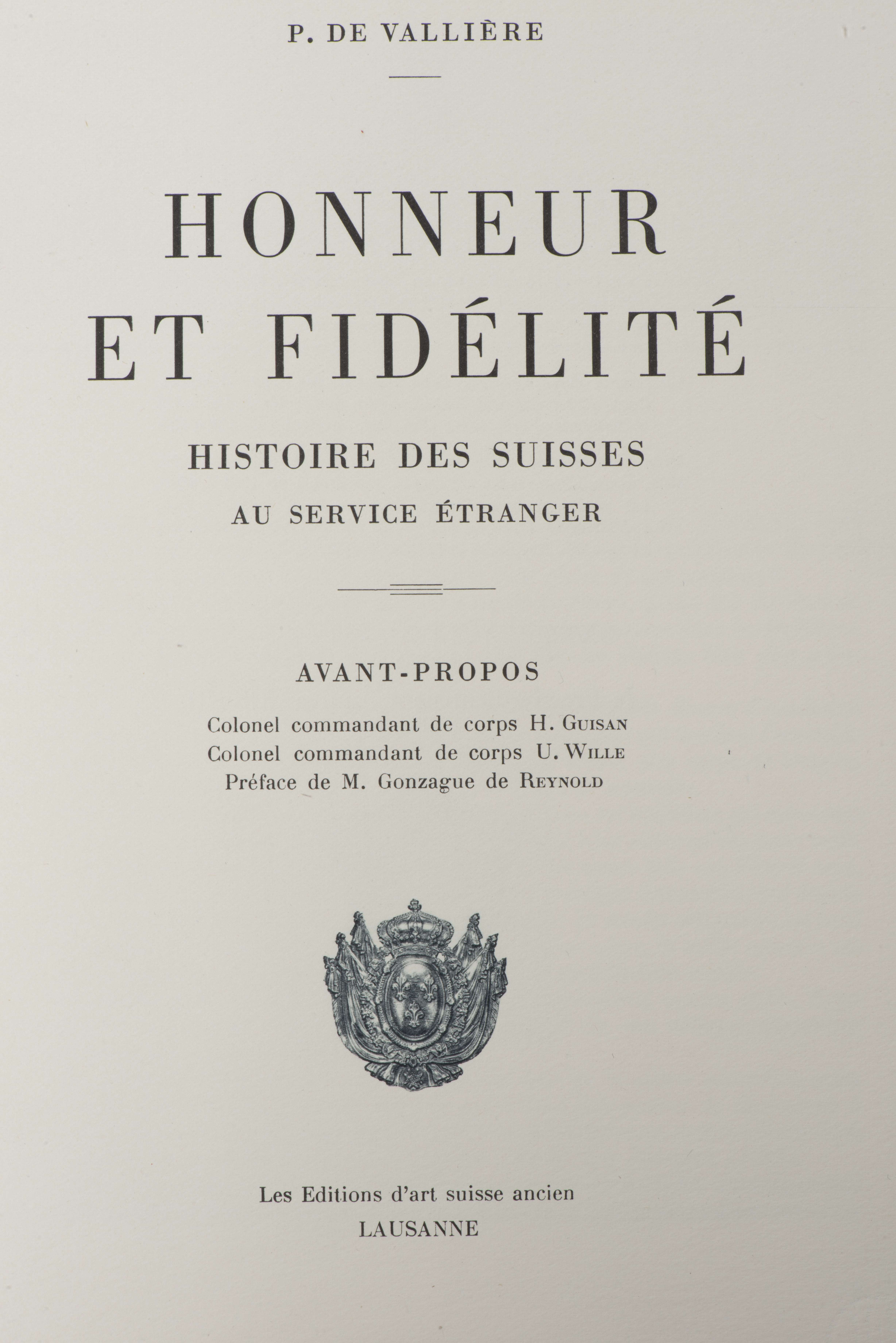 P. DE VALLIÈRE, "Bonheur et Fidélité. Histoire des Suisses au Service des Étrangers", Éditions d'art suisse ancien, Lausanne, 1940, avant-propos Colonel commandant de corps H. Guisan, Colonel commandant de corps U. Wille. Préface de Gonzague de Reynold, richement illustré pardes héliogravures, 2 volumes, reliure demi-chagrin à coins rouge, dos à 5 nerfs, auteur, titre et ornementations dorés au dos, tranche supérieure dorée, sous emboîtage. Exemplaire nominatif et numéroté sur papier d'Arches 239/425.