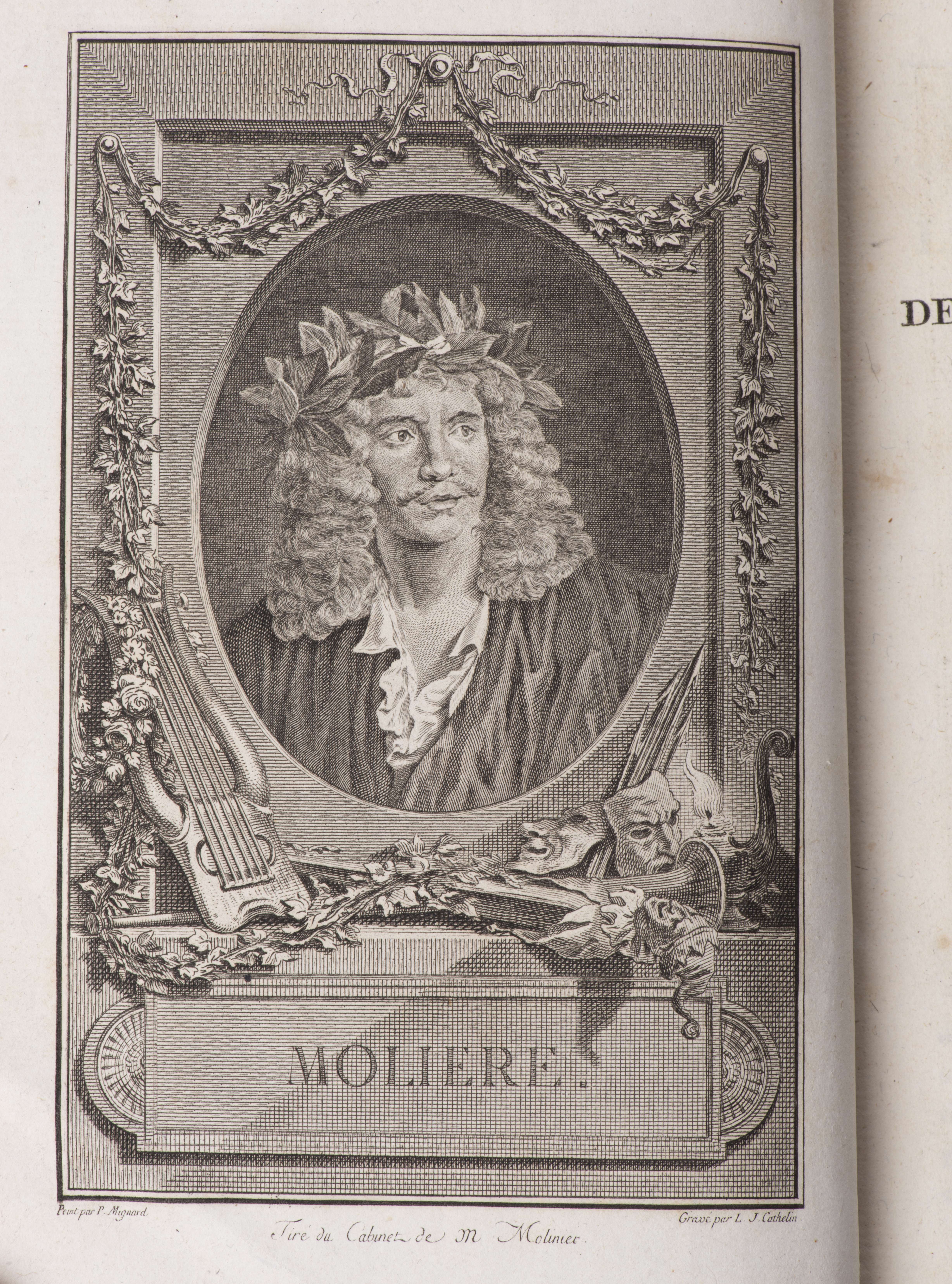 Portrait de MOLIERE gravé par CATHELIN d'après le portrait peint par MIGNARD. 33 planches et 6 vignettes au titre d'après MOREAU LE JEUNE gravées par BAQUOY, de LAUNEY, DUCLOS, de GHENDT, HELMAN, LEBAS, LEGRAND, LEVEAU, MASQUELIER, NEE, SIMONET et une par MOREAU lui-même. Bandeaux et culs-de-lampe.