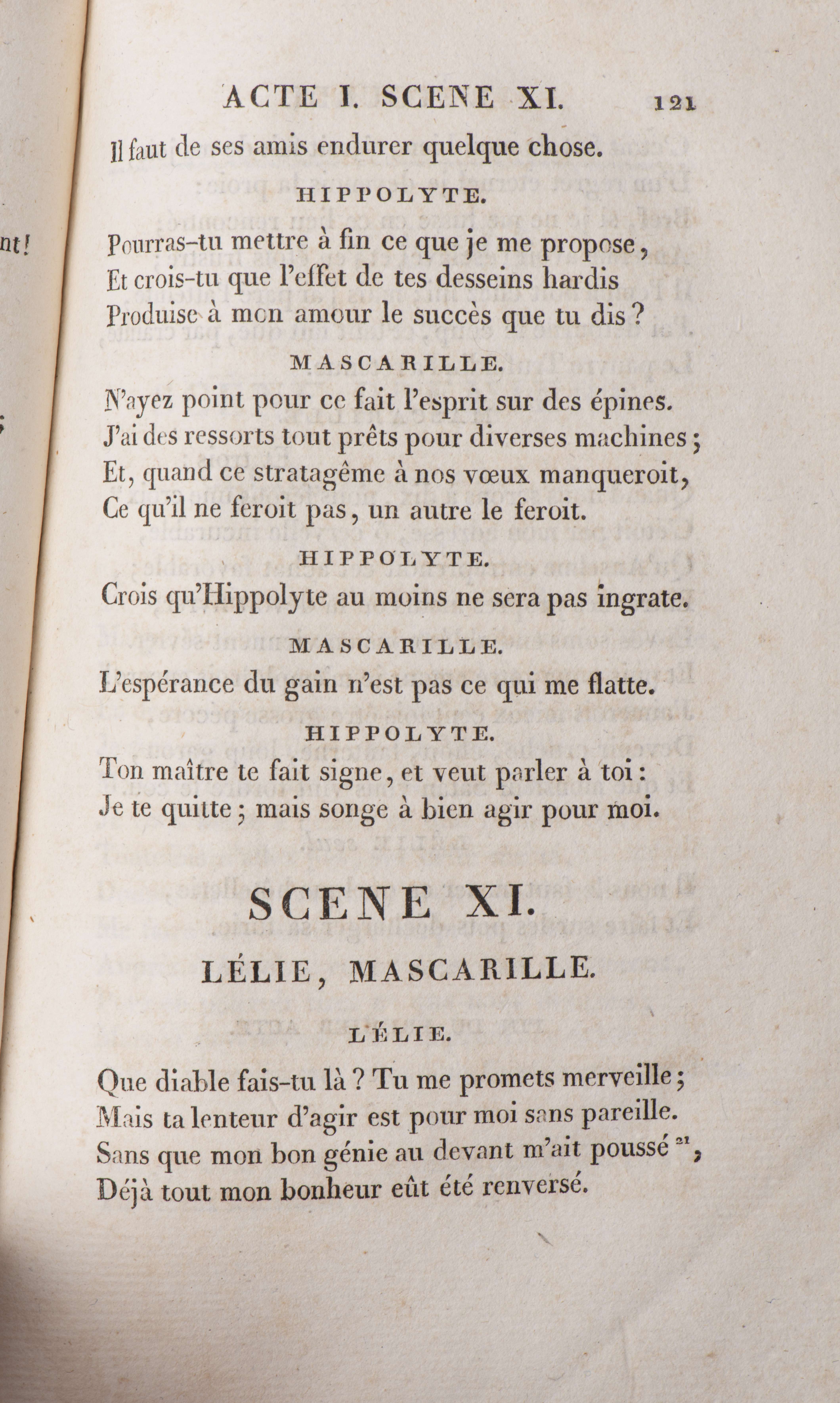 Œuvres de MOLIÈRE avec des remarques grammaticales, des avertissements et des observations sur chaque pièce par M. Bret, Compagnie des Libraires Associés, Paris, 1804, reliure de l'époque pleine basane blonde racinée, dos lisses, caissons ornés, pièces de titre et de tomaison, roulettes et dentelles sur les plats.
