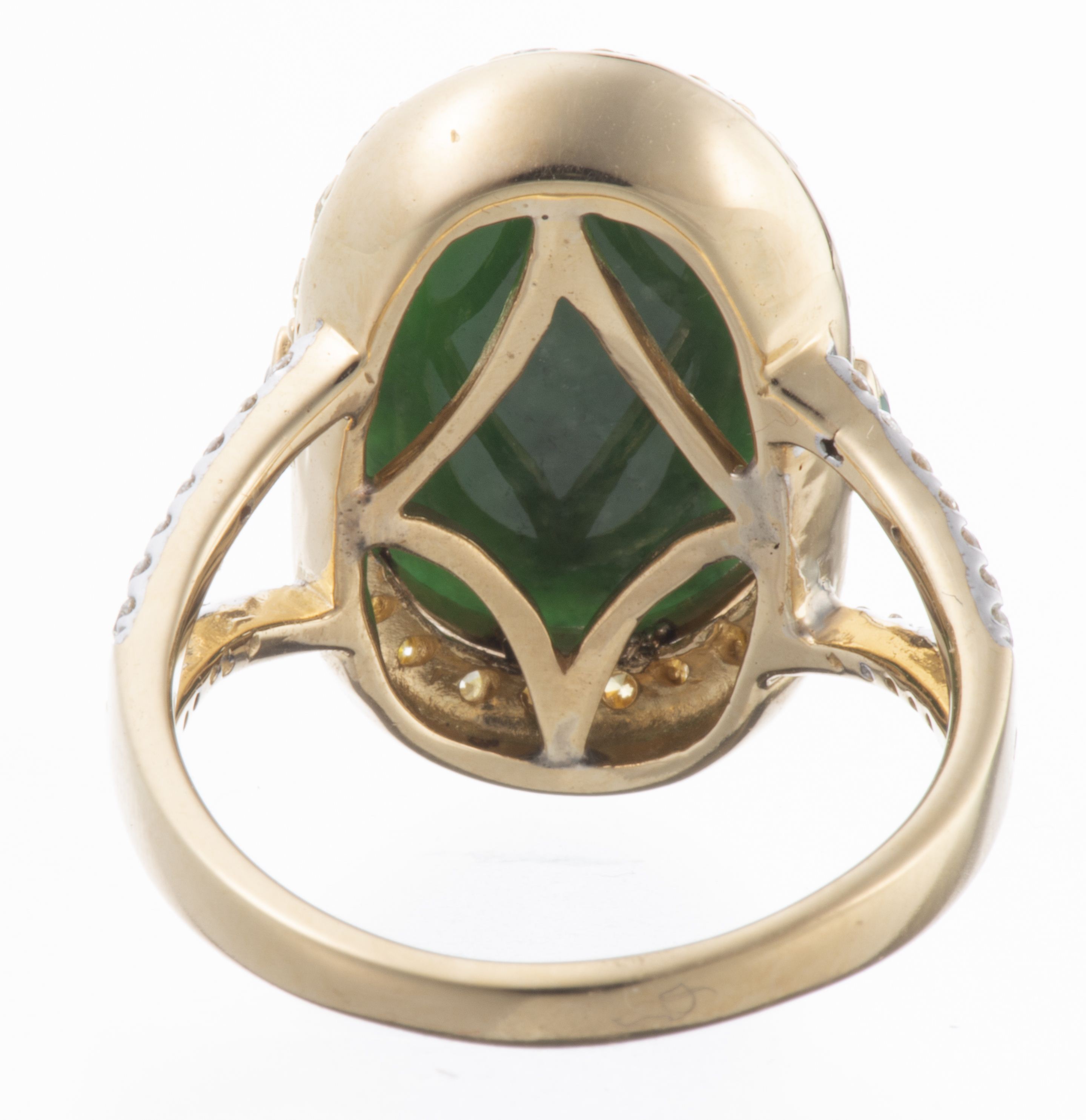 Diana CARMICHAEL, Bague en or jaune et or gris .750 avec une jadéïte cabochon Type A de 8.28 cts entourée de 2 émeraudes avec monture sertie de diamants blancs pour 0.28 ct et de diamants jaunes pour 0.50 ct.