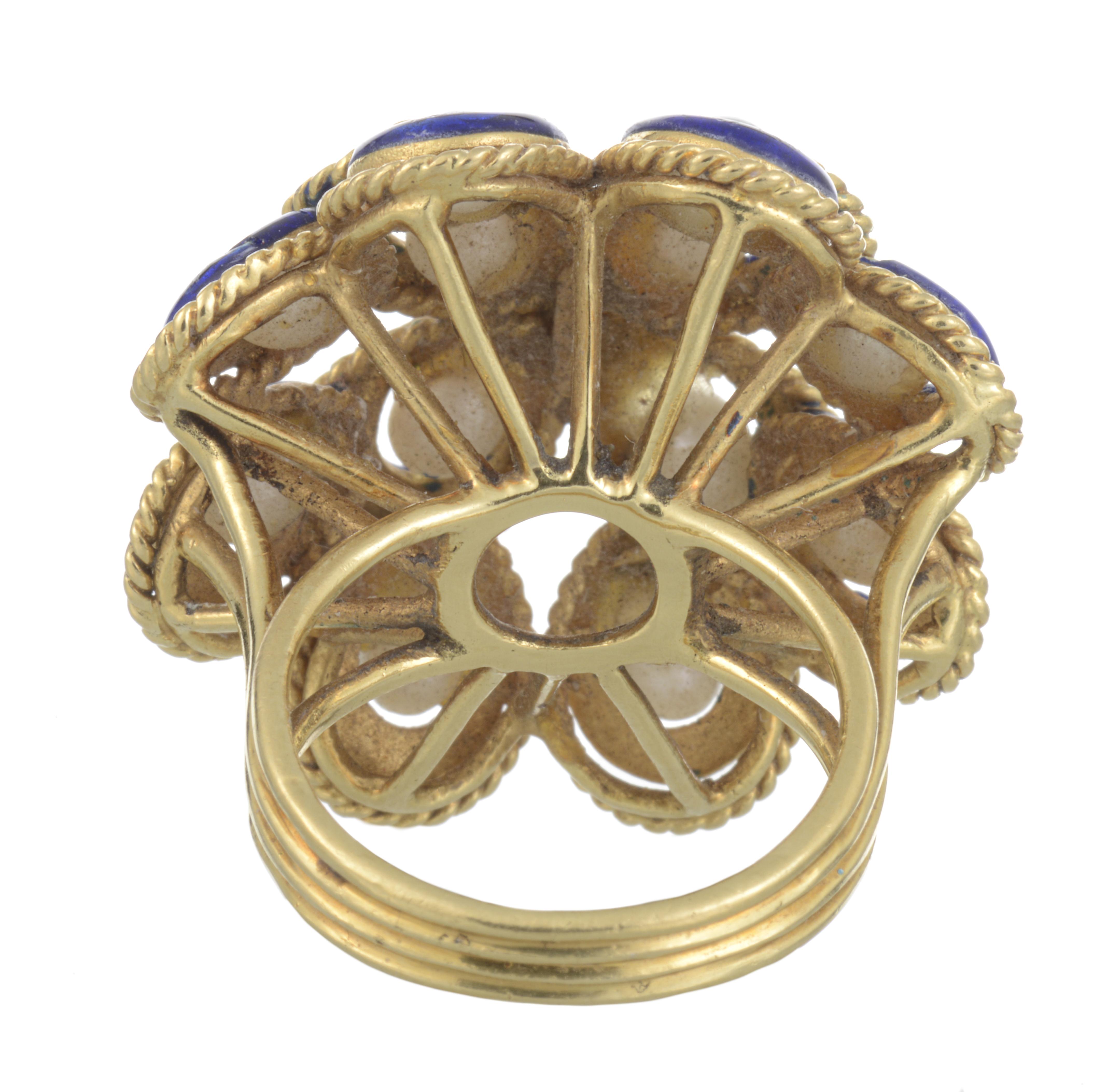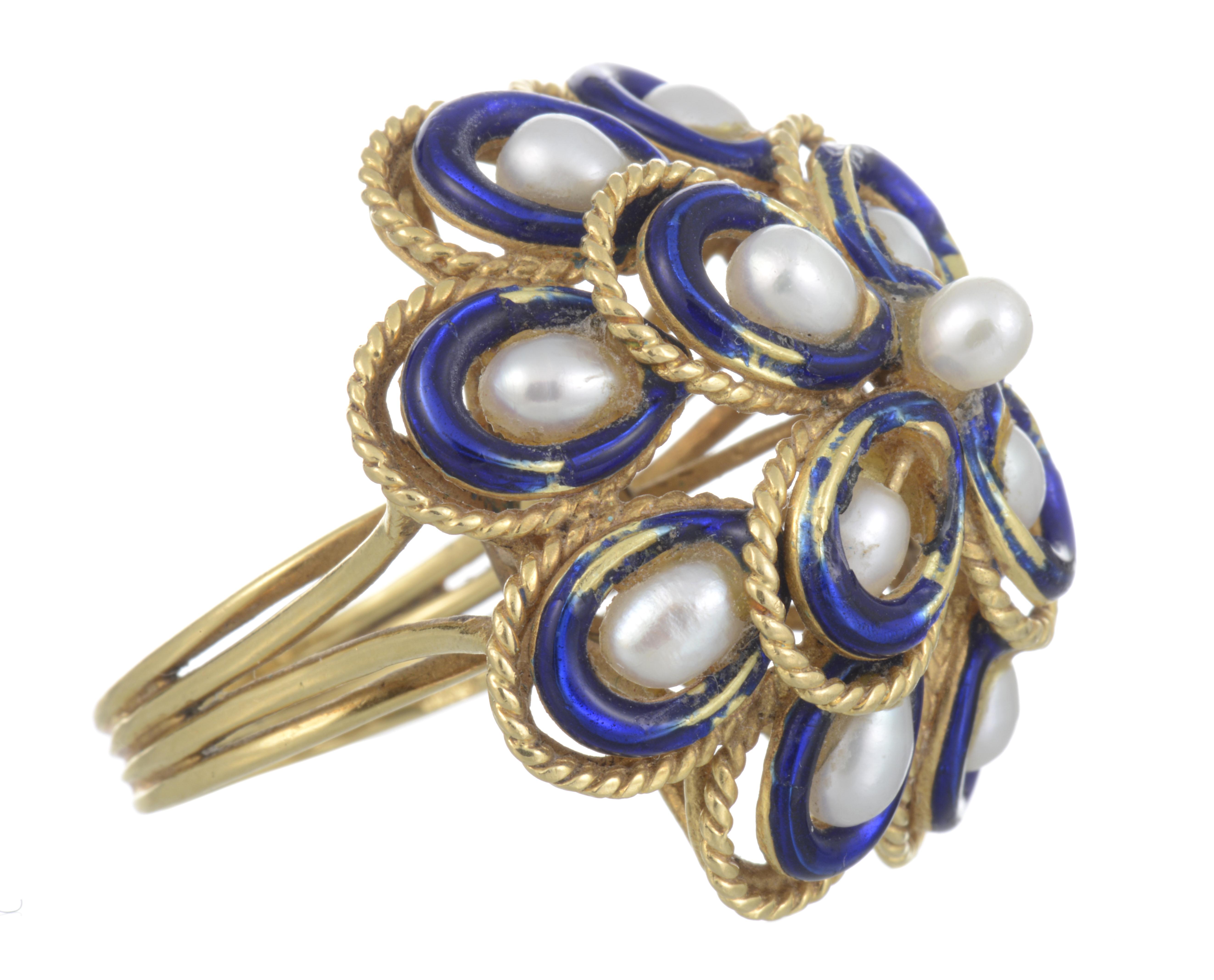Bague fleur en or jaune .750 montée de 13 perles dans des pétales à cerclage d'émail bleu.