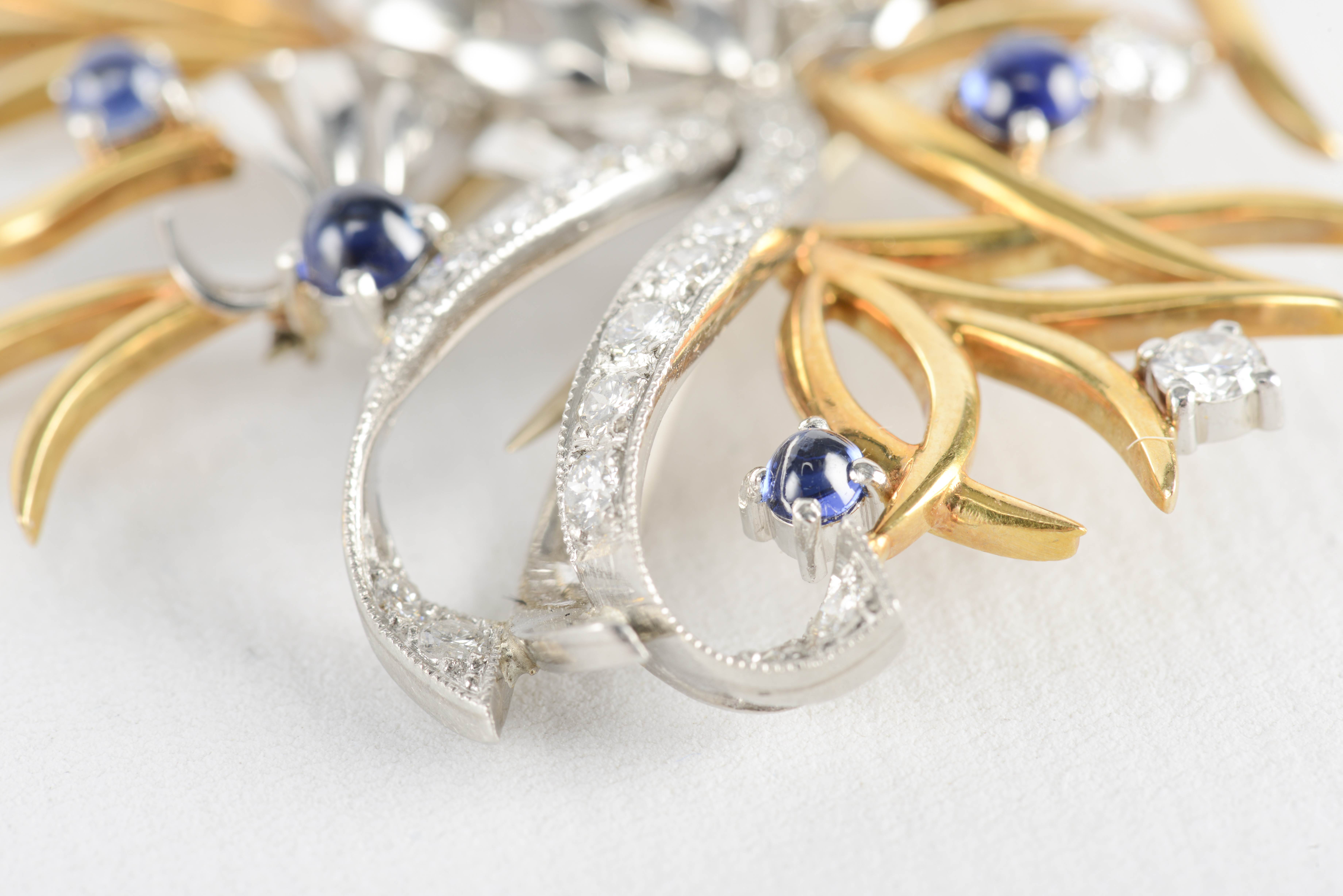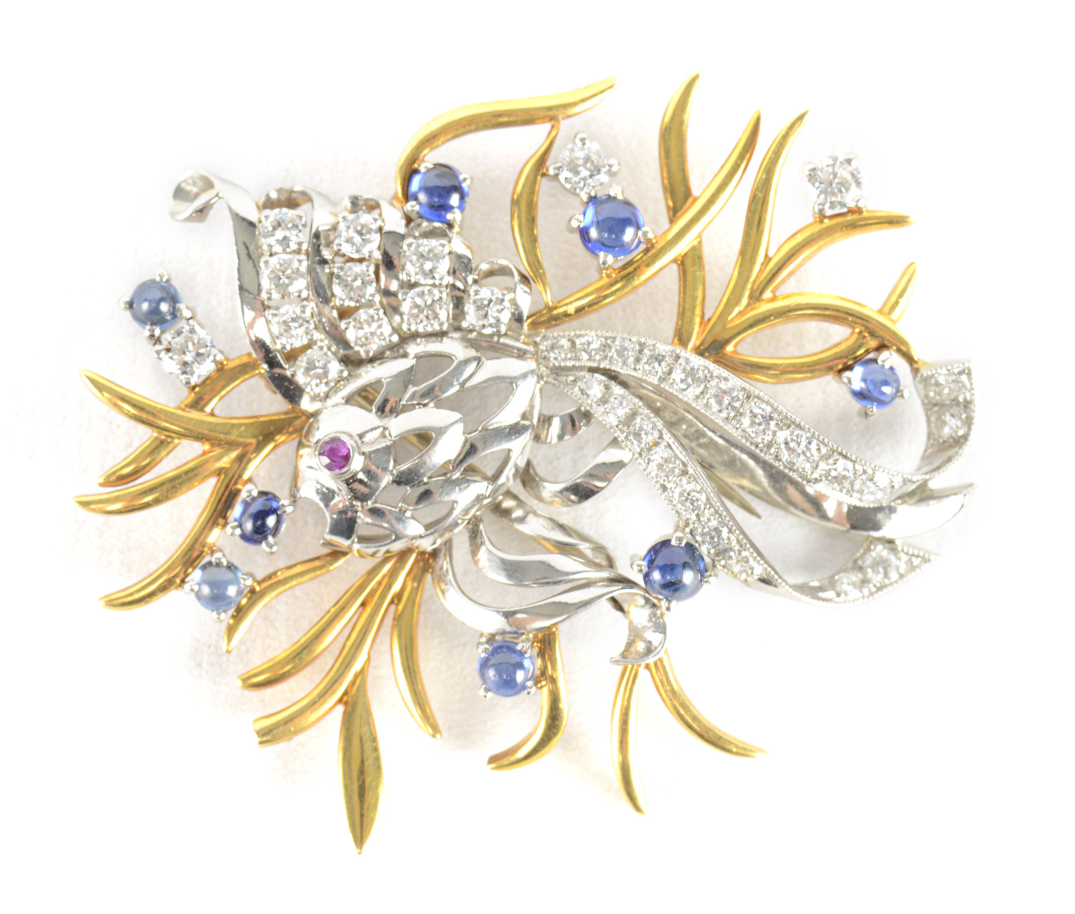 Broche poisson en or jaune et or blanc .750 avec un œil en rubis taillé pour env. 0.03 ct, huit saphirs cabochon pour env. 0.40 ct et 34 diamants pour un total de env. 0.80 ct.