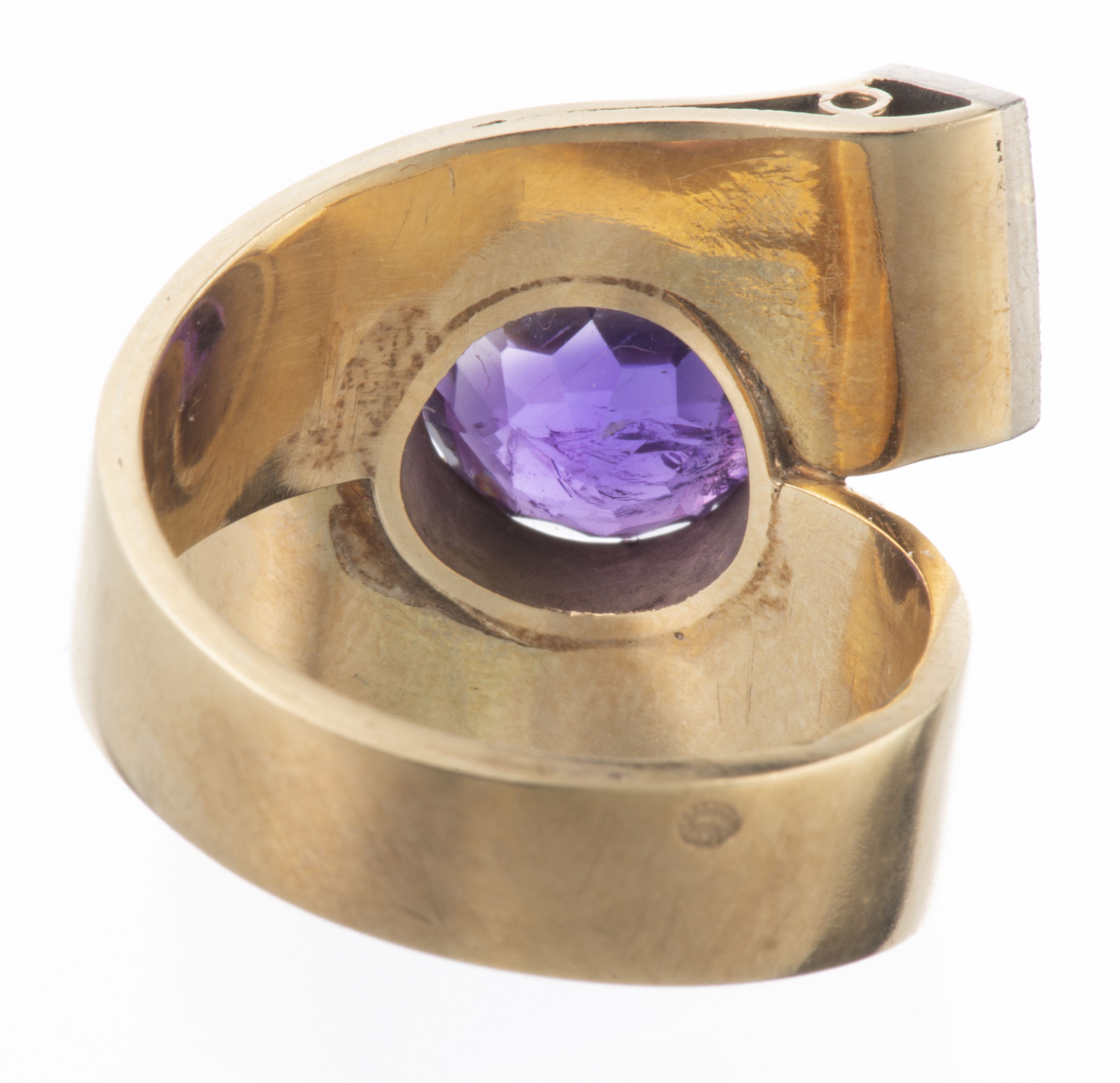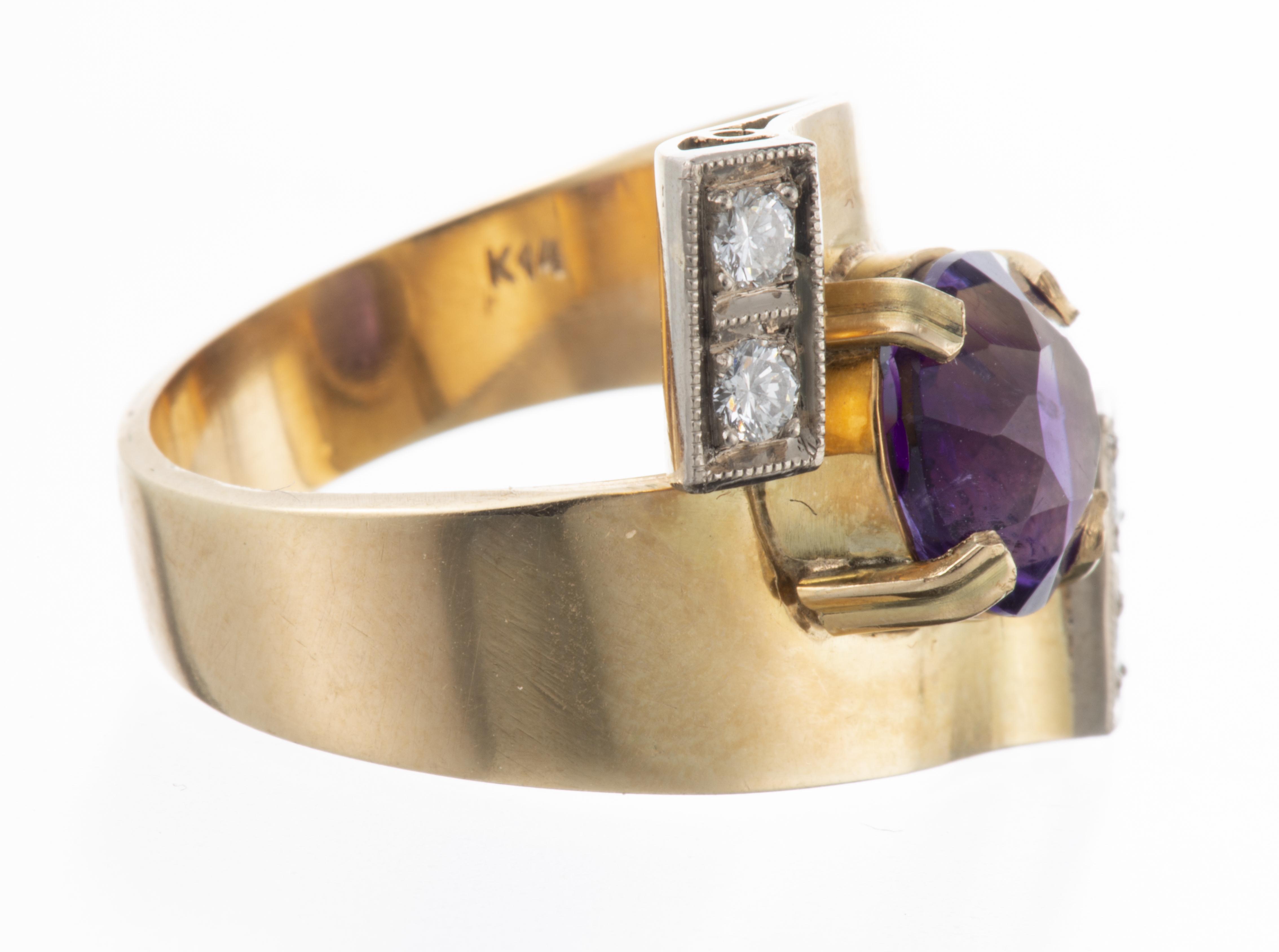 Bague ruban en or jaune .585 des années 1940 avec une améthyste de 2.30 cts sertie à griffes au centre et 4 diamants d'un poids total de 0.20 ct