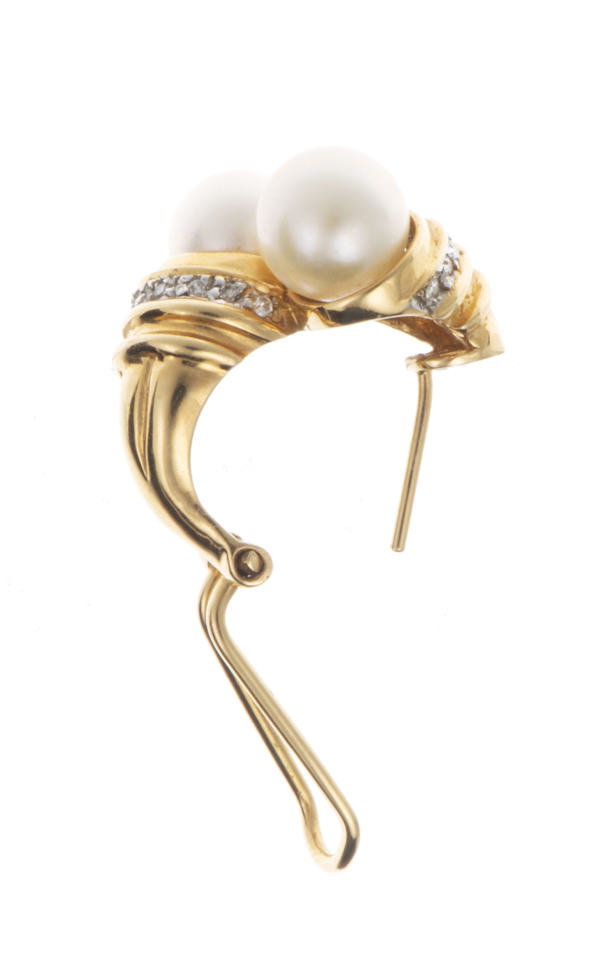 Paire de boucles d'oreilles en or jaune .750 avec 4 perles de 7.5 mm et 30 diamants 8/8 pour un total de 0.20 ct.