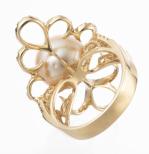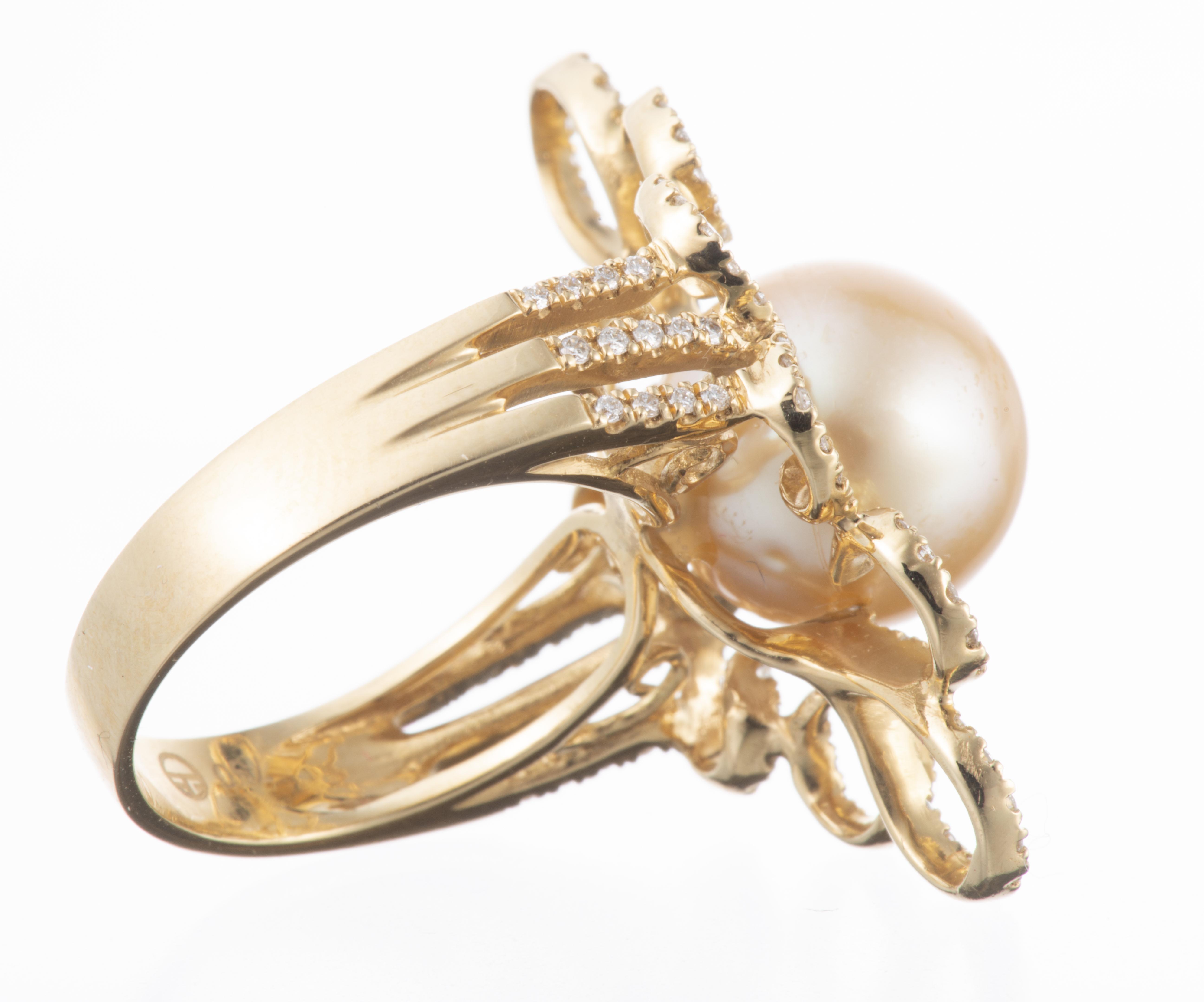 Bague en or jaune avec une perle des Mers du Sud dorée et dentelle de diamants