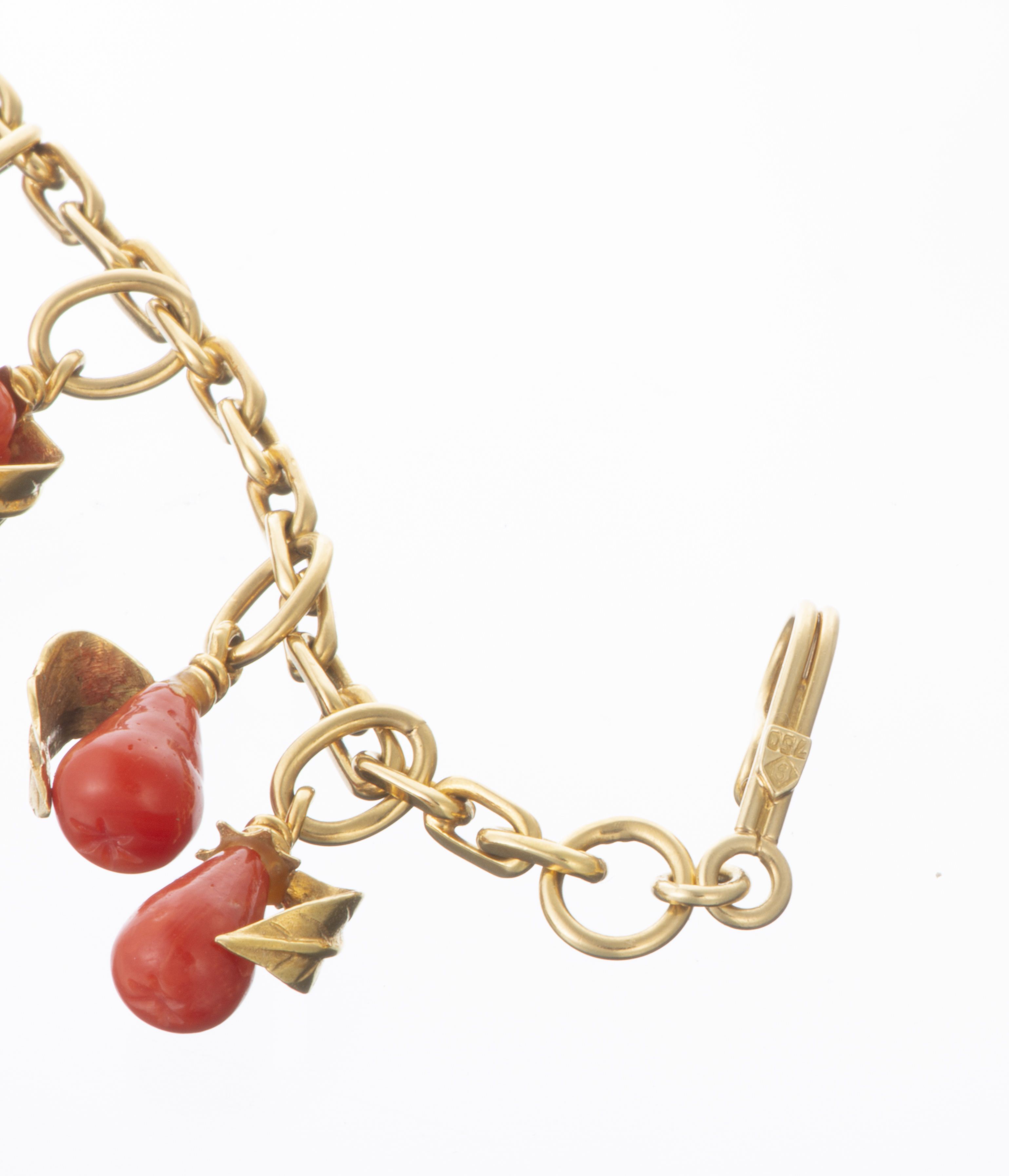 Bracelet en or jaune .750 et breloques corail en forme de fruits.