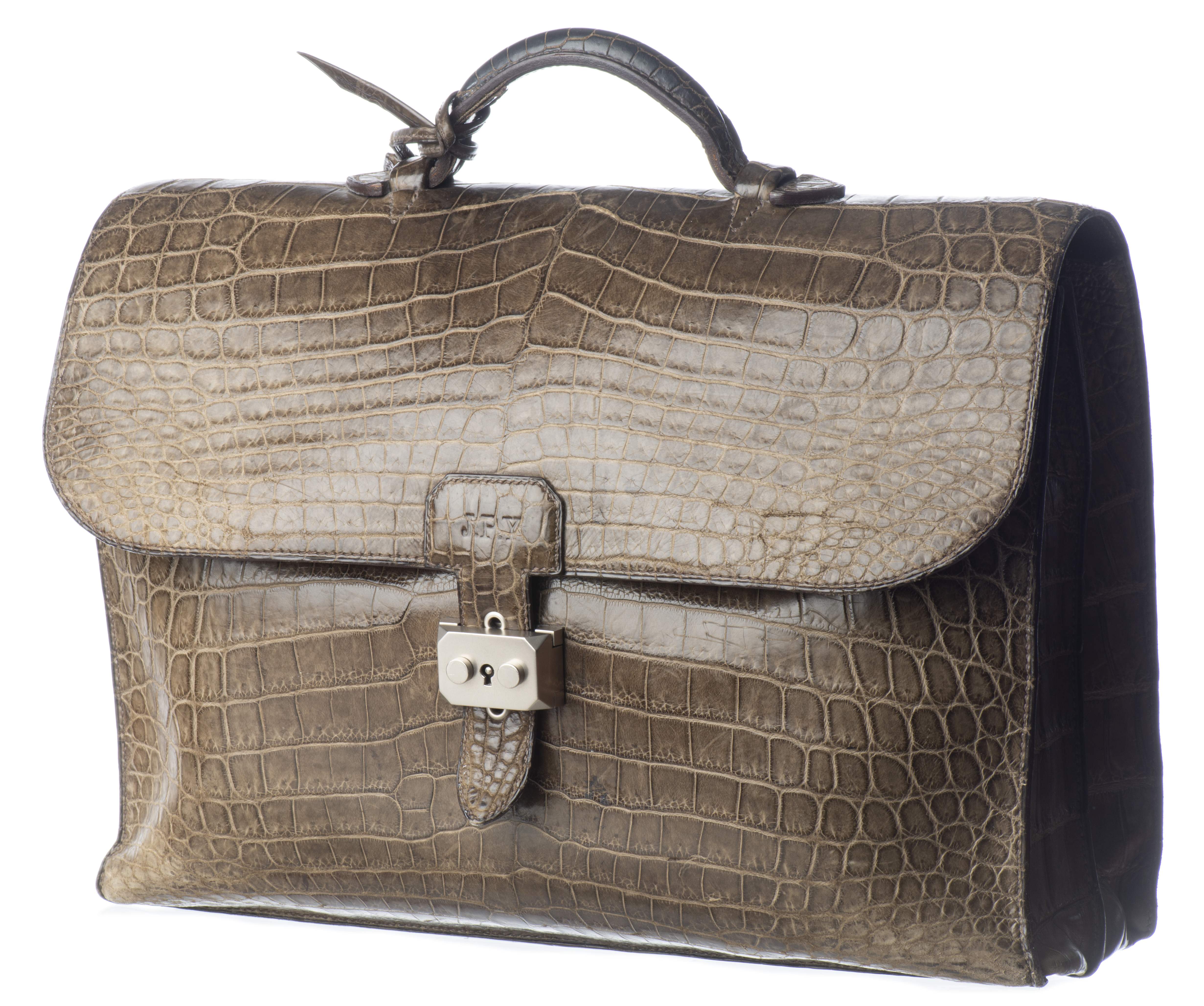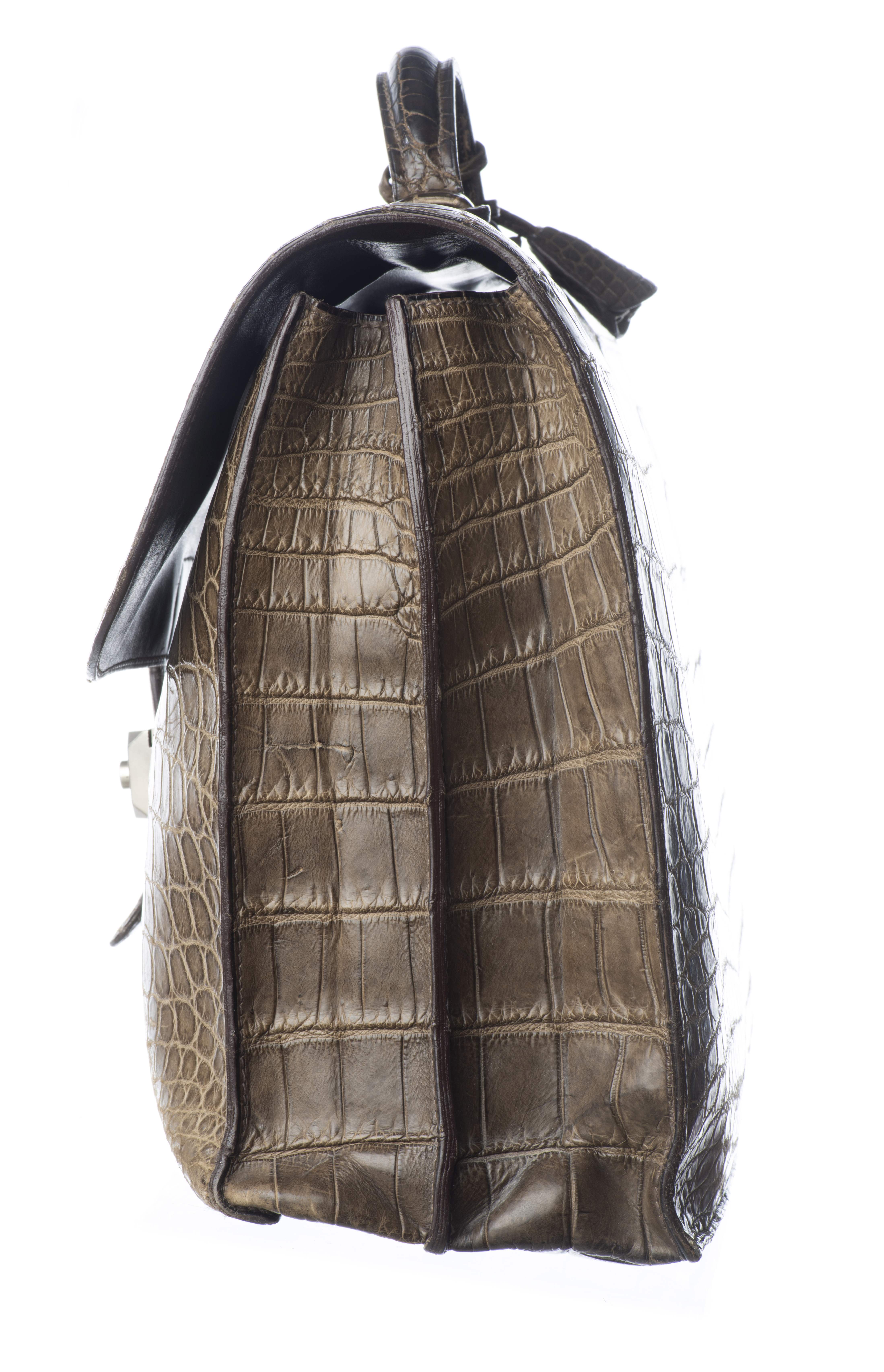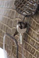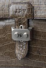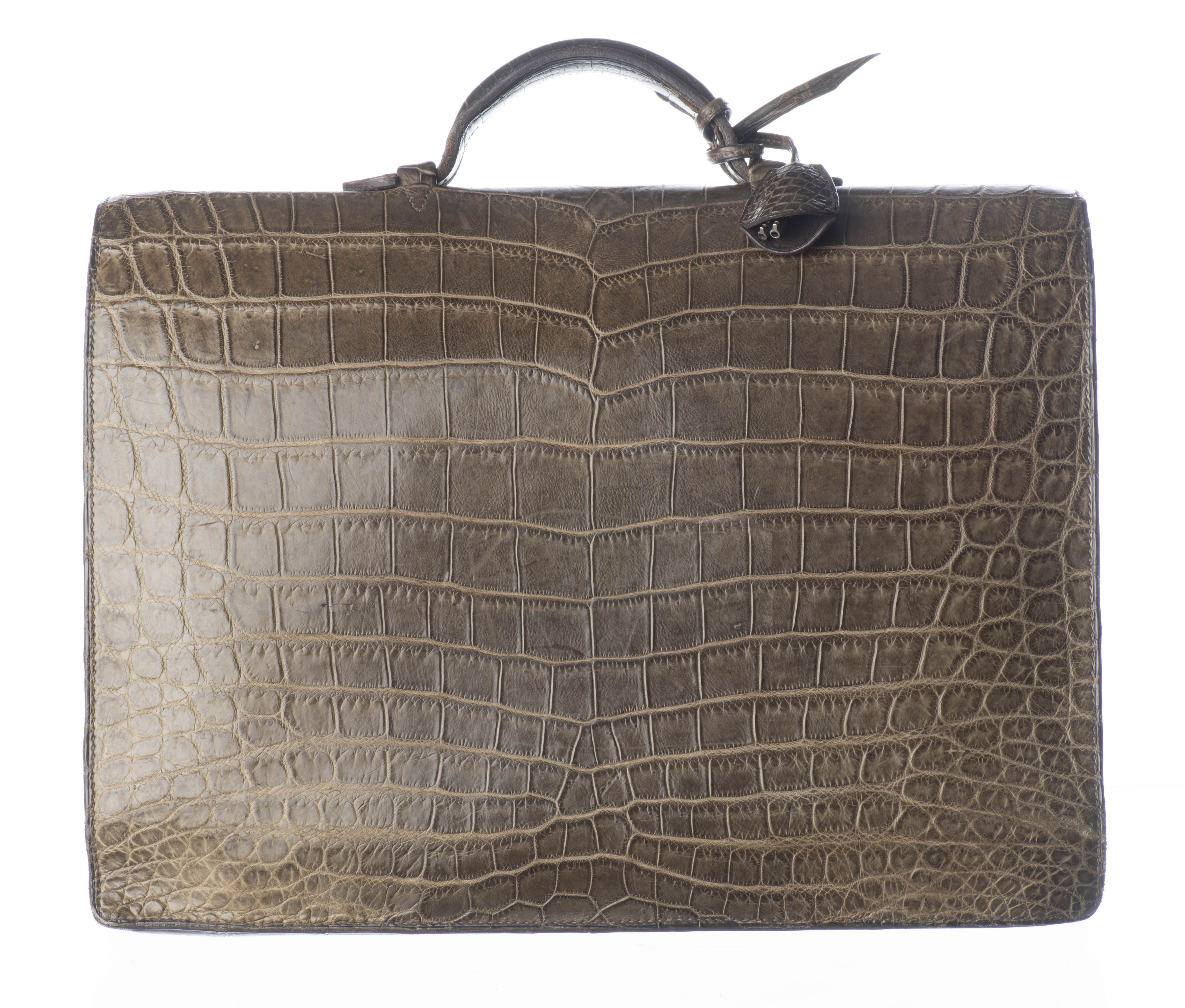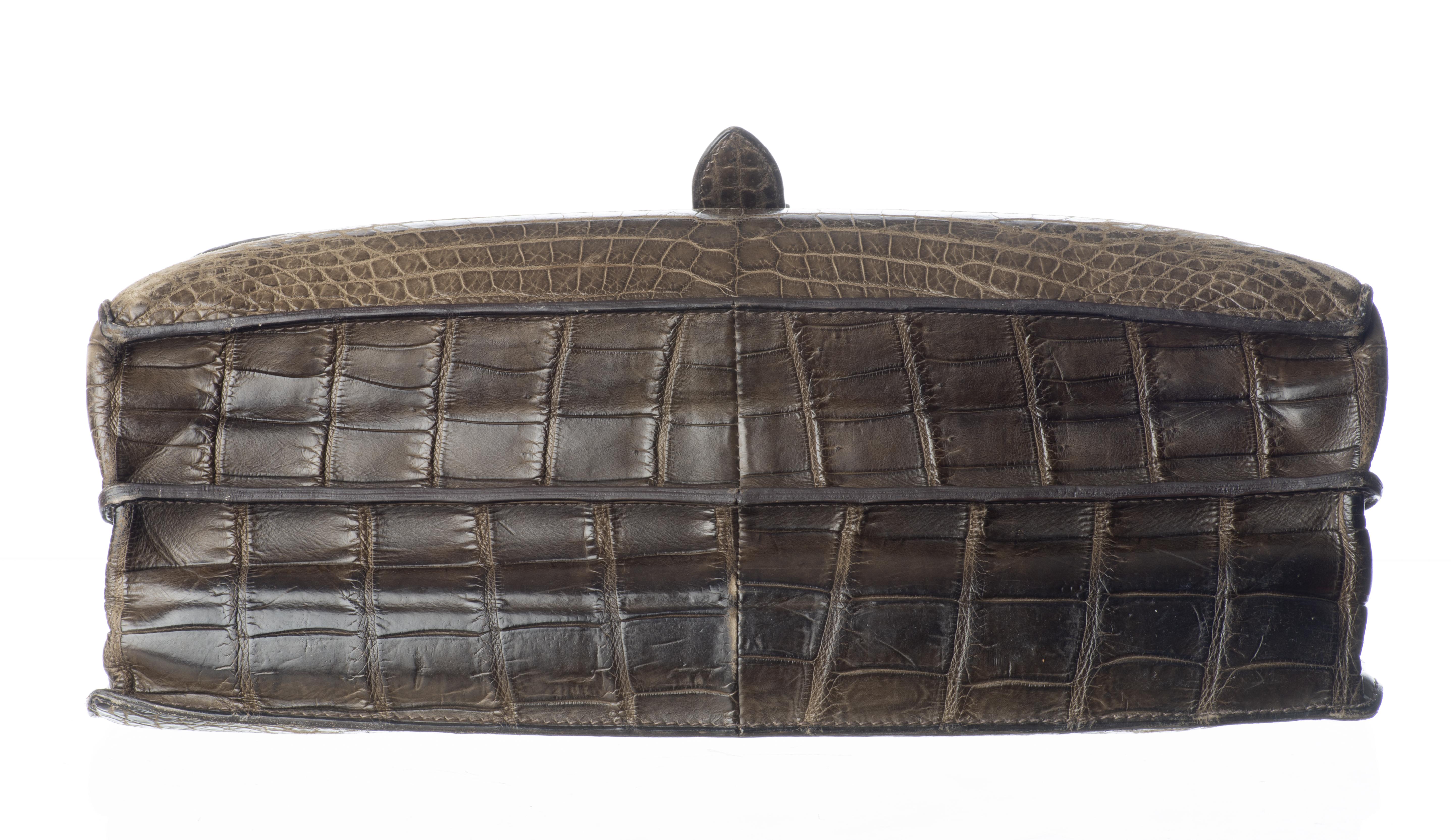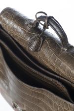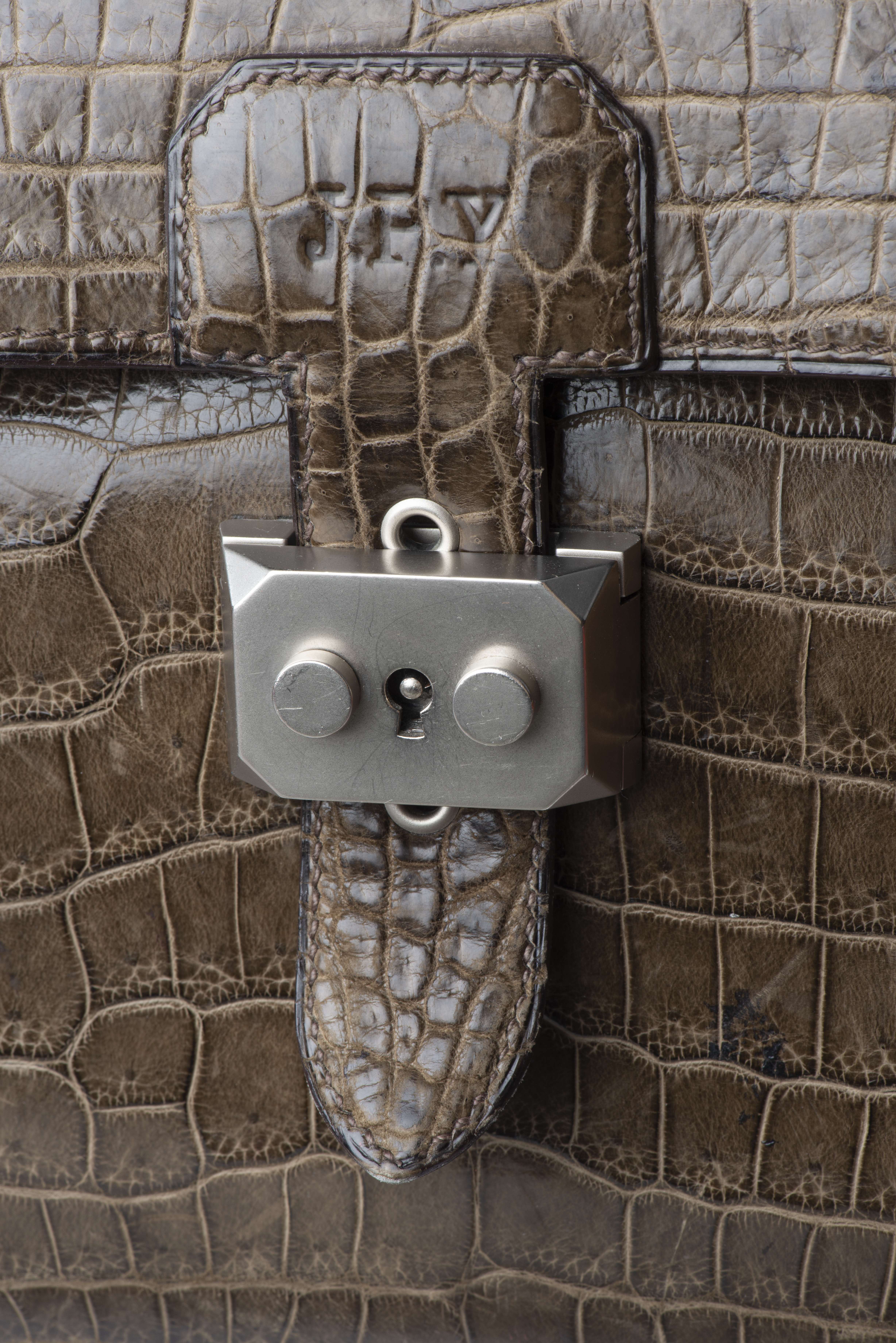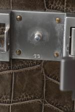 Mallette en croco couleur taupe à trois compartiments, fermeture en métal à clé, intérieur en cuir, deux clés fournies.