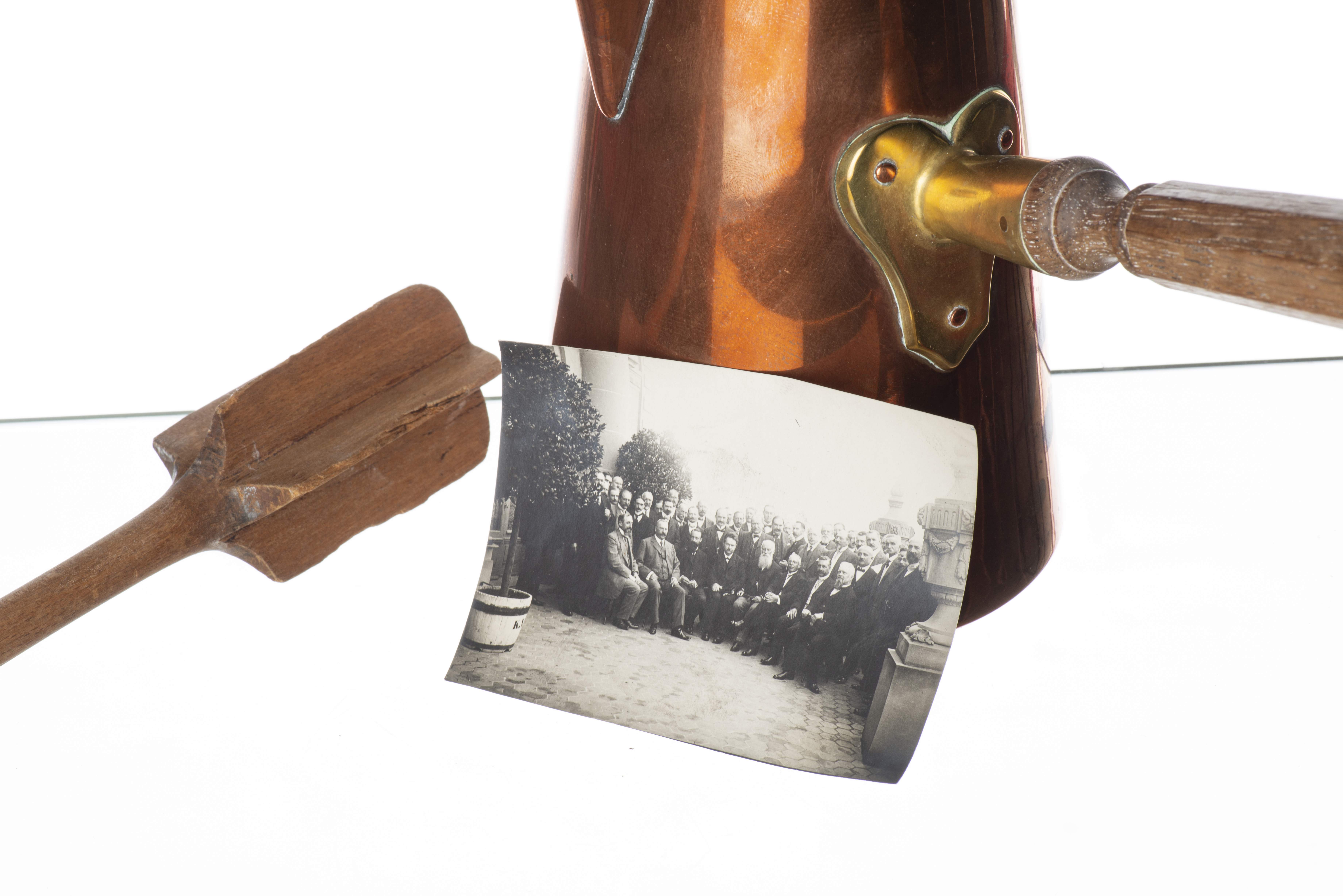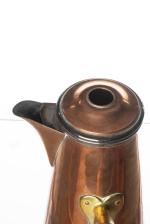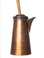 Peter CAILLER KOHLER, Chocolatière en cuivre et batteur en bois.