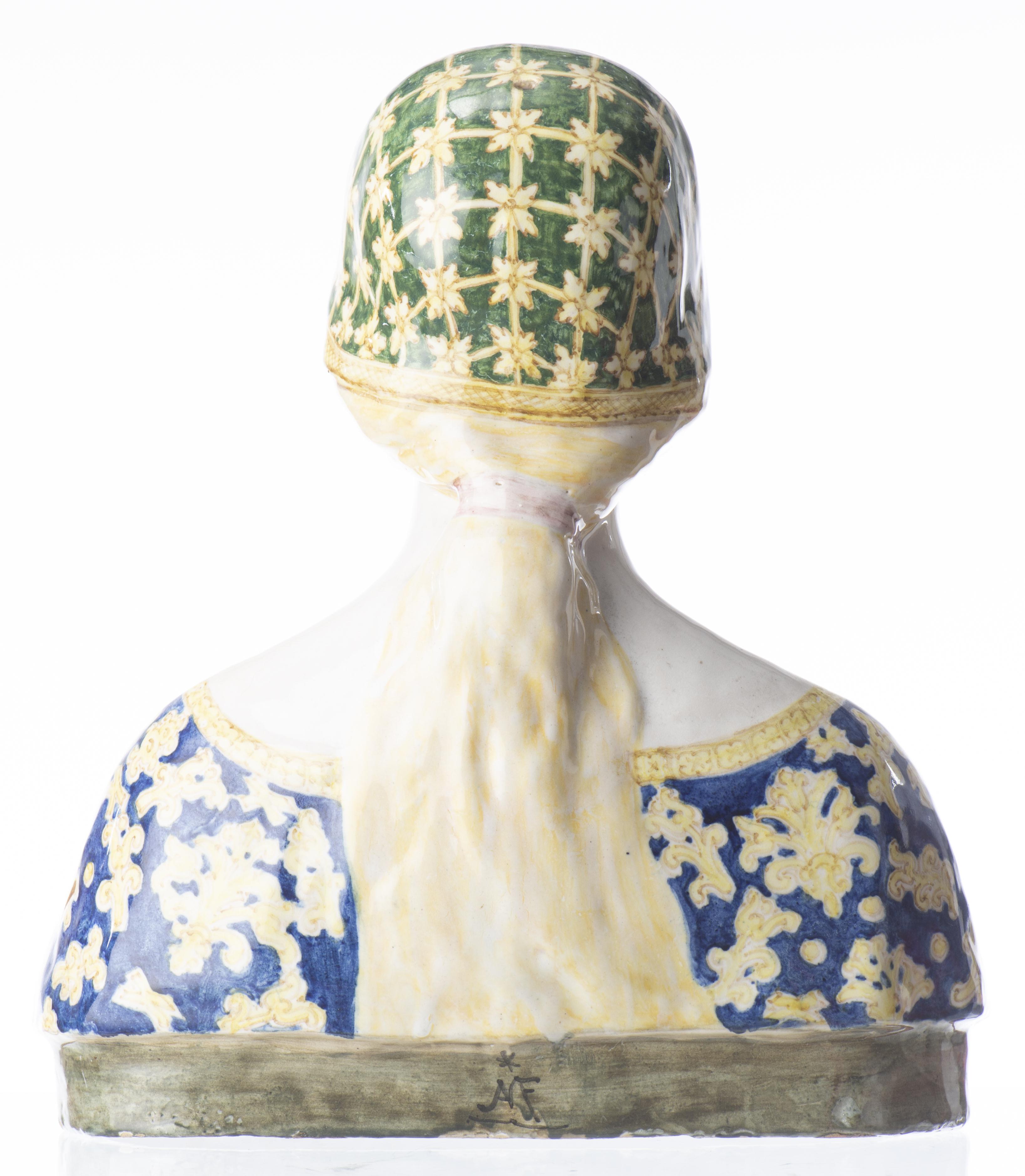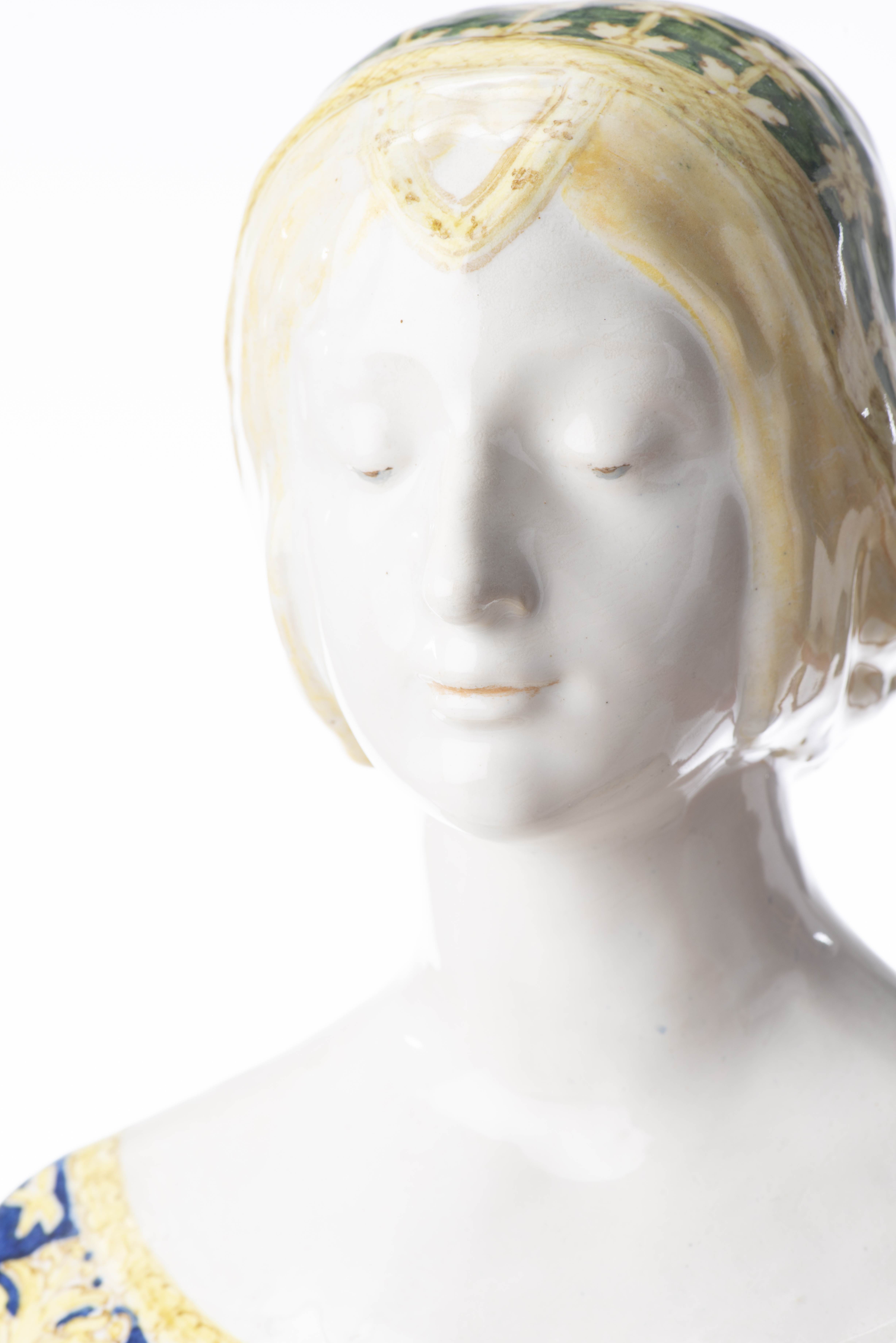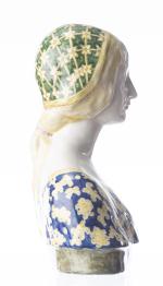 Angelo MINGHETTI (1822-1885), manufacture de, Bologne, buste en faïence émaillée polychrome représentant Laura, la muse bien-aimée du poète Pétrarque, marqué AMF au dos.