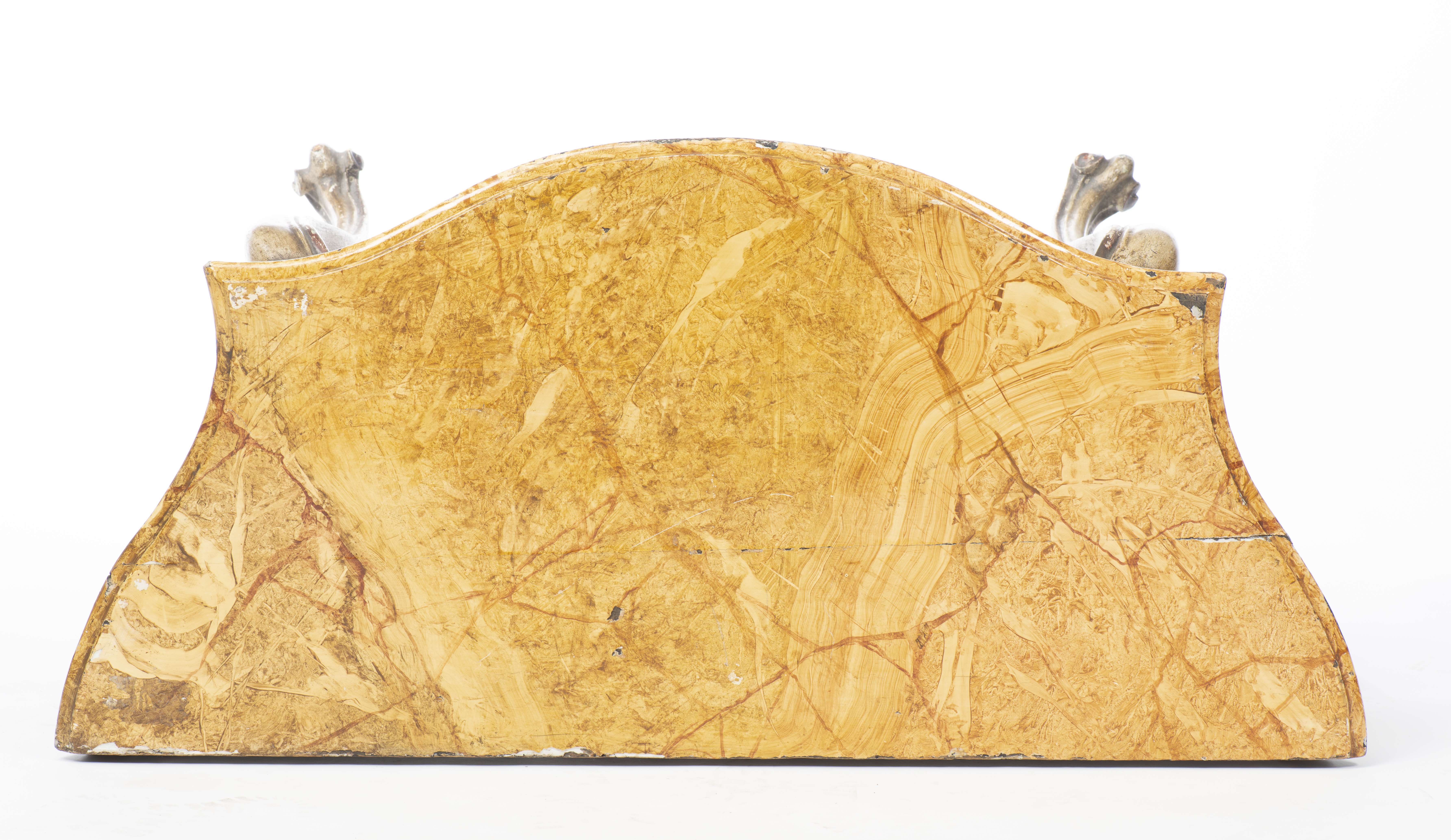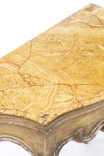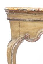Console vénitienne du XVIIIe en bois sculpté et peint, plateau trompe-l'œil imitant le marbre jaune.