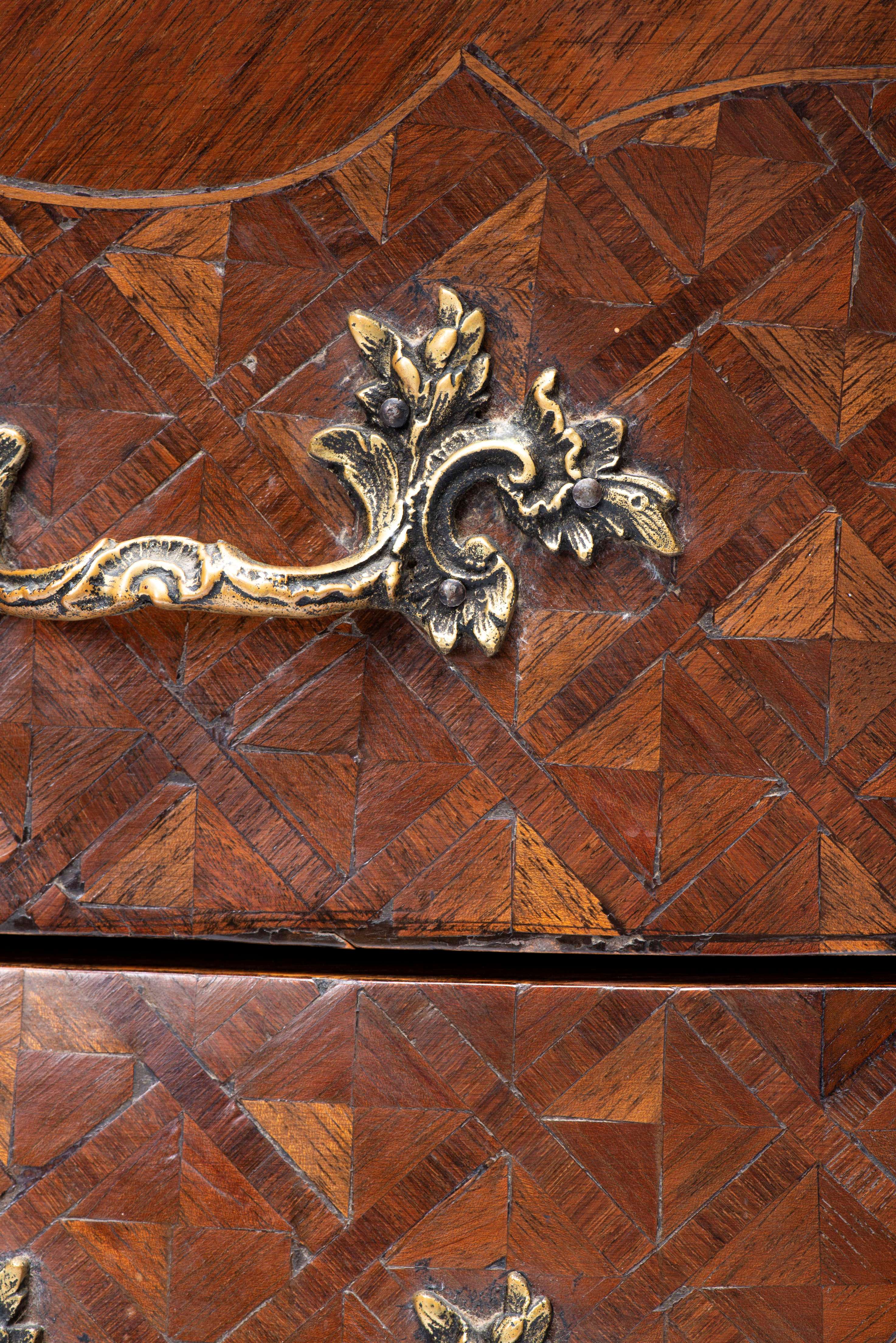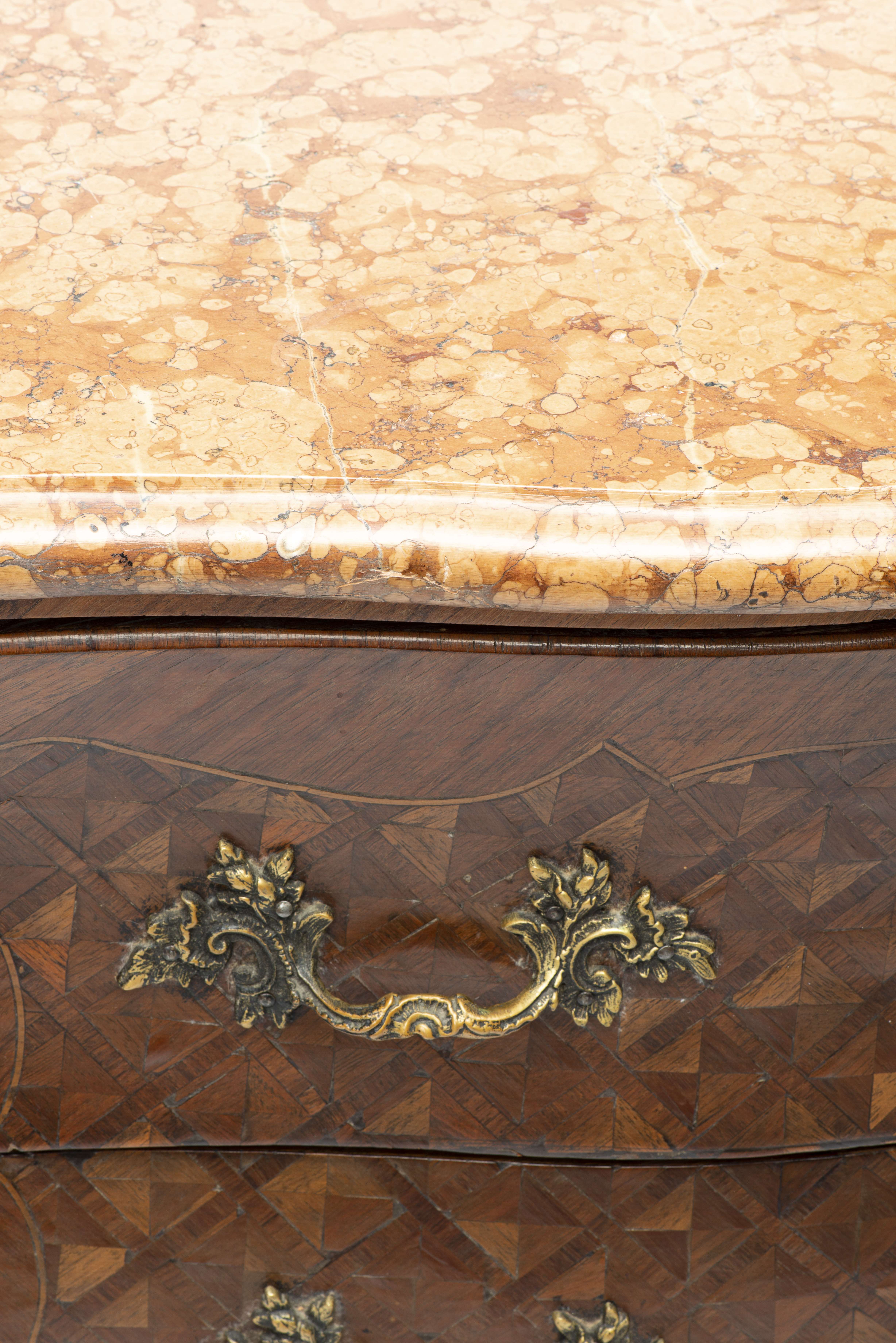 Commode Louis XV galbée en bois de placage à marqueterie de losanges, garnitures des pieds sabots avant, poignées et chutes des montants en bronze doré, dessus de marbre rose.