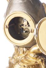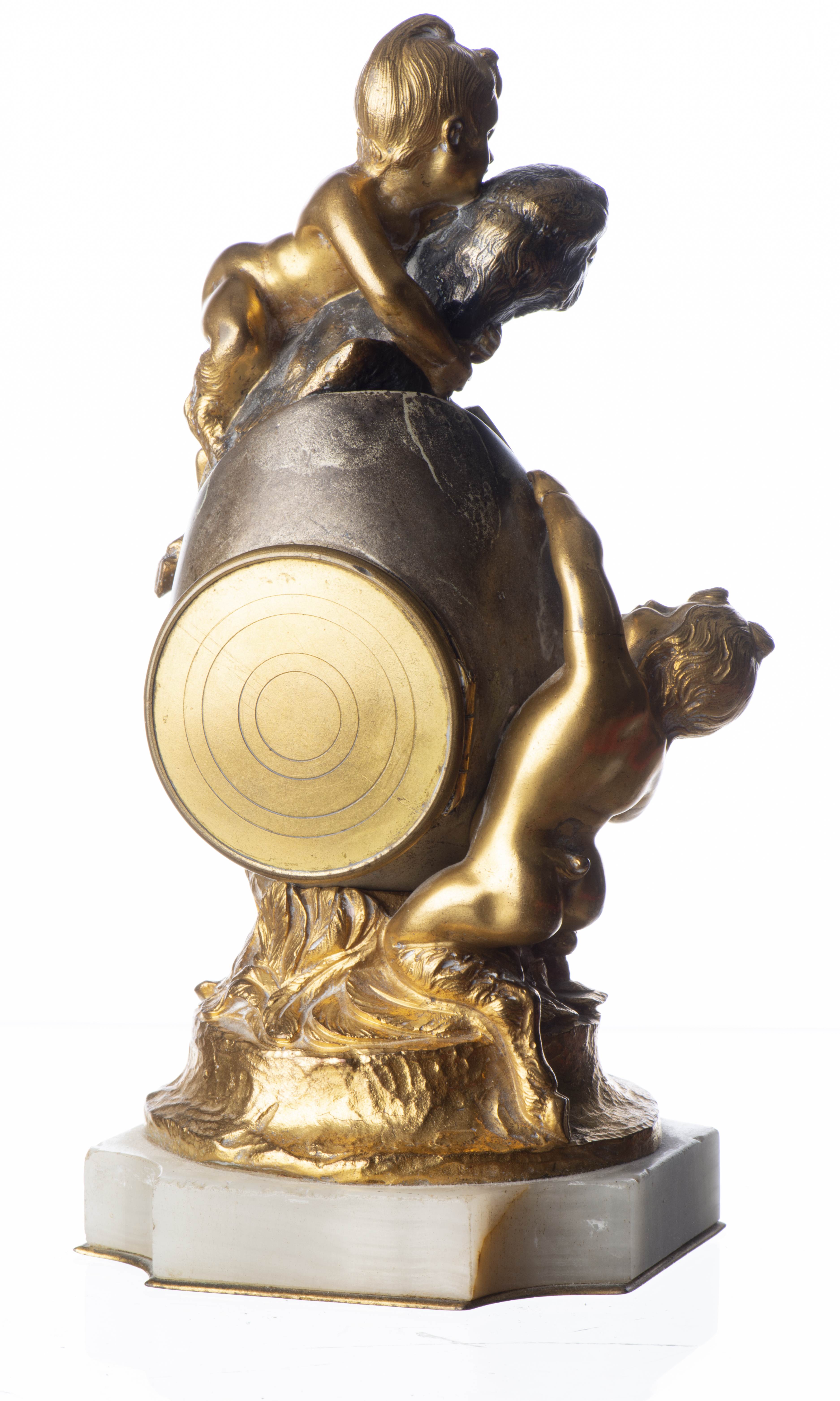 Travail Art nouveau, pendulette "oeuf et faunes" en bronze figurant un oisillon sortant de l'œuf et deux faunes, patine médaille et or.