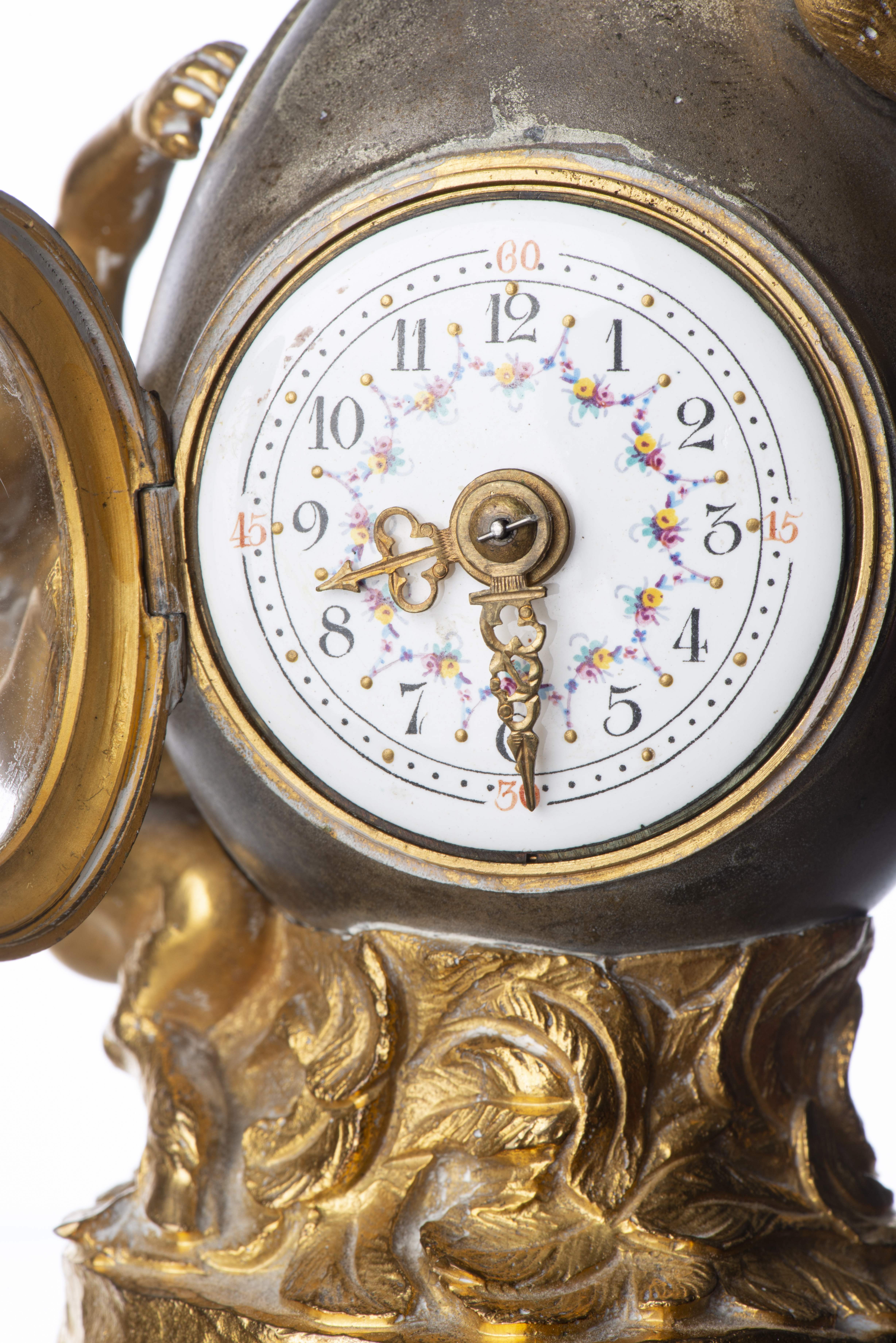 Travail Art nouveau, pendulette "oeuf et faunes" en bronze