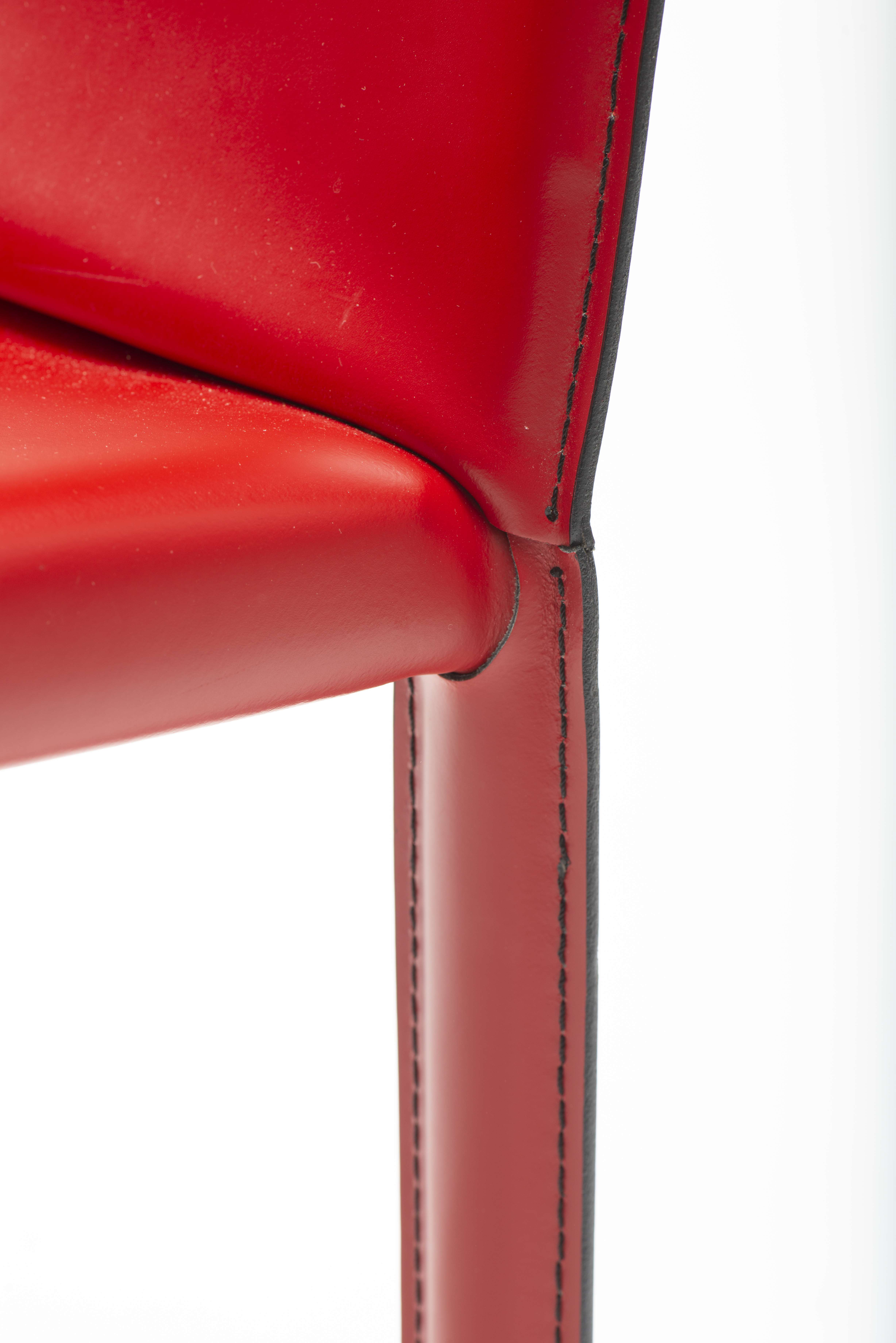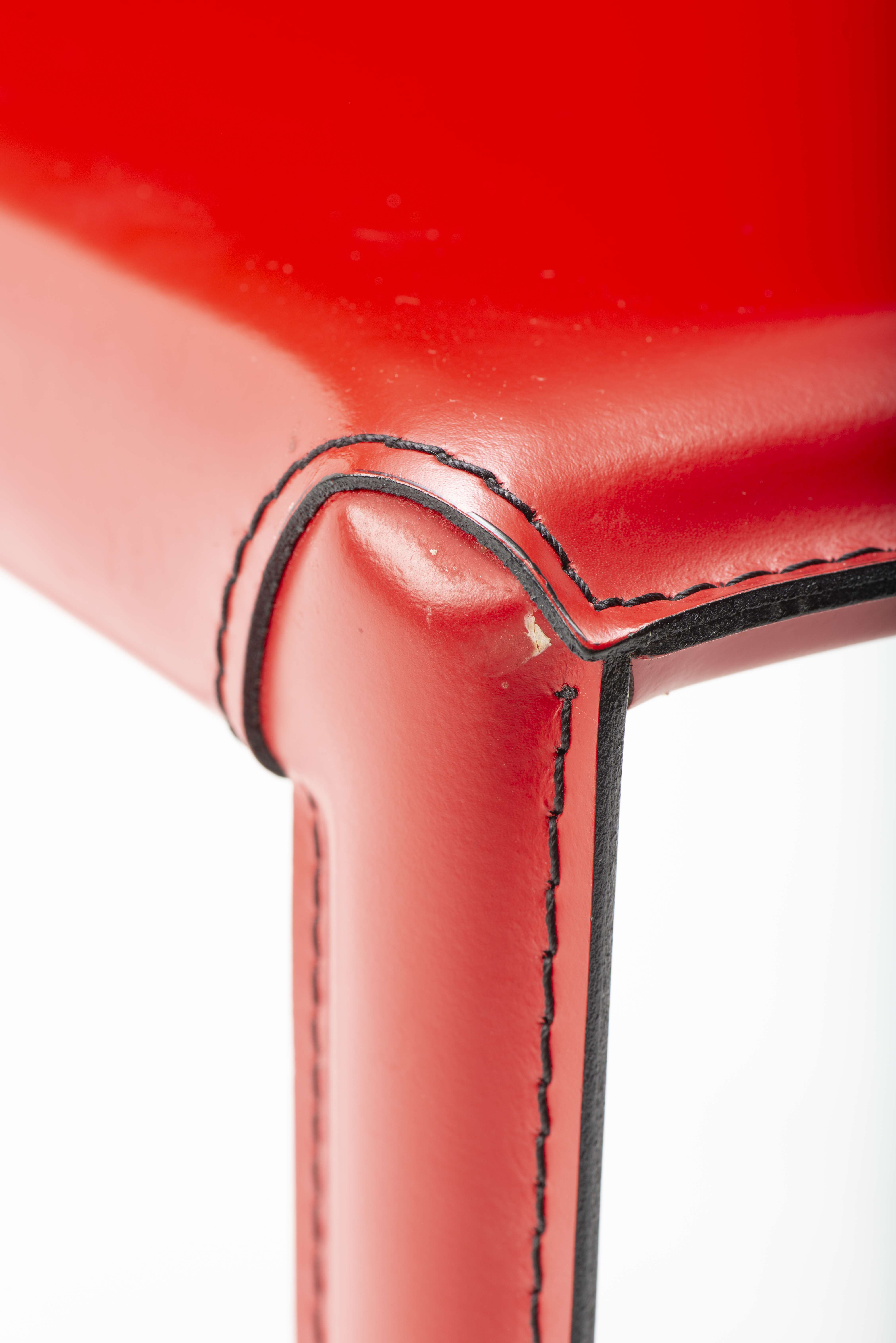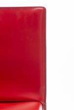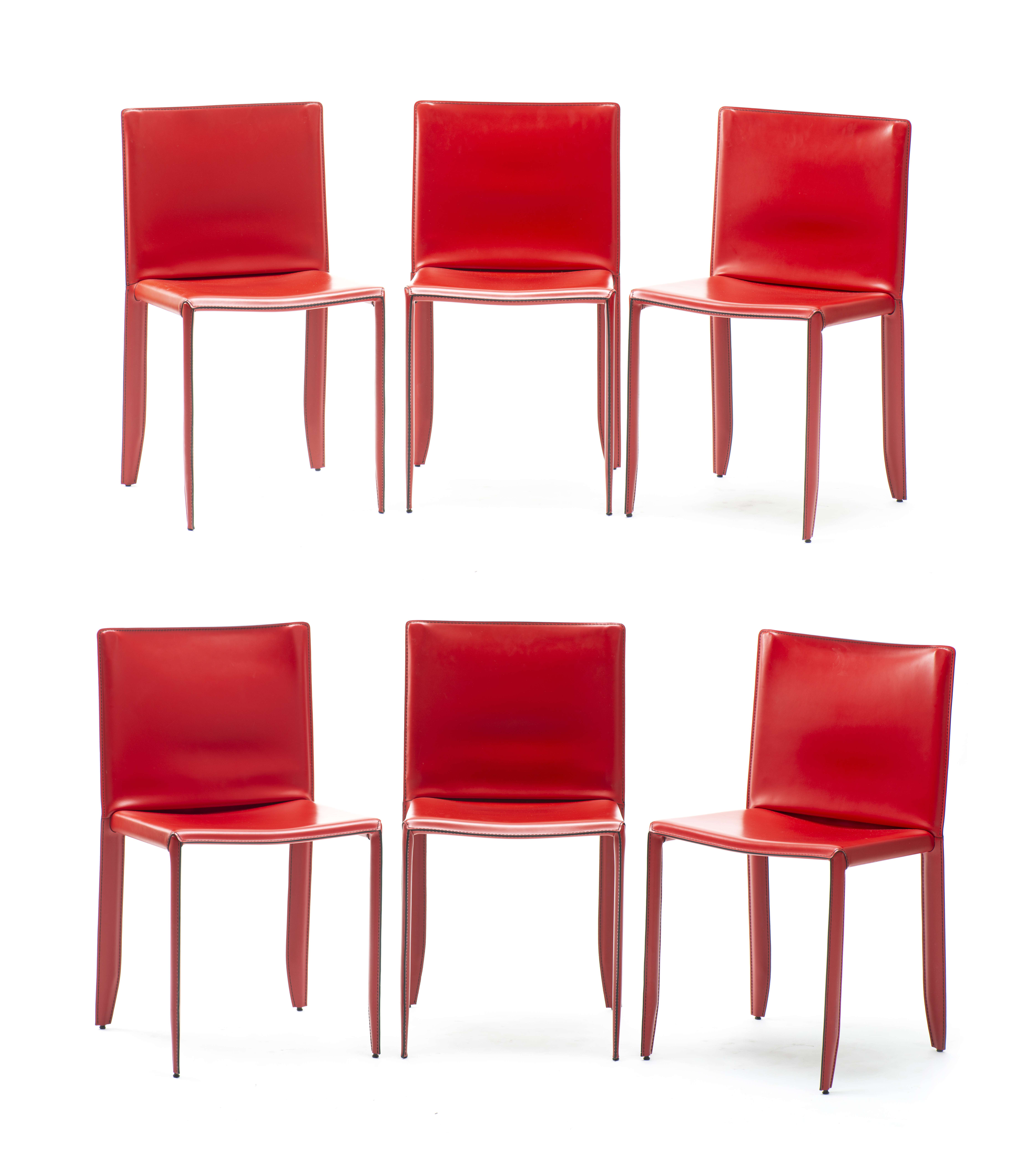 Giorgio CATTELAN, six chaises modèle "Piuma" en cuir rouge. Structure en acier, couture au dos du dossier en V.