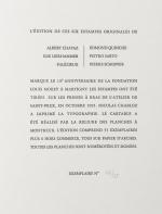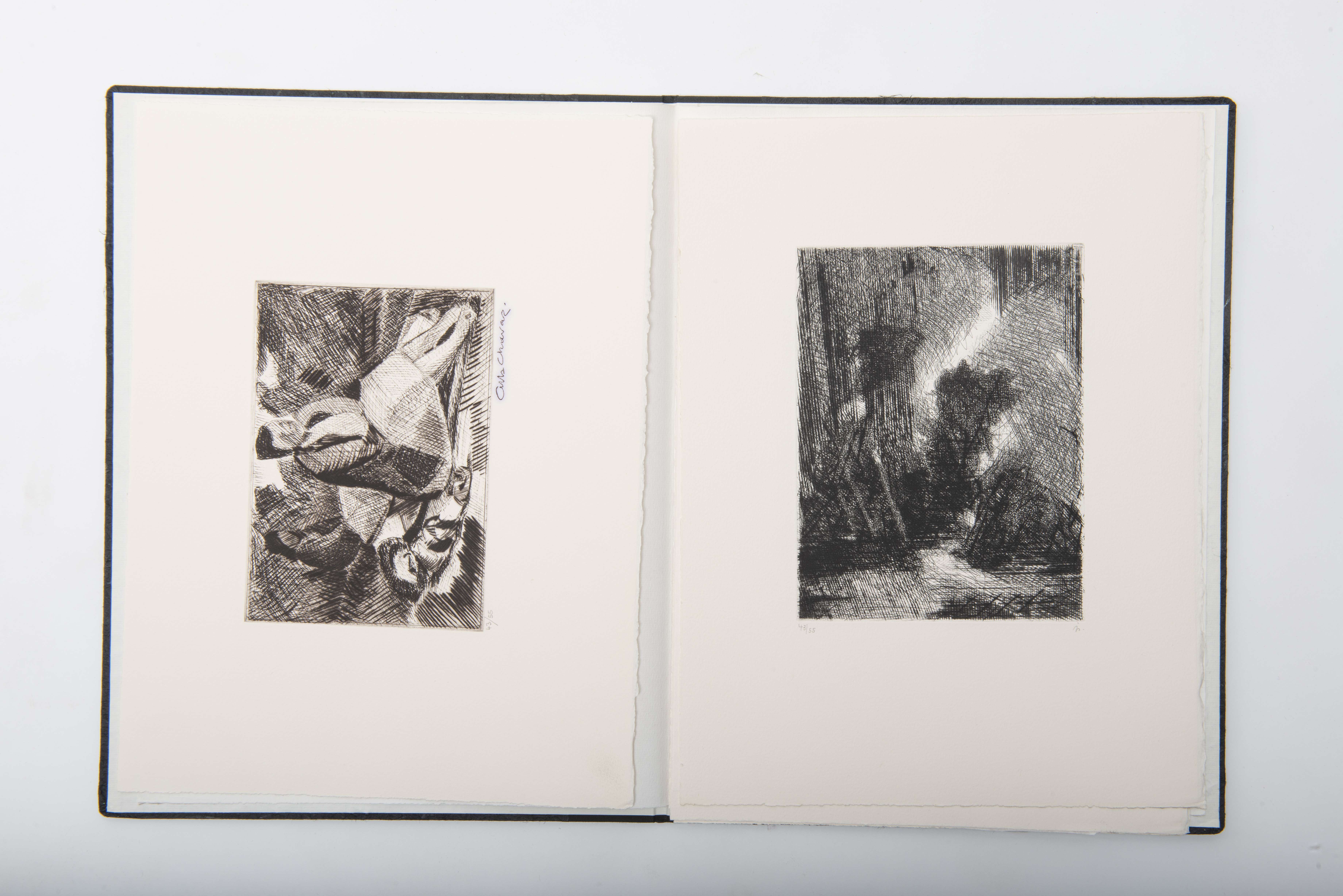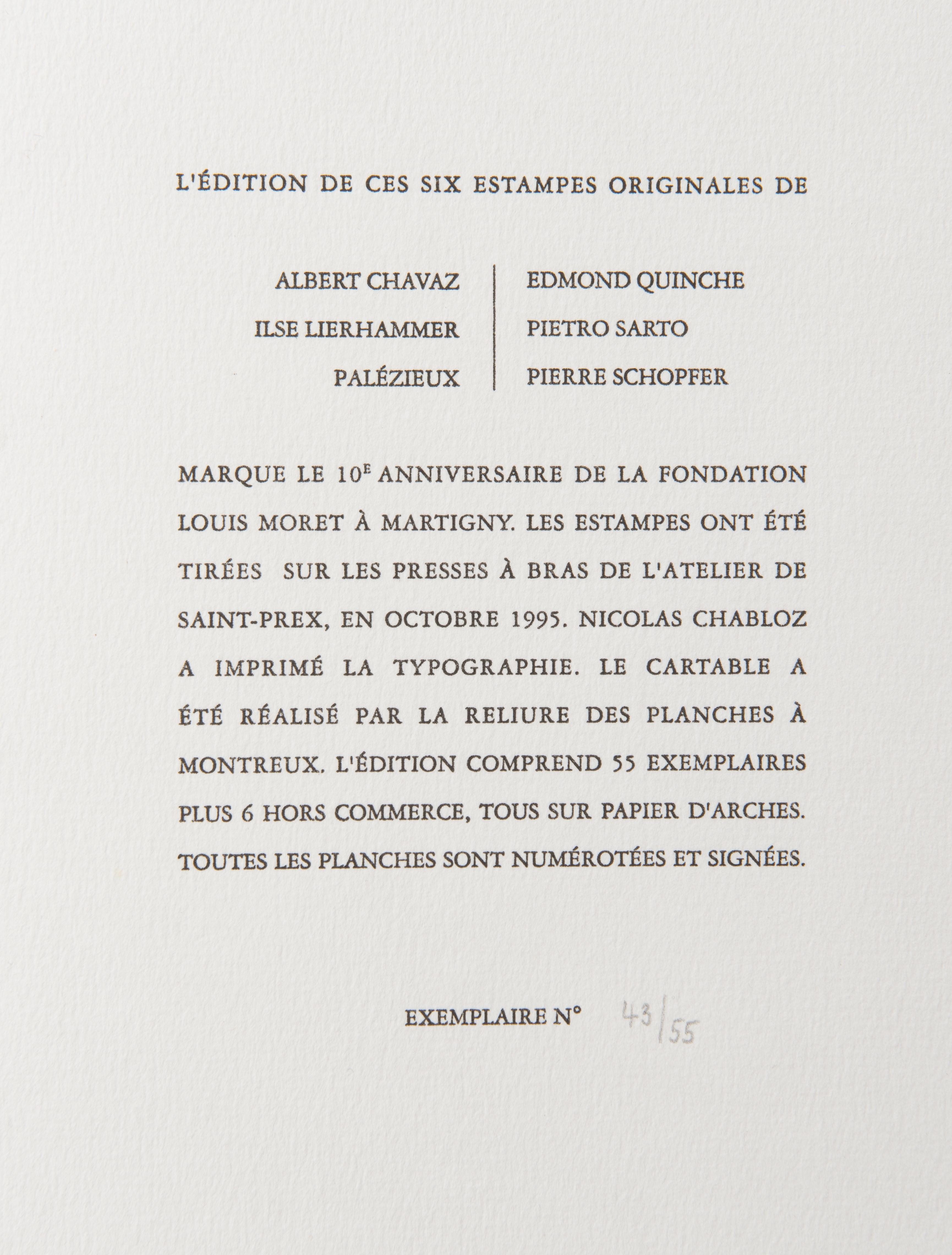 Albert CHAVAZ, Ilse LIERHAMMER, PALÉZIEUX, Edmond QUINCHE, Pietro SARTO, Pierre SCHOPFER, Portfolio Collectif, Fondation Louis Moret 1985 - 1995, Montreux, 1995, contenant 6 estampes originales des artistes, tirées sur le presse à bras de l'Atelier de Saint-Prex, numérotées et signées de la main des artistes.