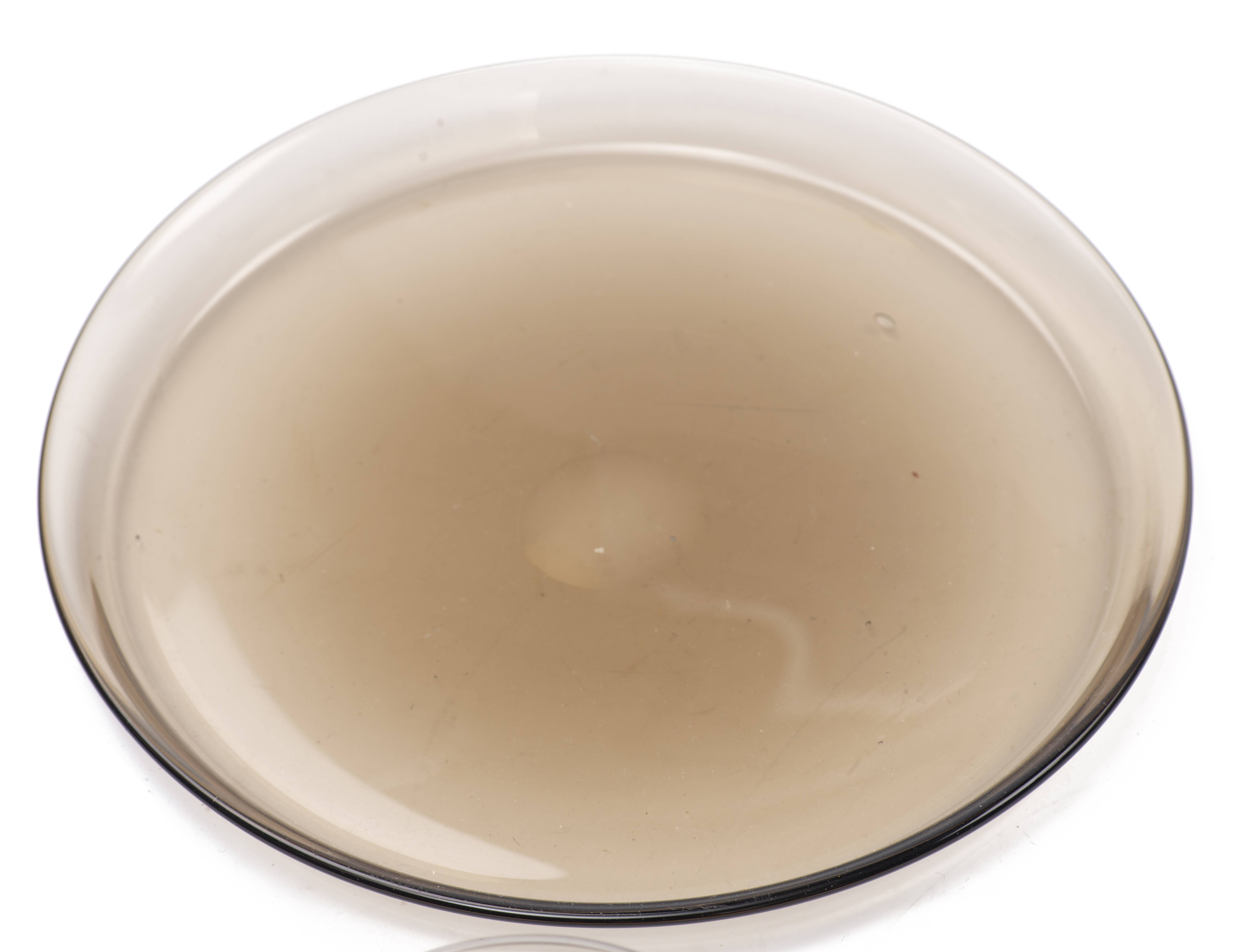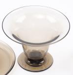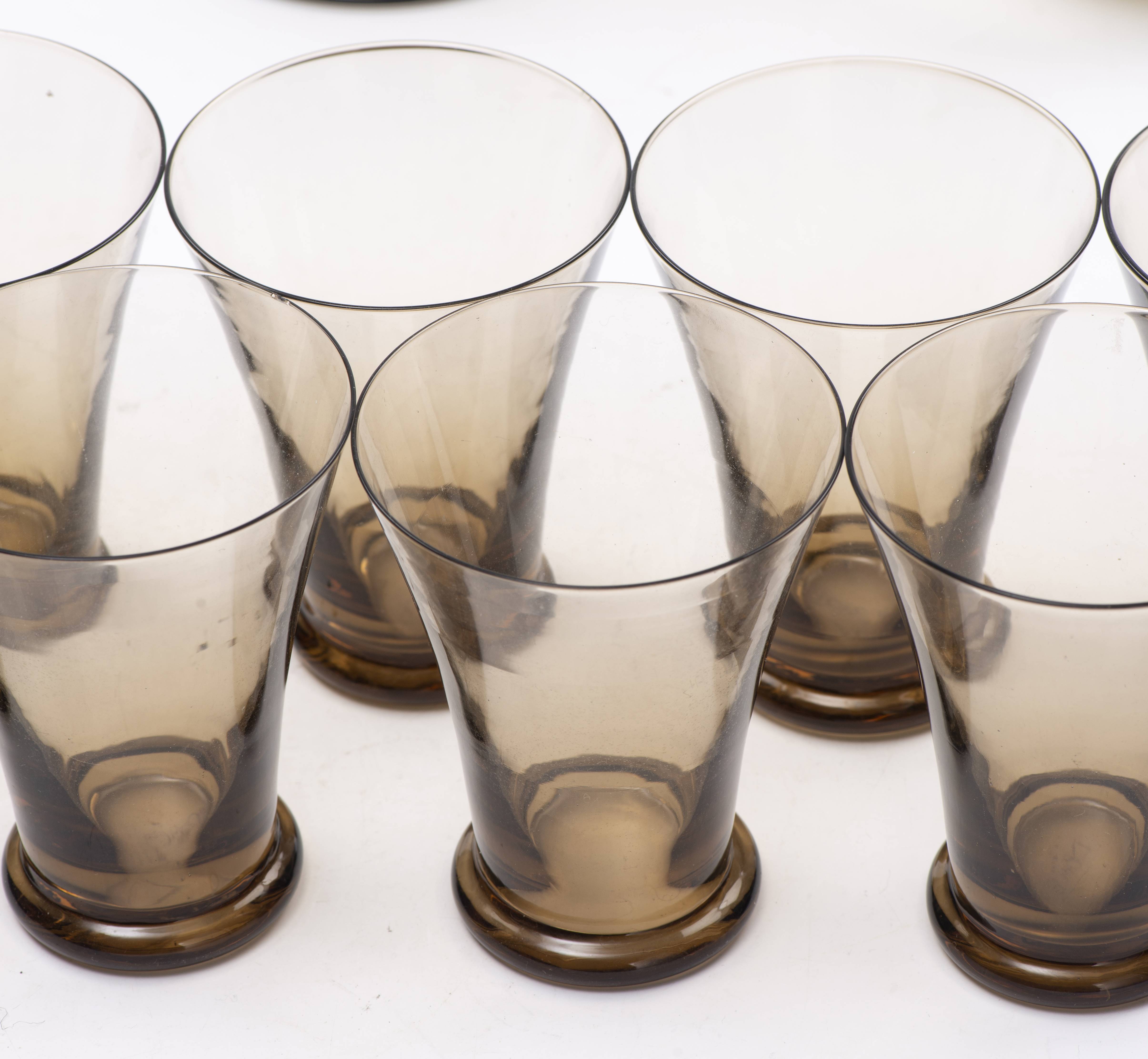 Ensemble de verrerie fumée Art-Déco comprenant 1 carafe, 1 coupe sur pied-douche, 1 plateau rond D. 22.5 cm, 11 verres côniques sur pied renforcé H. 10.5 cm XXe
