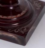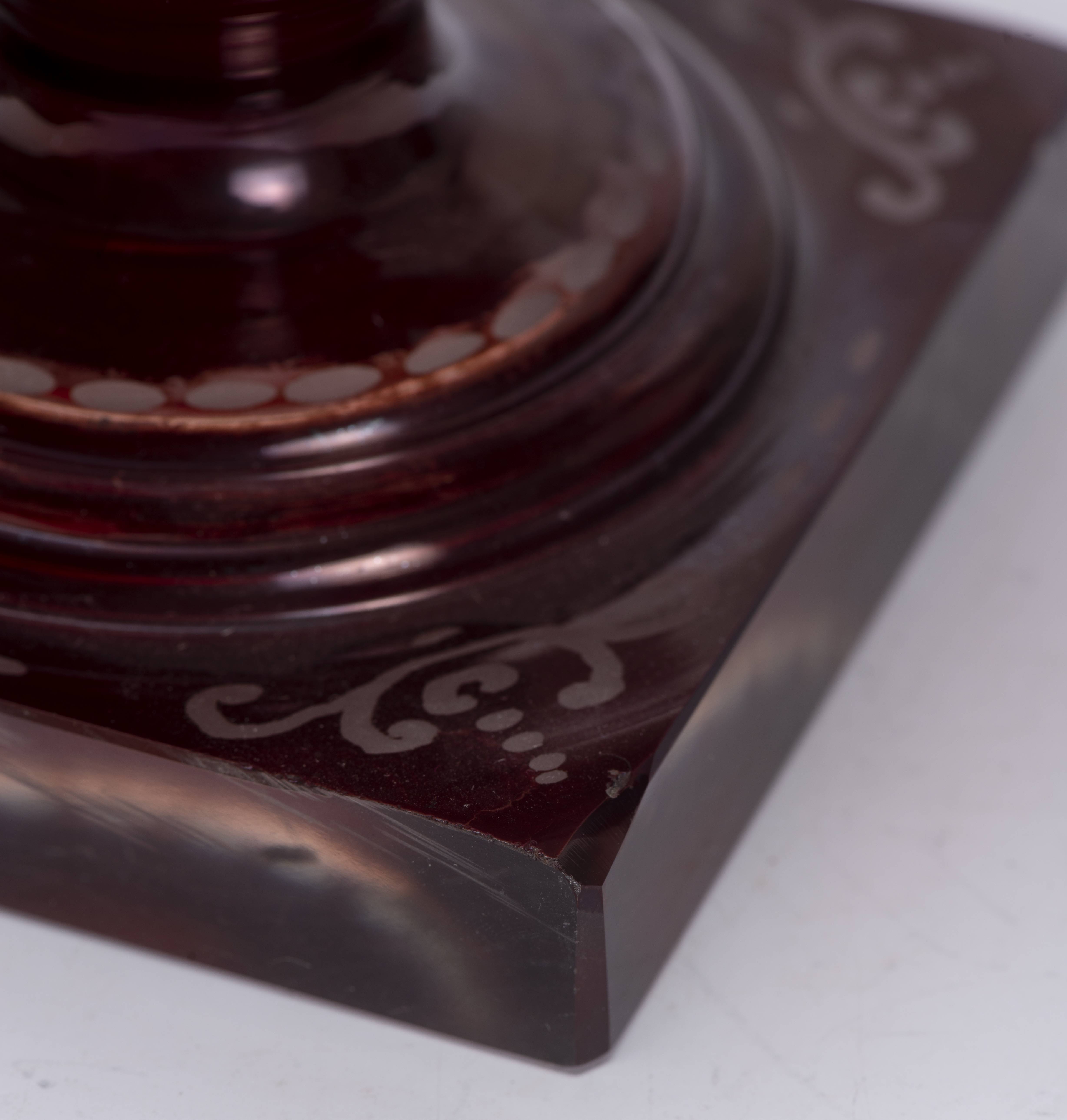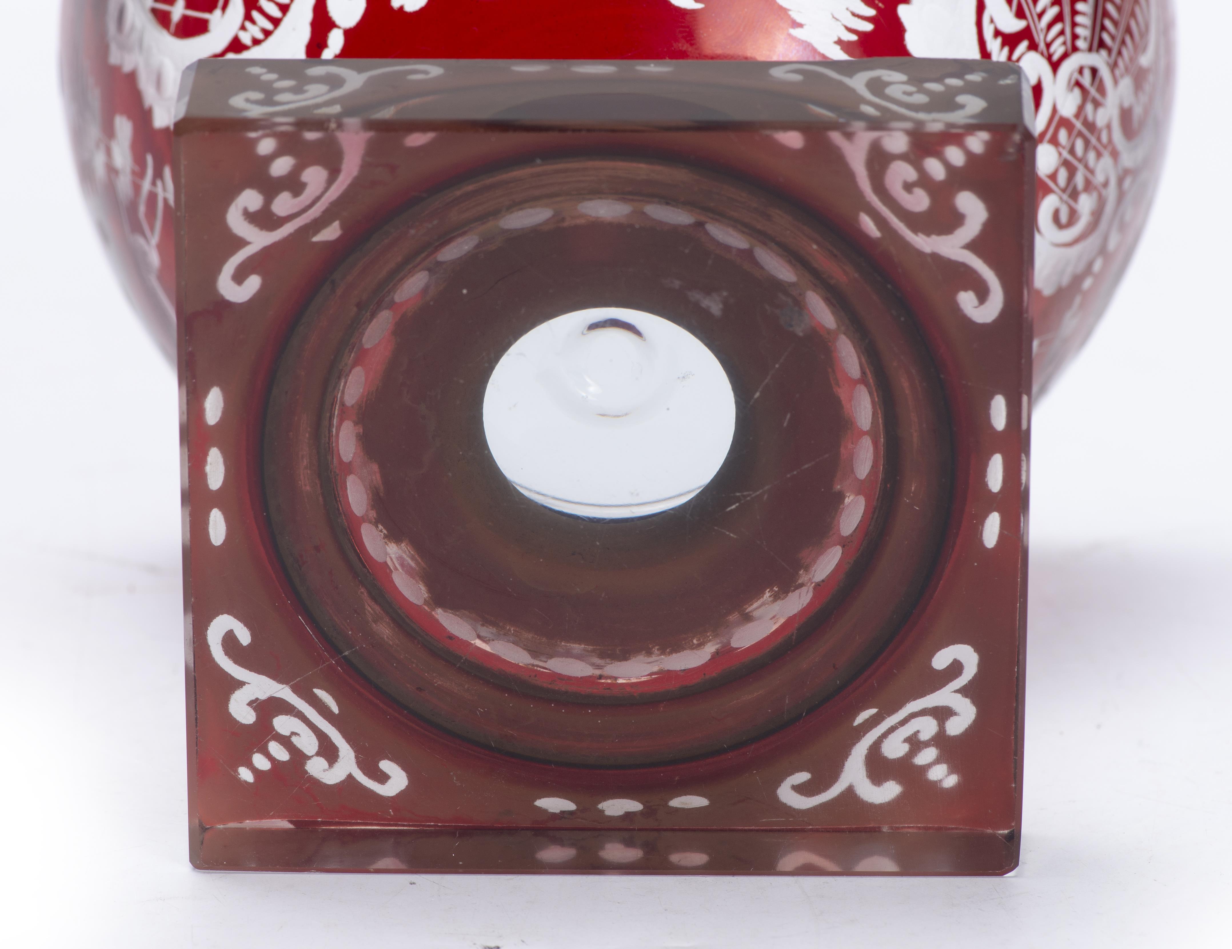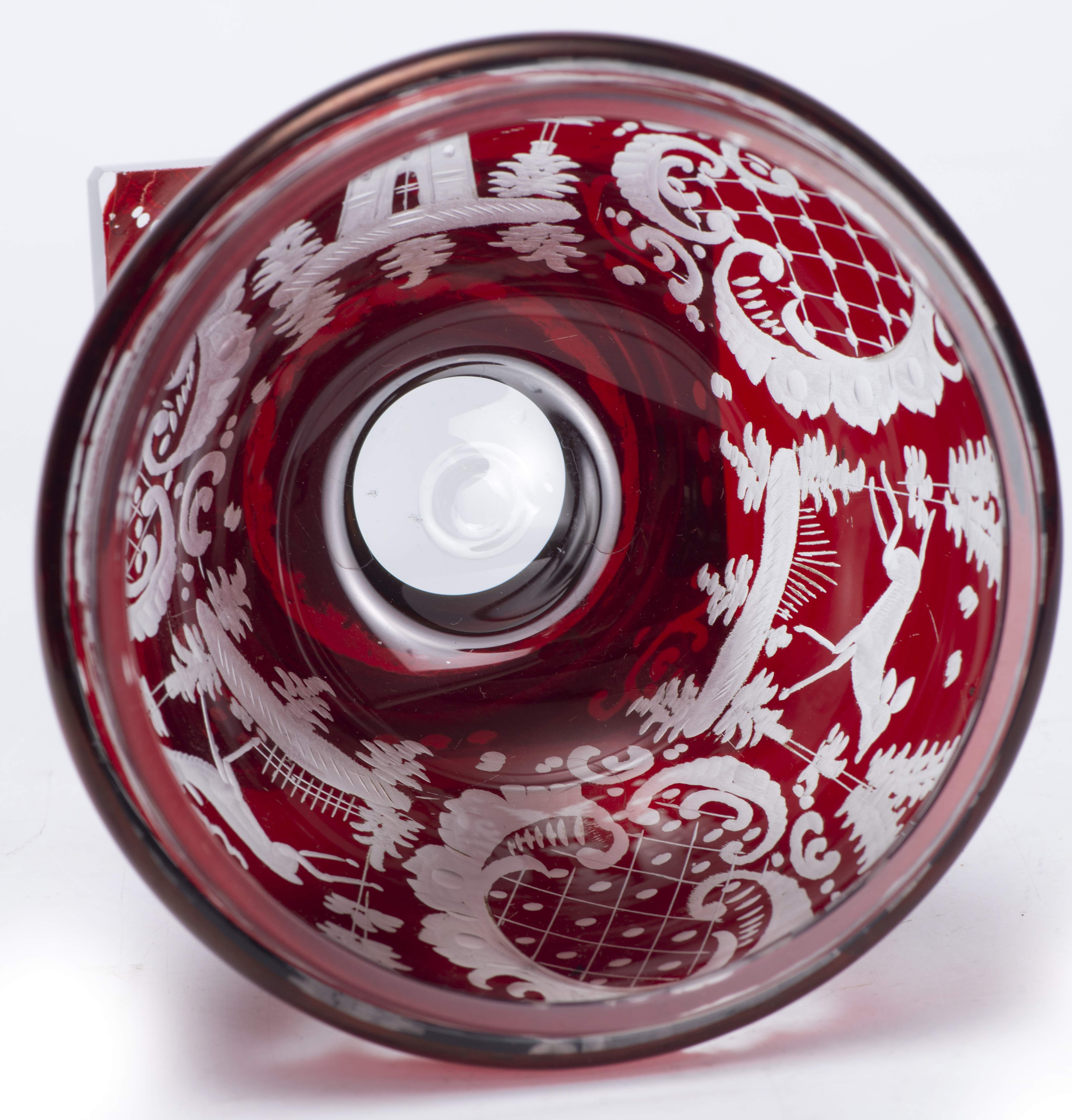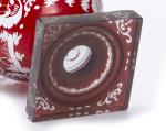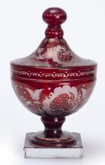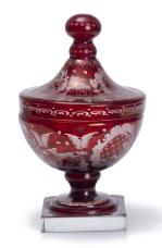 Bonbonnière sur pied en cristal de bohème taillée et colorée rouge à décor d'oiseaux, bâtisses et animaux.(Manufacture Egermann de son inventeur Friedrich Egermann (1777 - 1864)).
