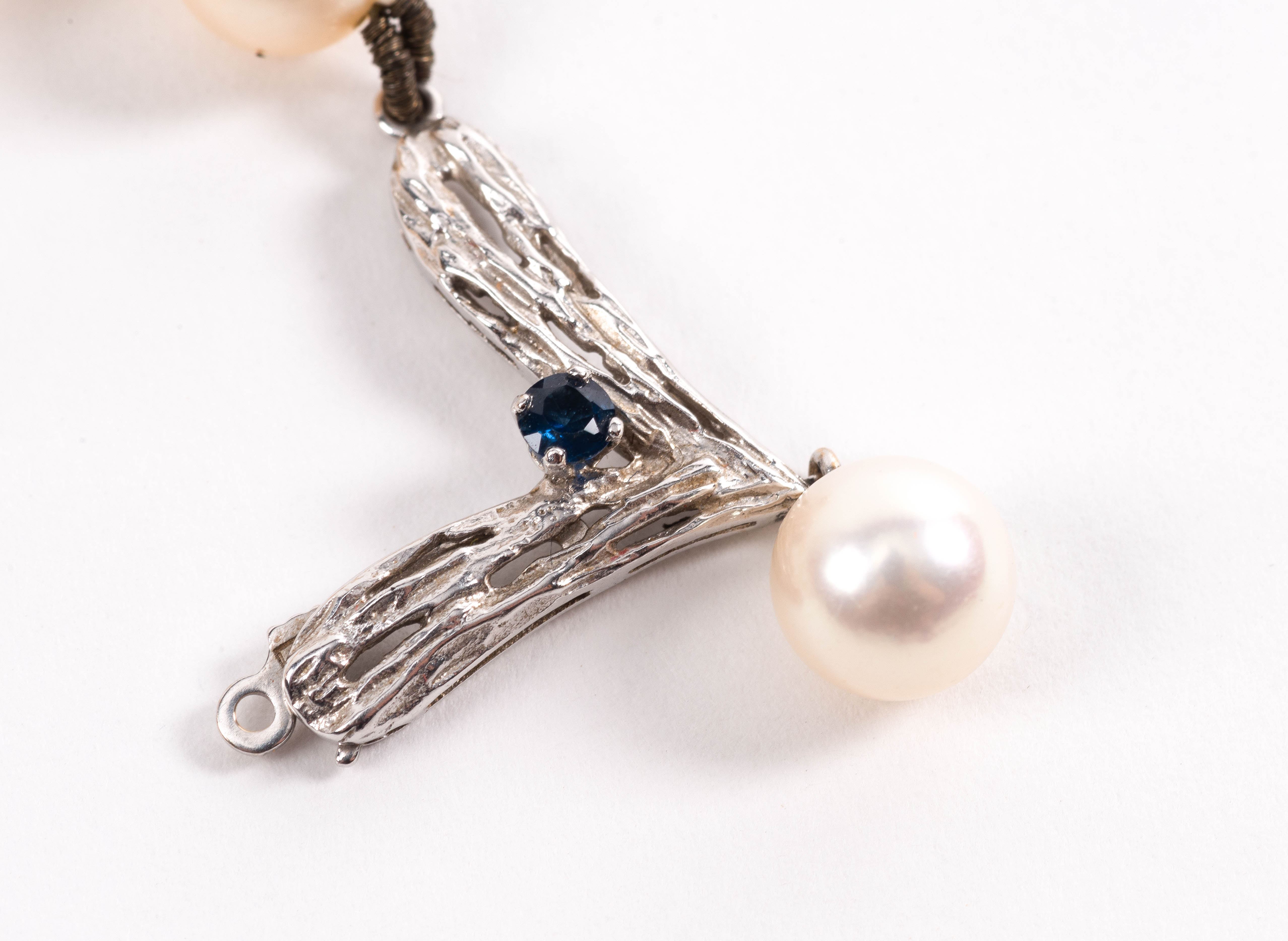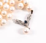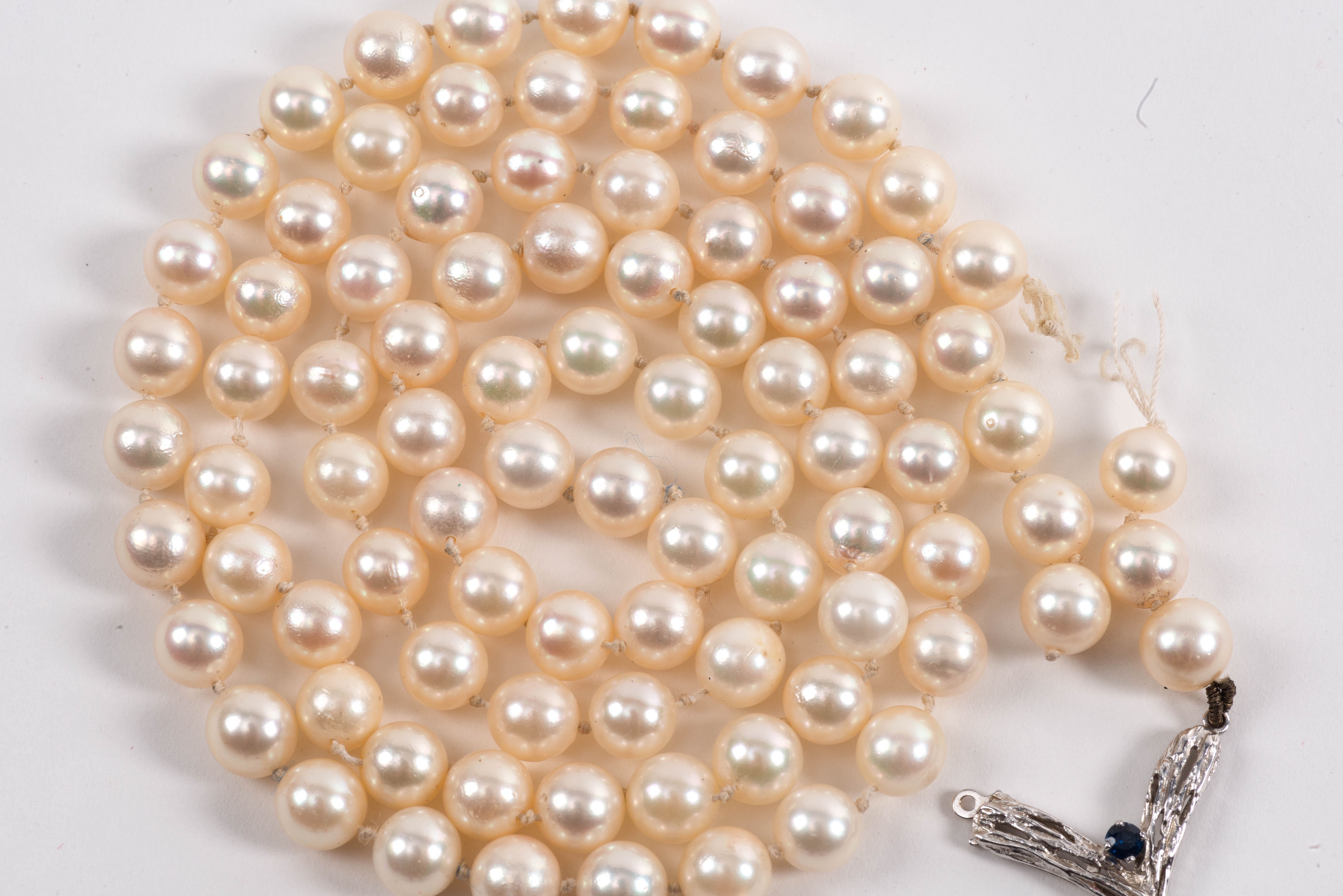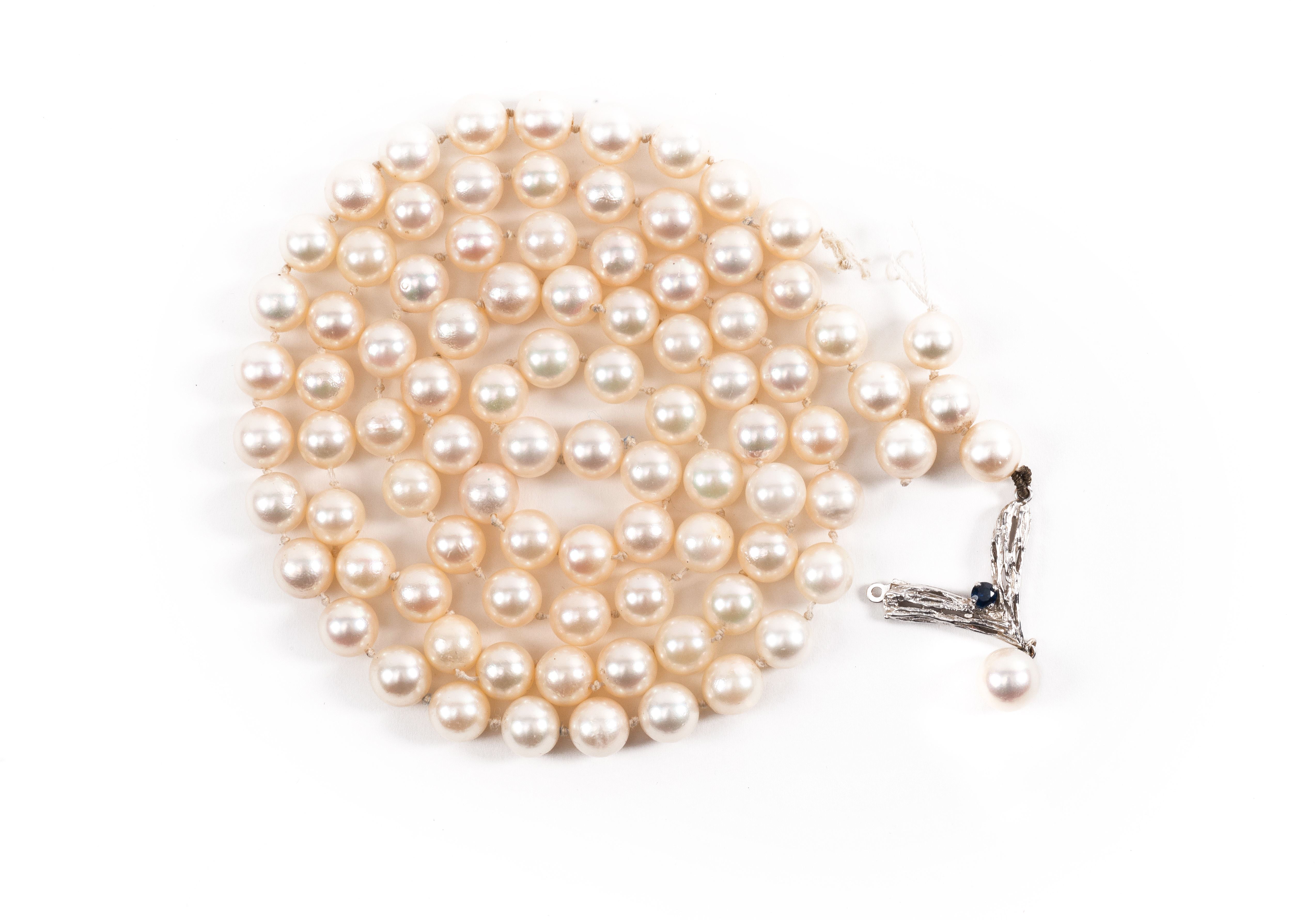 Collier de 90 perles de culture de 7mm avec pendentif fermoir en or blanc .750 et un saphir