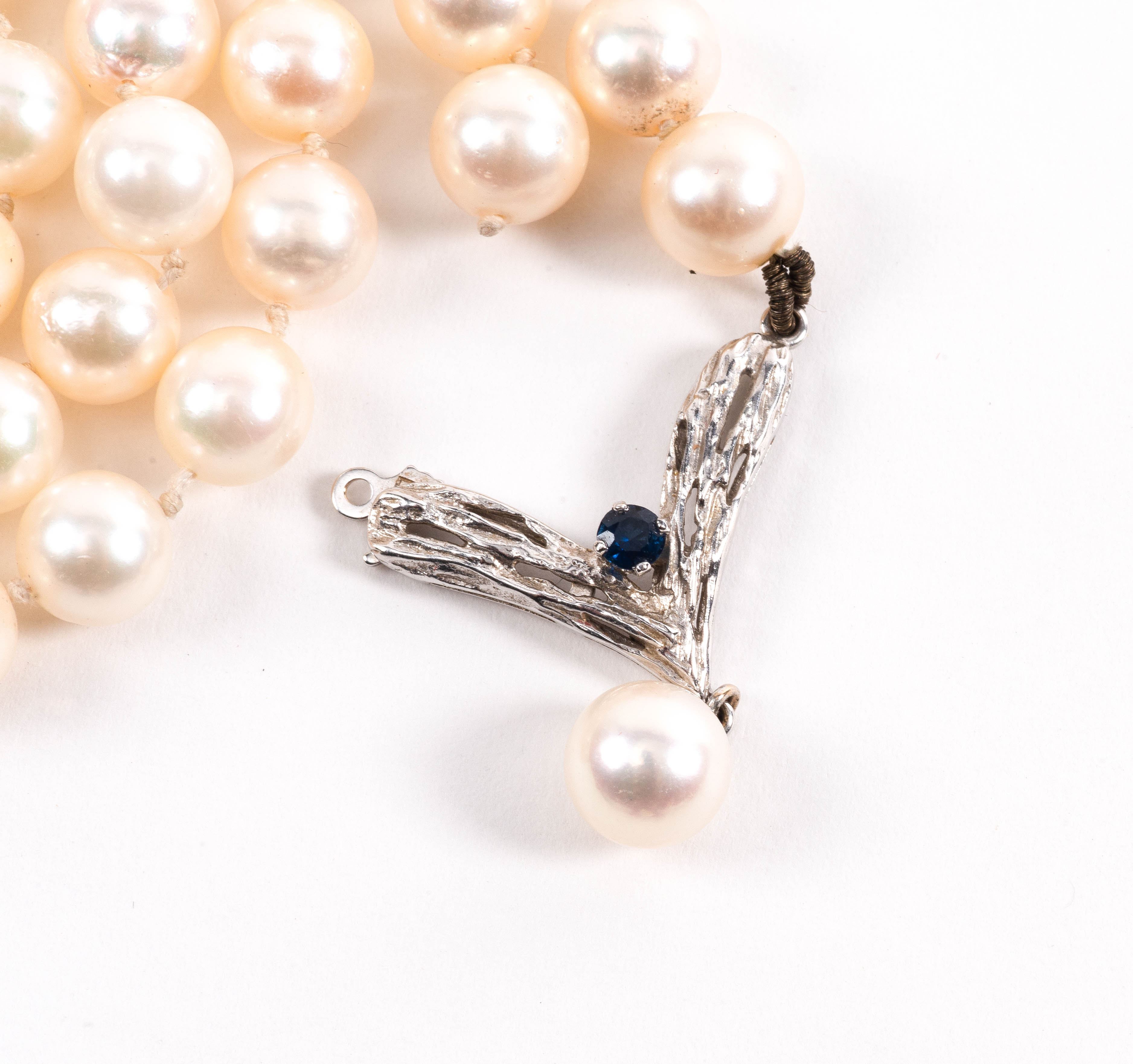 Collier de 90 perles de culture de 7mm avec pendentif fermoir en or blanc .750 avec un saphir serti à griffes de 0.07 ct
