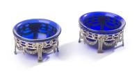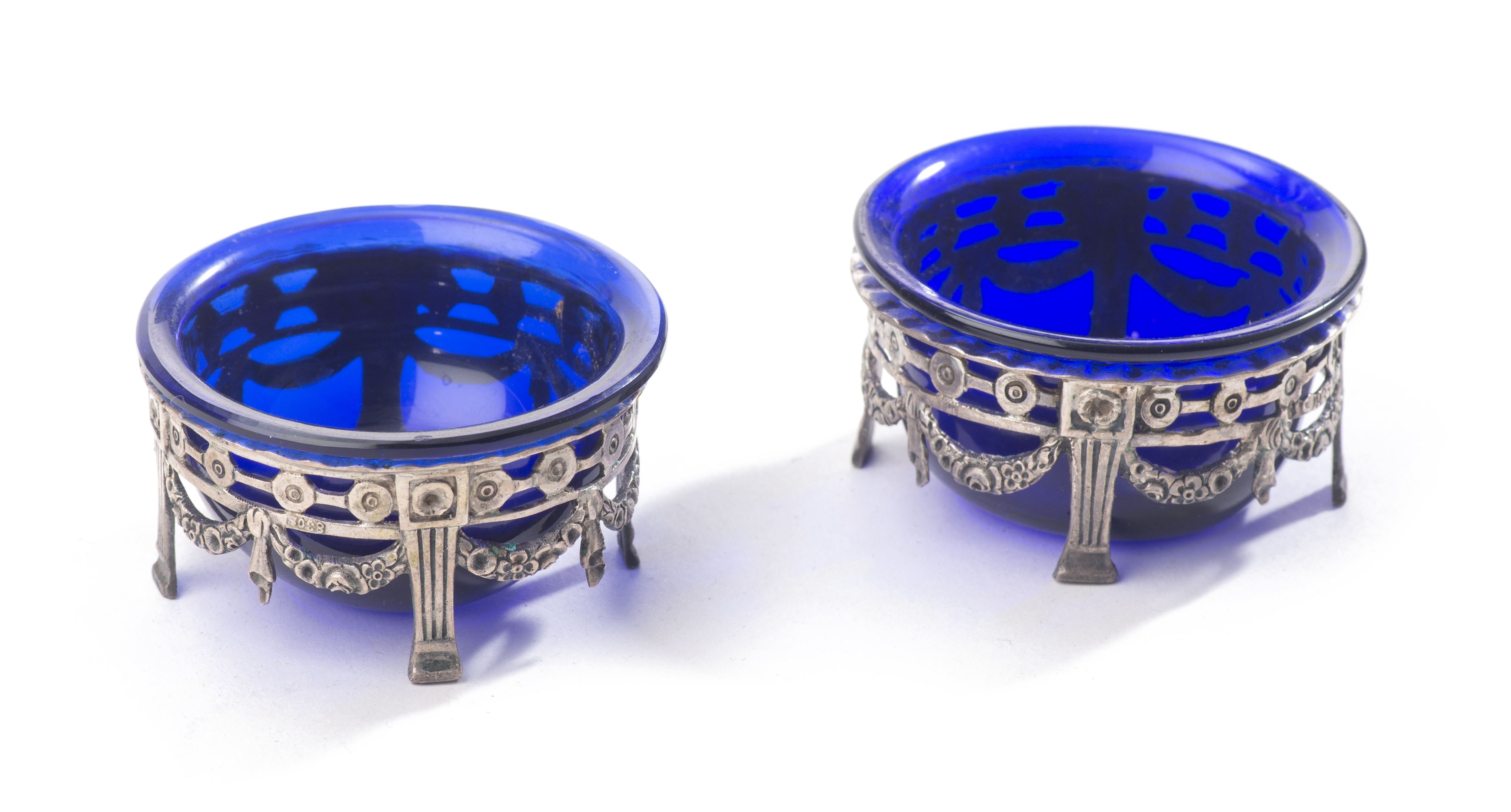 2 salières en argent allemand .830 à décor de guirlandes de fleurs, récipients en argent bleuï.