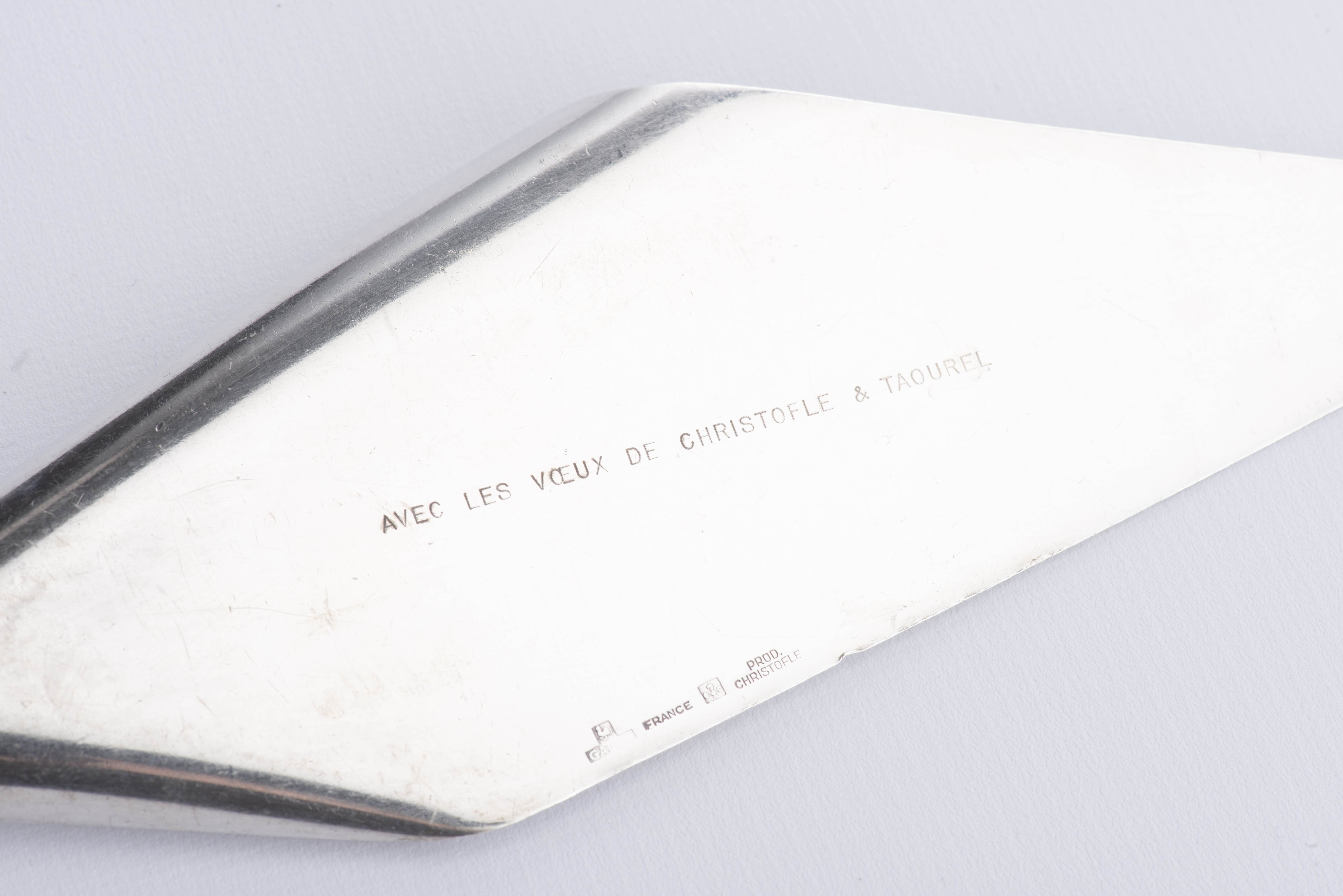 Pelle à tarte Christofle en métal argenté patiné sur le dessus et gravé au-dessous "Avec les vœux de Christofle & Taourel"
