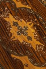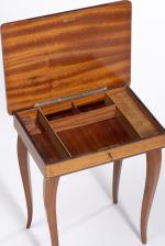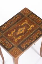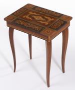 Petite table contenant une boîte à musique à plateau marqueté de neufs caissons décorés de feuilles d'acanthes et d'oiseaux, et pieds galbés.
