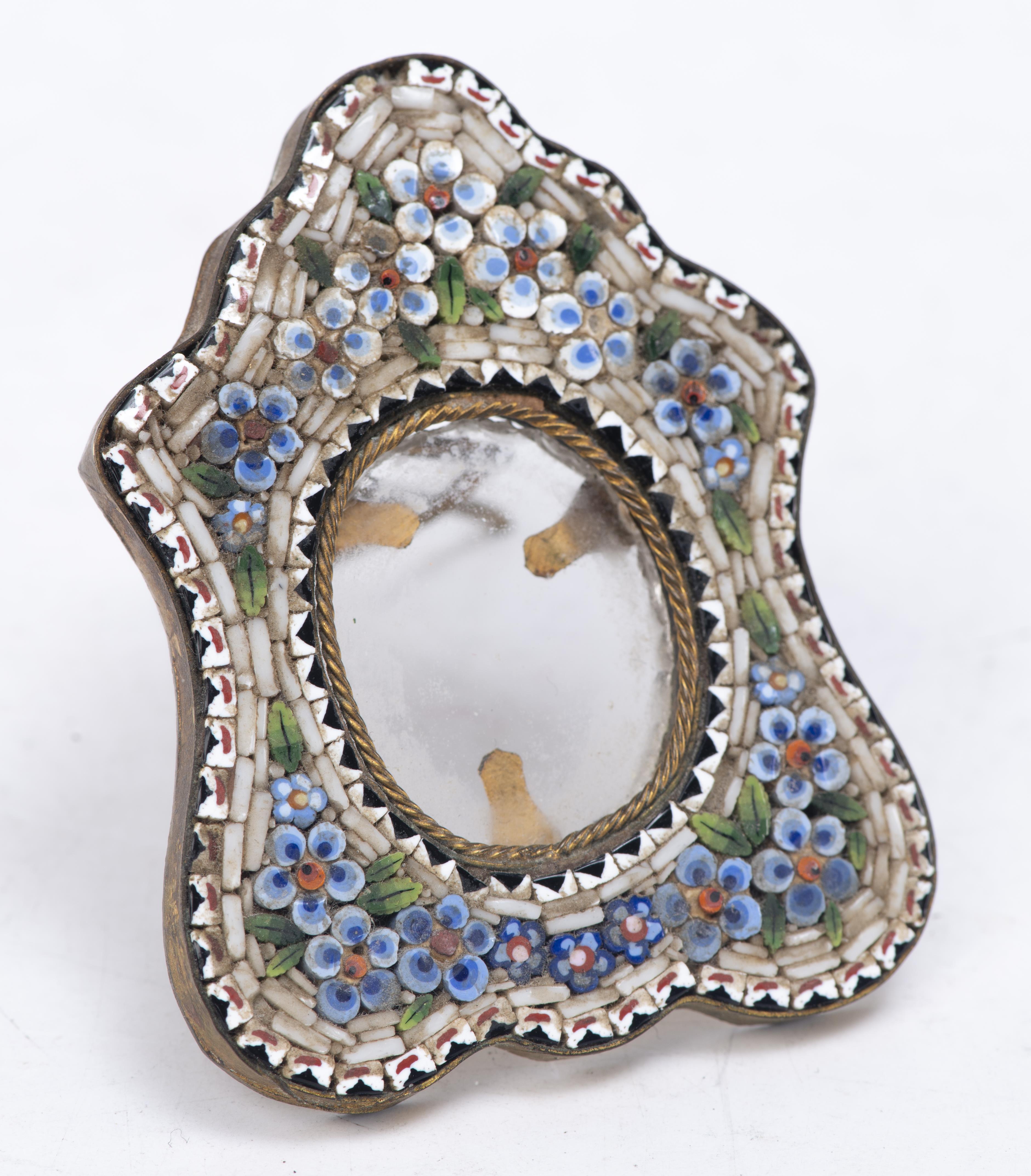 - Un cadre rectangulaire décoré de fleurs bleues en micro-mosaïque, 6.5x5.2 cm