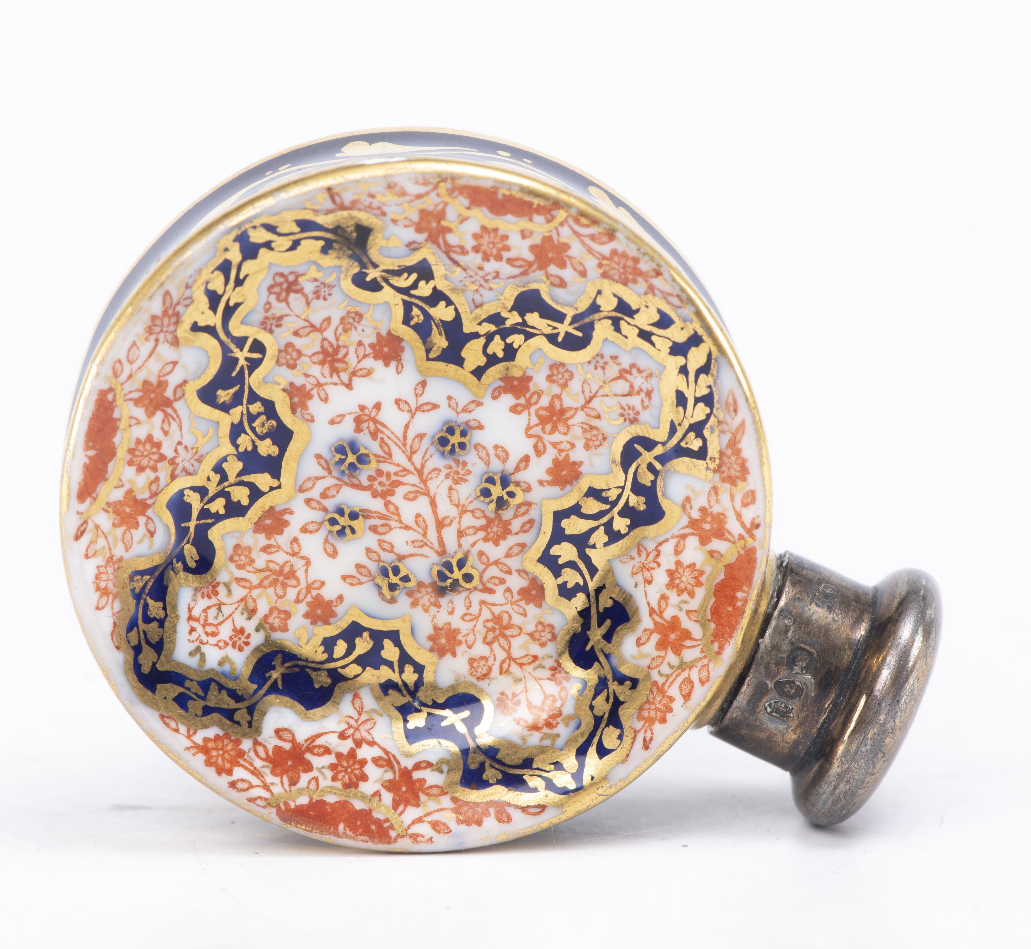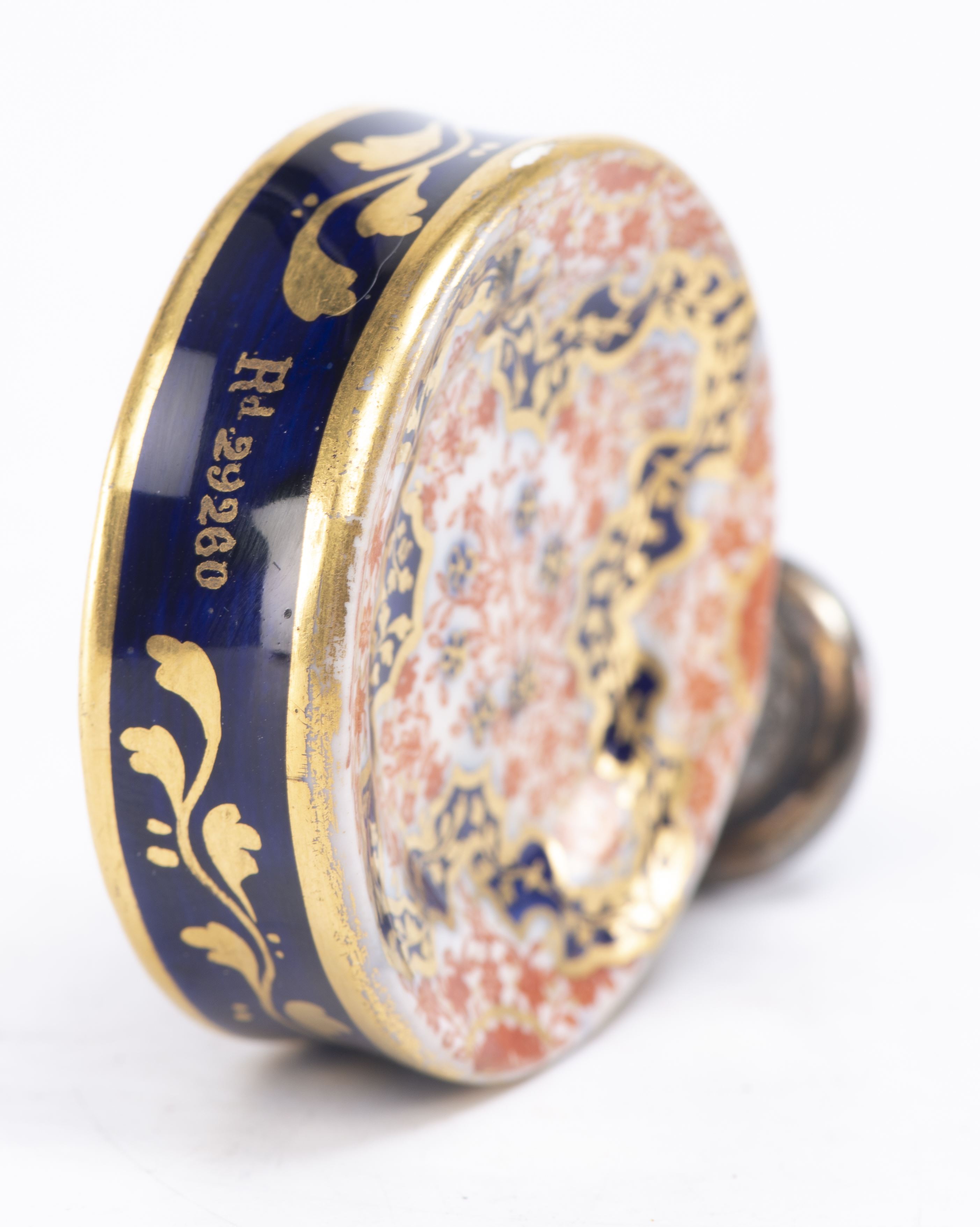 - Une gourde en céramique peinte de motifs floraux rouge, bleu et or, porte l'inscription "Rd 29260" sous la panse. Avec bouchon en argent .925. H. 5.5 cm & Diam. 4.2 cm