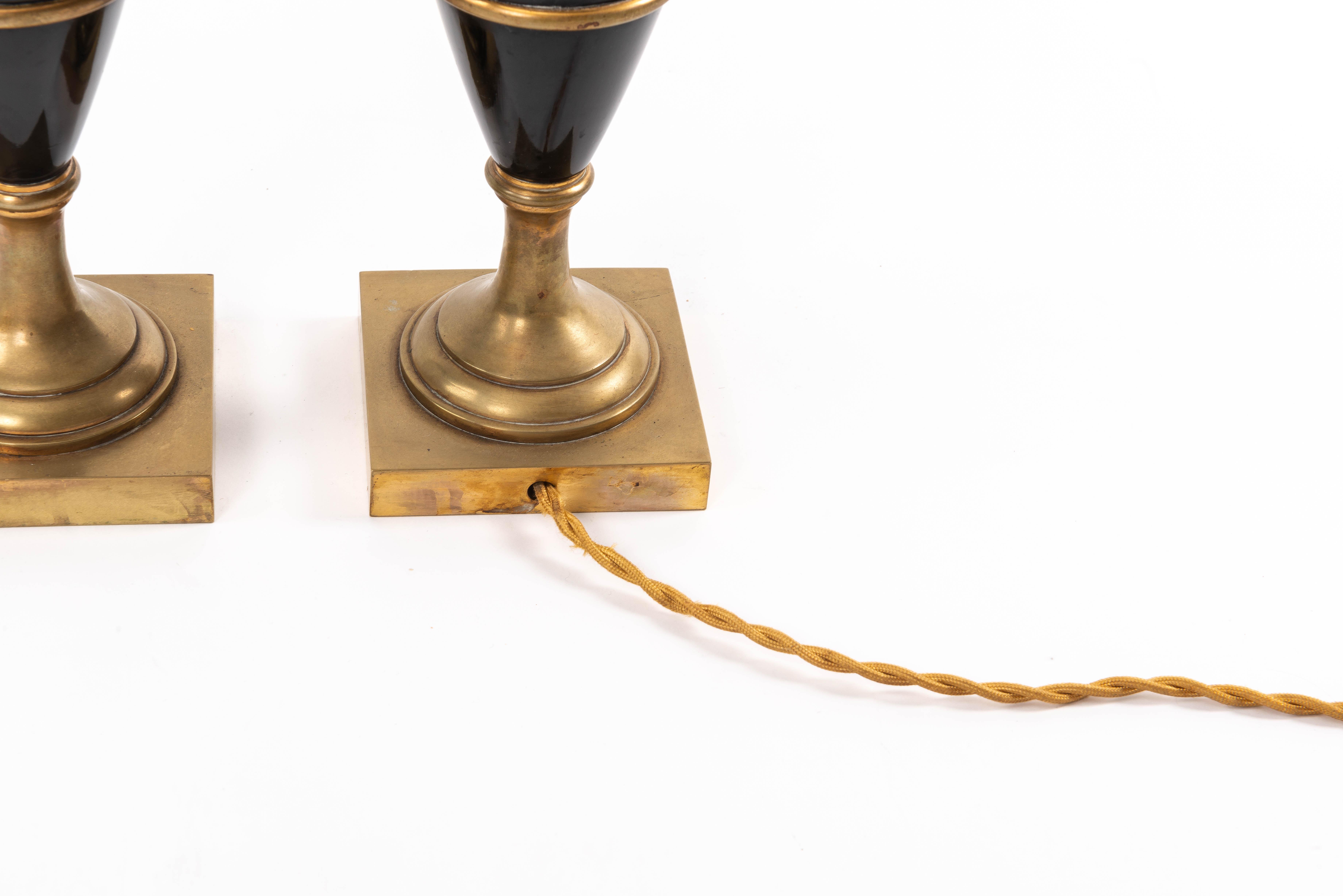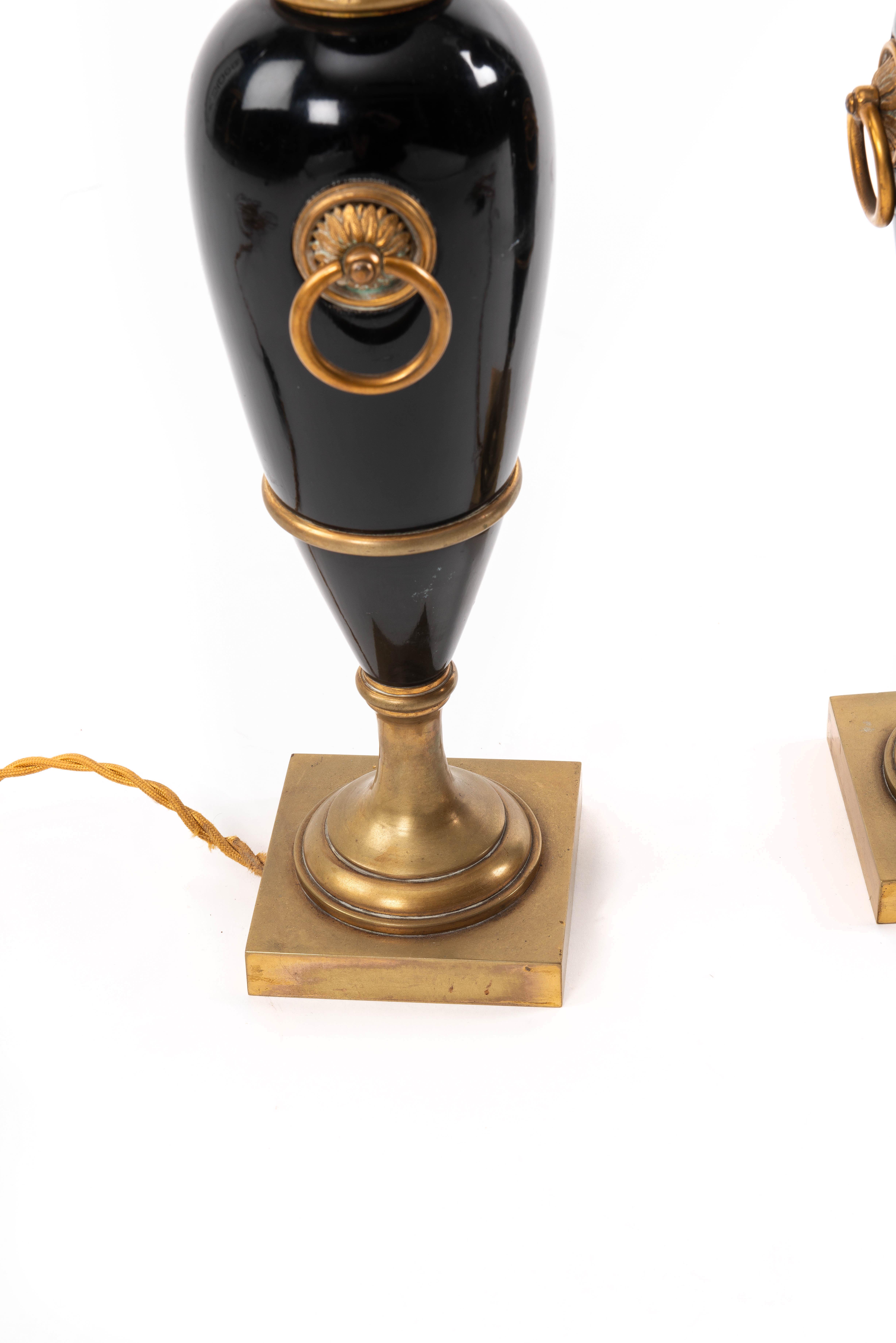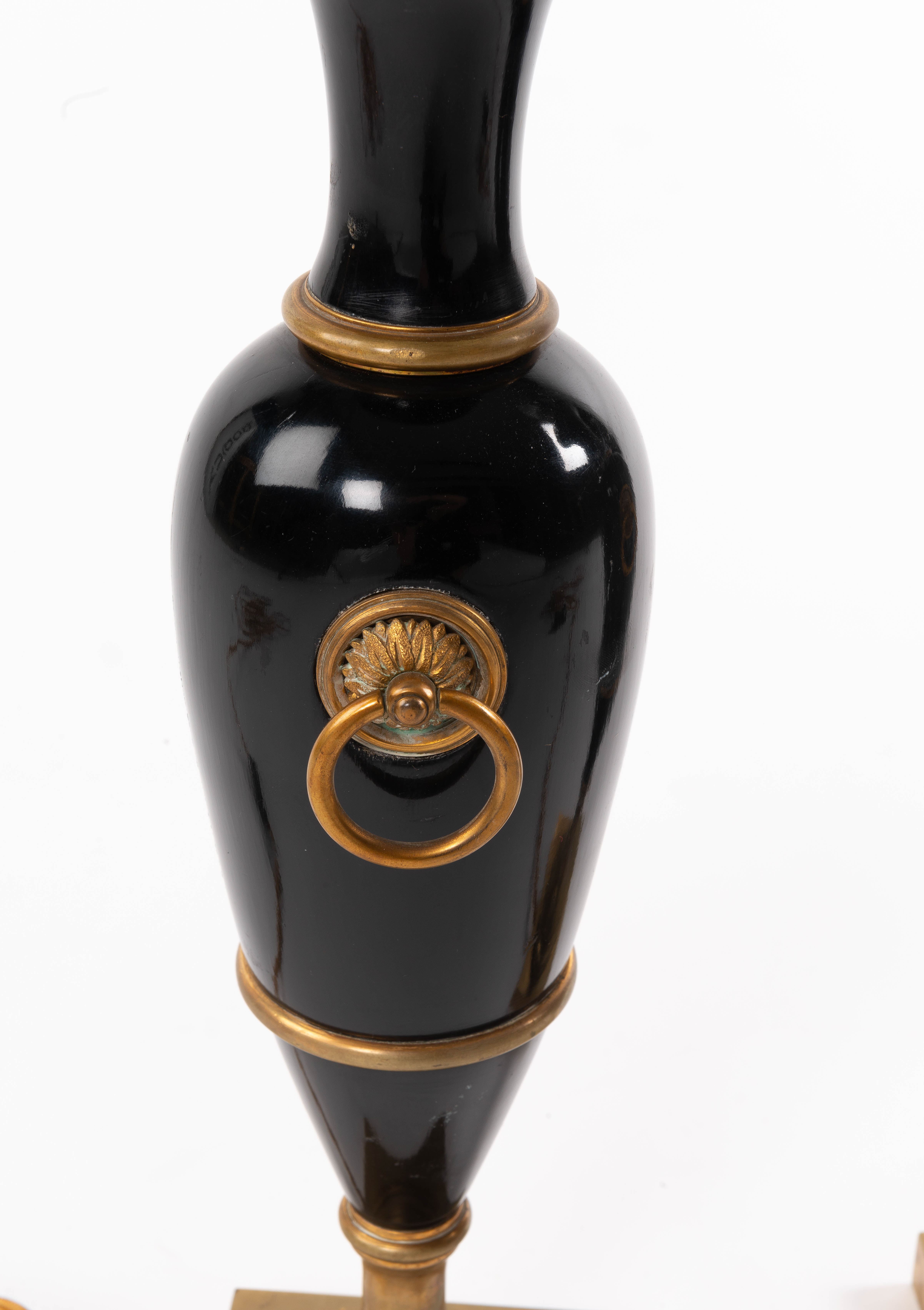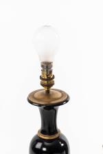 Paire de lampes de table en bois laqué bleu cobalt, imitant la forme des vases de Sèvres. Garnitures et piètement en bronze doré.