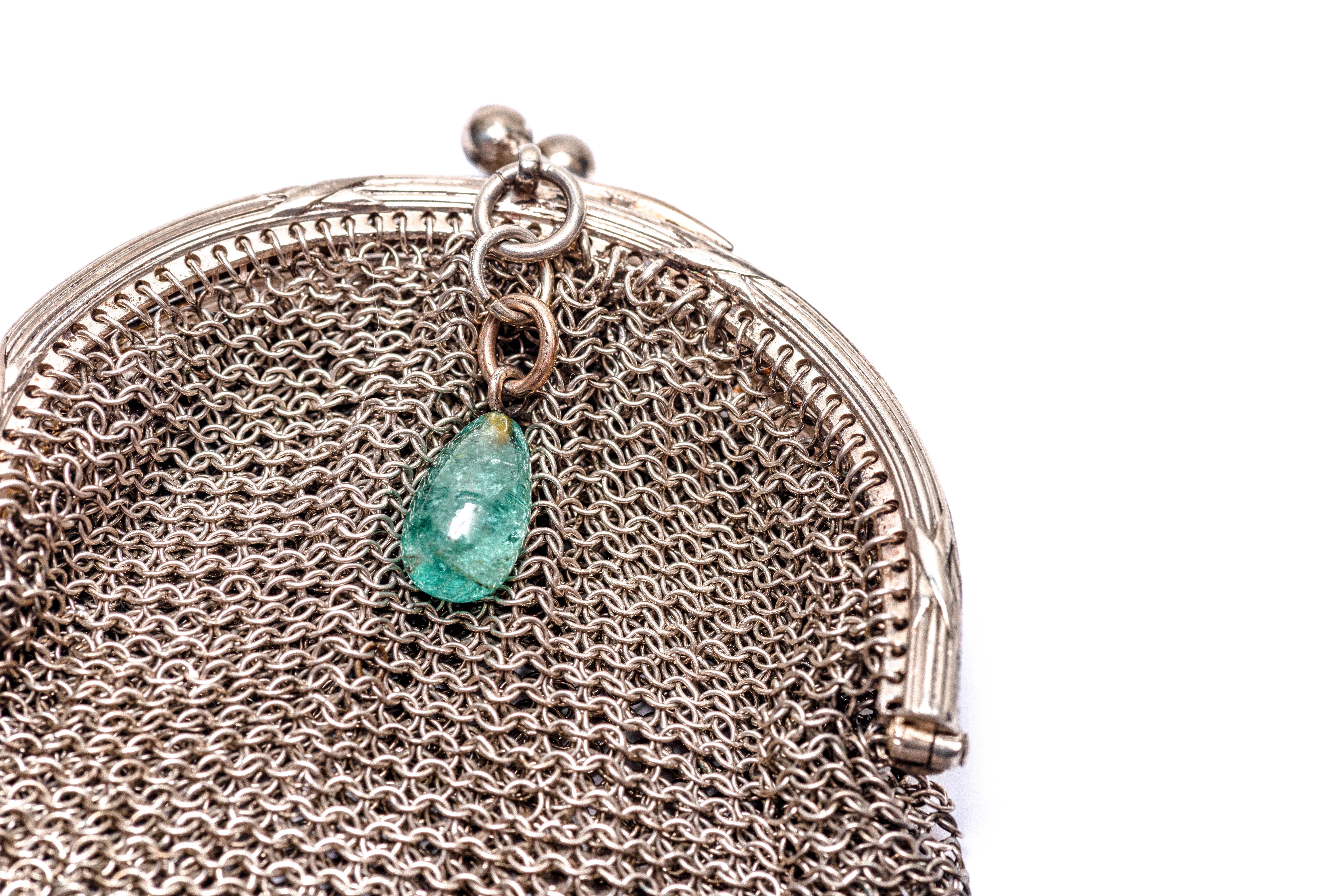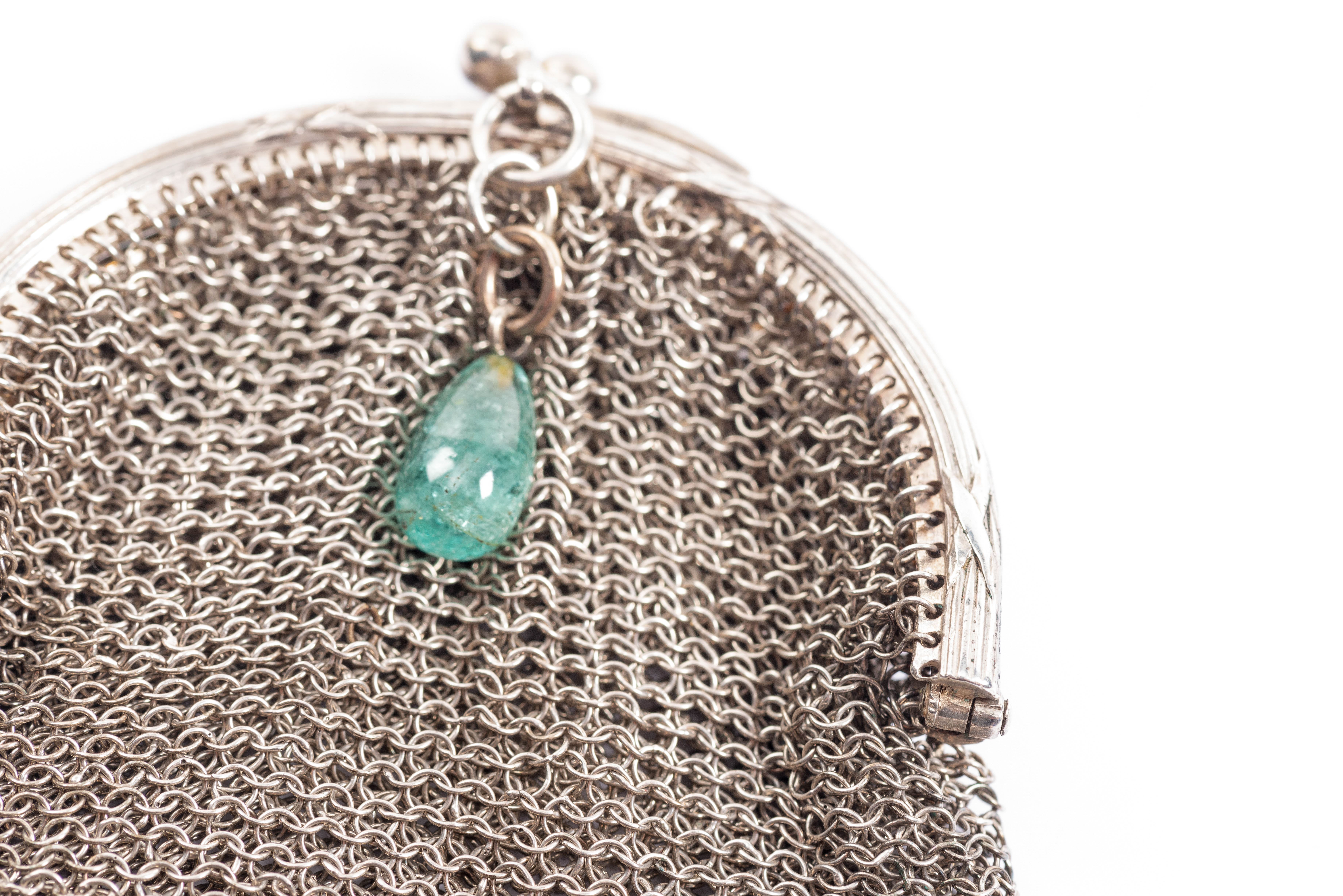 Bourse bipartite en mailles d'argent munie d'une perle bleue translucide en forme de goutte