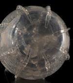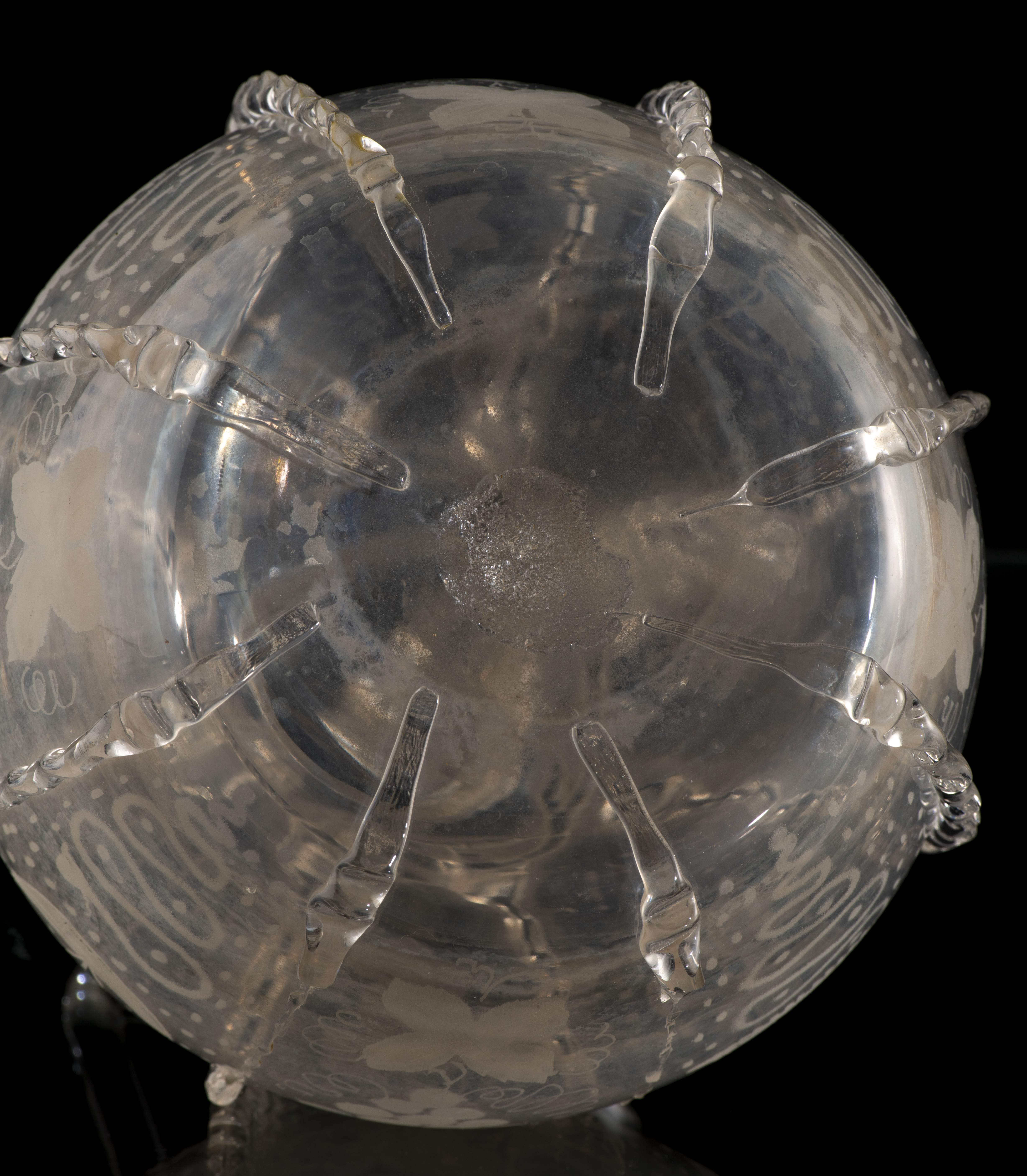 Carafe ancienne en verre soufflé de Hollande à décor gravé de moulins et grappes de raisin, col à 2 anses et panse compartimentée.
