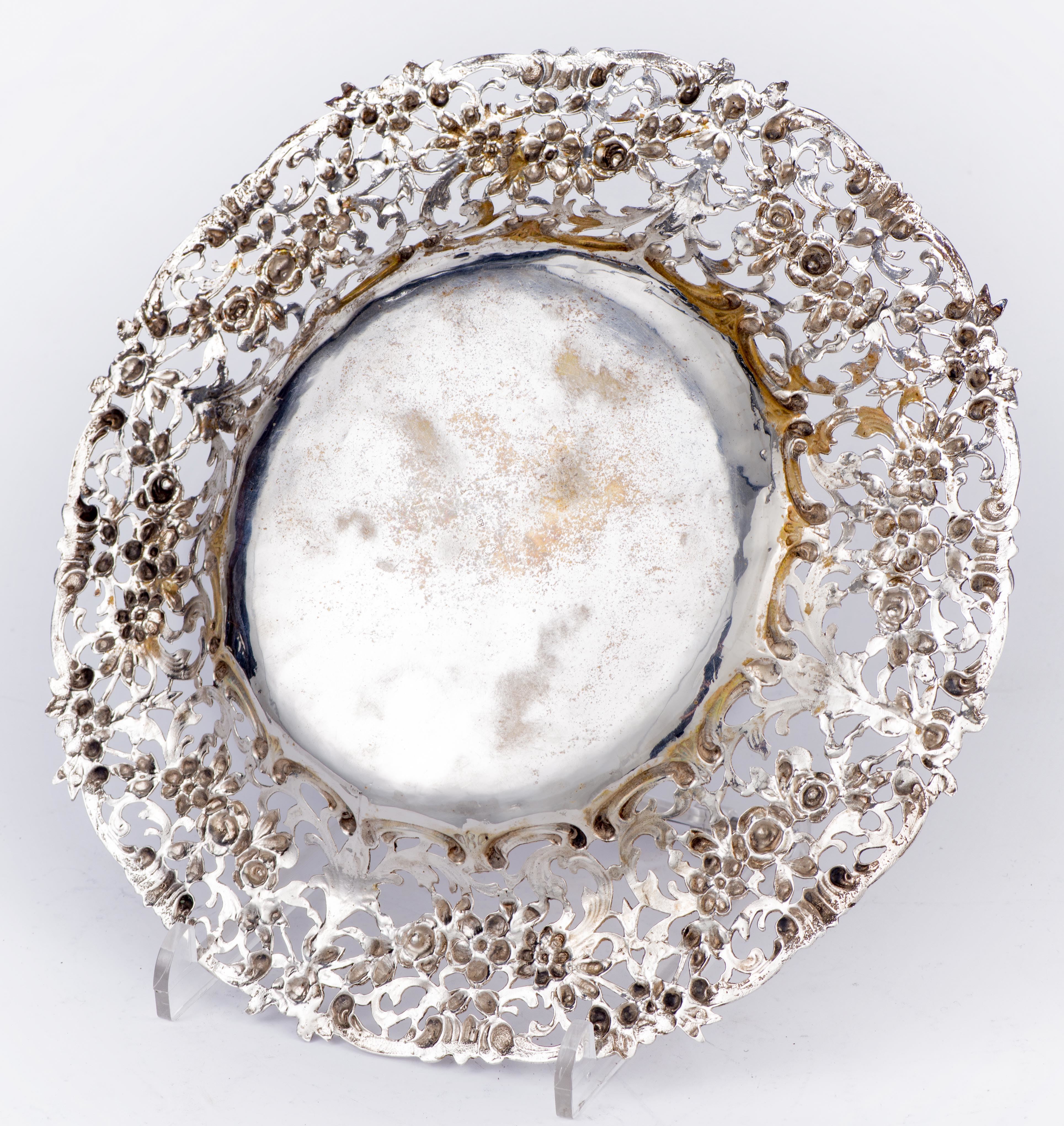Plat à biscuit en argent .830 peut-être italien à marli ajouré à décor ajouré de roses, mon. au centre BP .