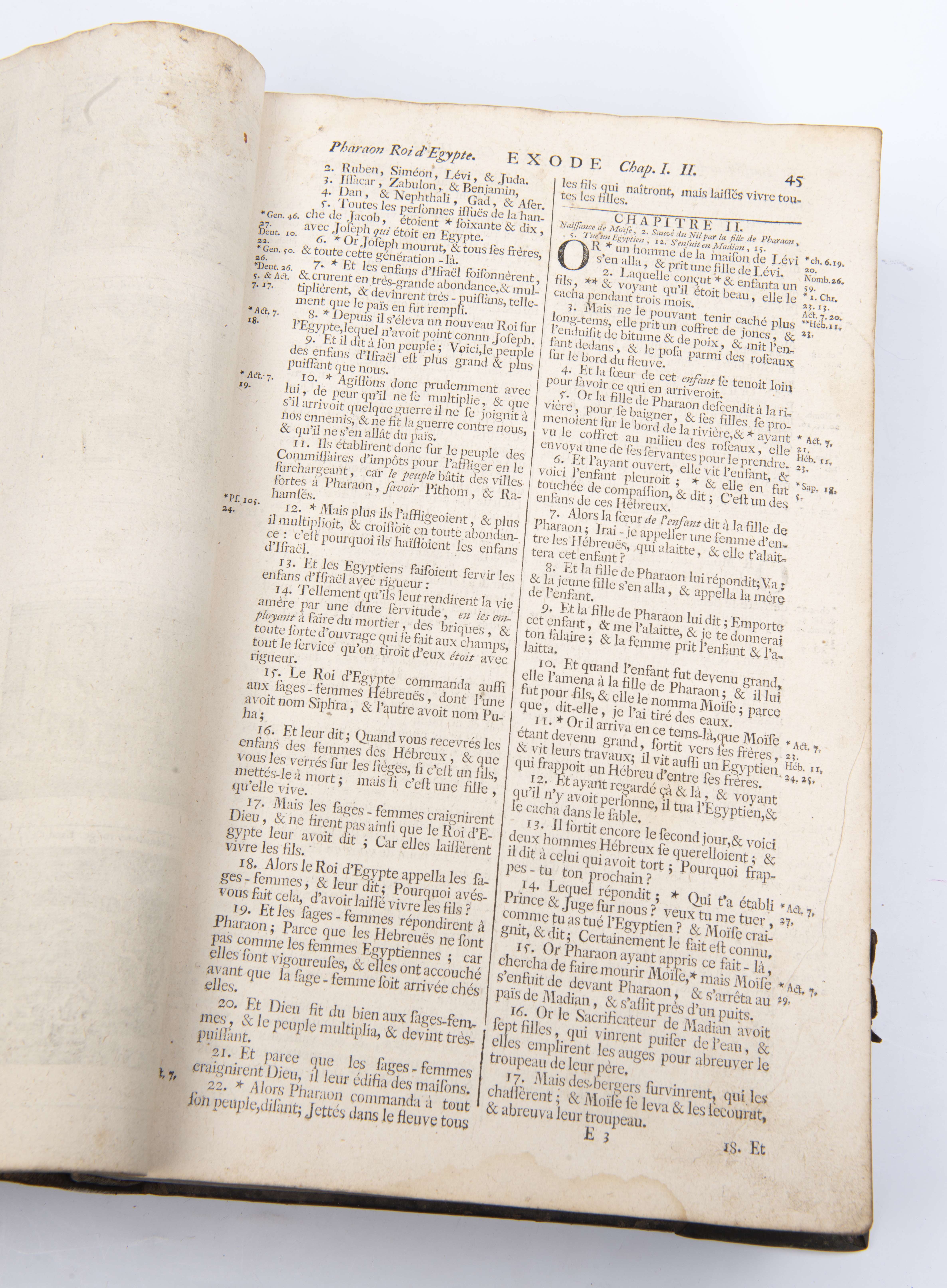 Heilmann, Jean Christophe & Neubrand, Jean Jacques, "La Sainte Bible du Vieux et du Nouveau Testament", Heilmann et Neubrand, Bienne. 1746. Suivant la version ordinaire des Eglises réformées, revue sur les originaux, et retouchée dans le langage. Avec des préfaces particulières sur chacun des livres de l'Ecriture Sainte, tirées de la Bible de Mr. Martin, nouvelle édition, revue et corrigée par Samuel Scholl, pasteur de l'église française de Bienne. A Bienne et Yverdon. Reliure en cuir brun et plaques en cuivre.