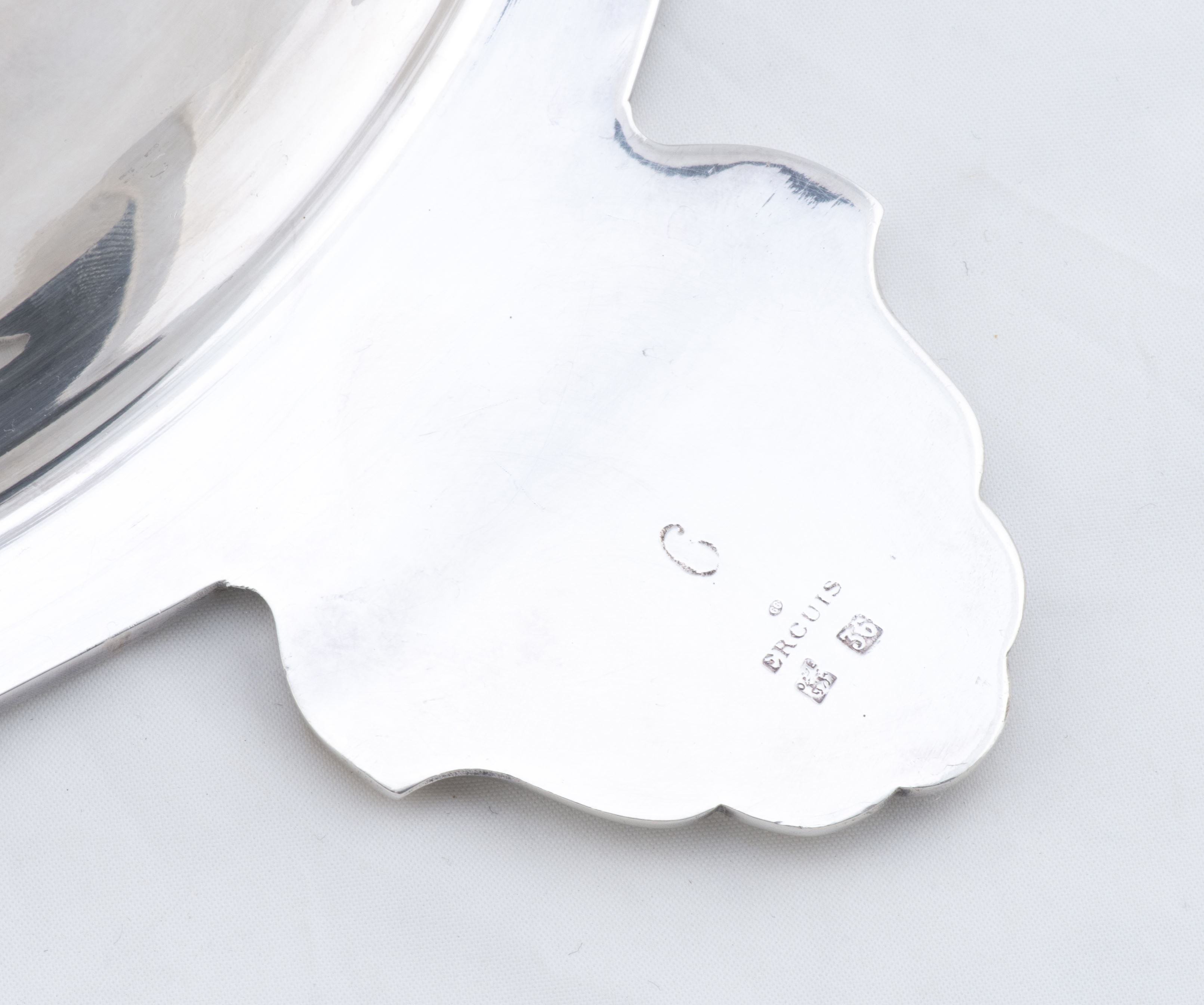 Ercuis, écuelle à oreilles ouvertes en métal argenté avec prise du couvercle en forme de gland.