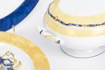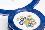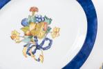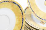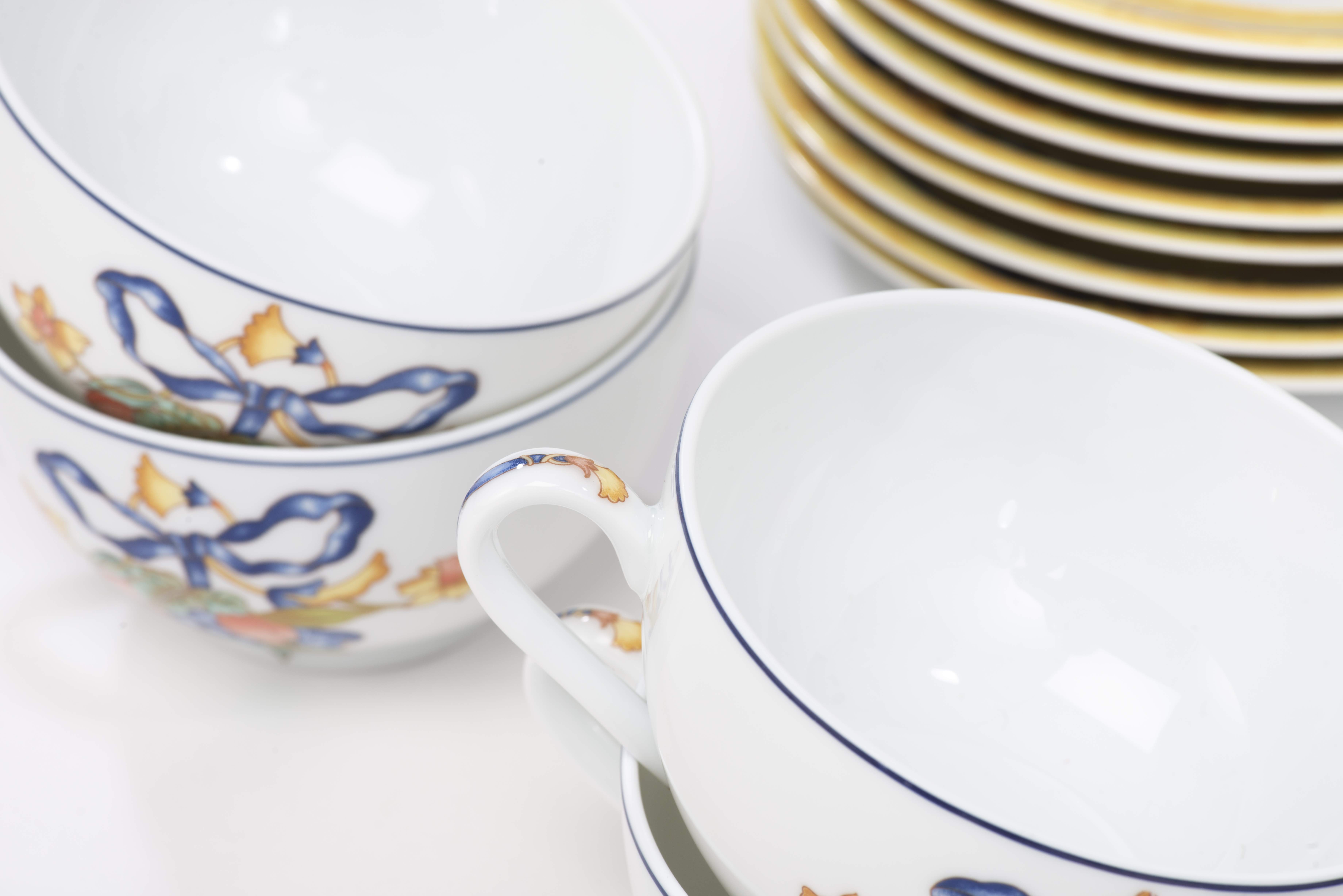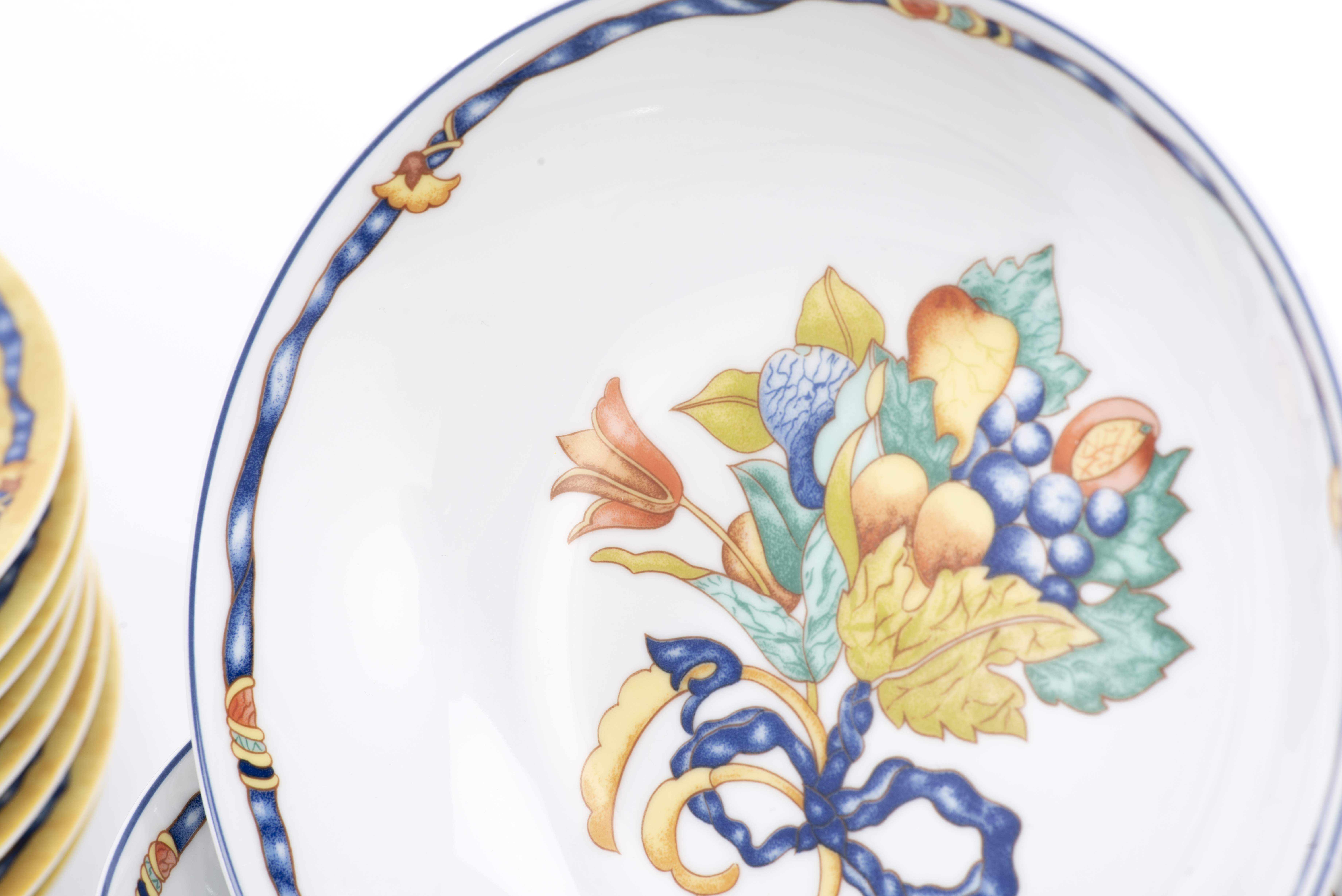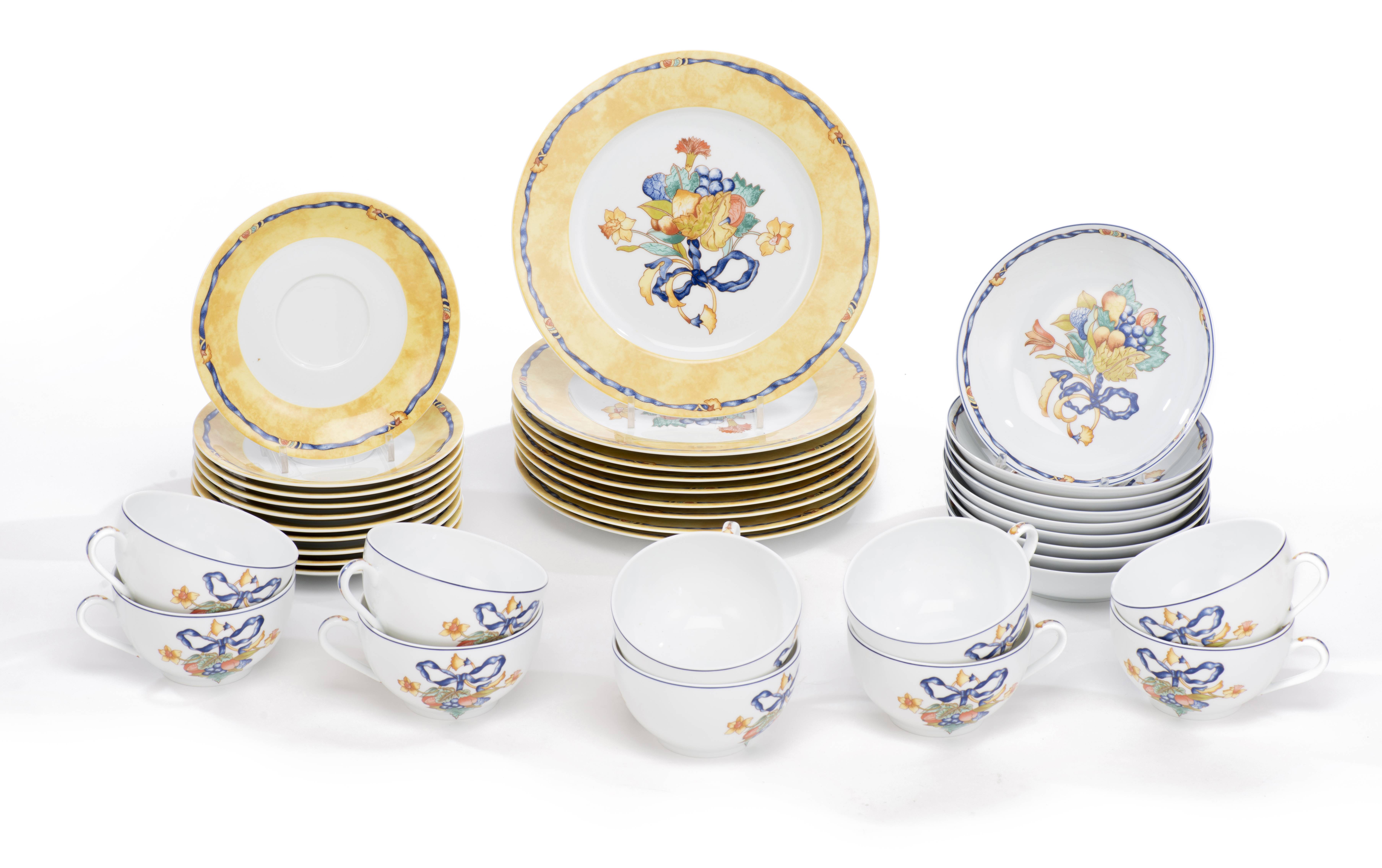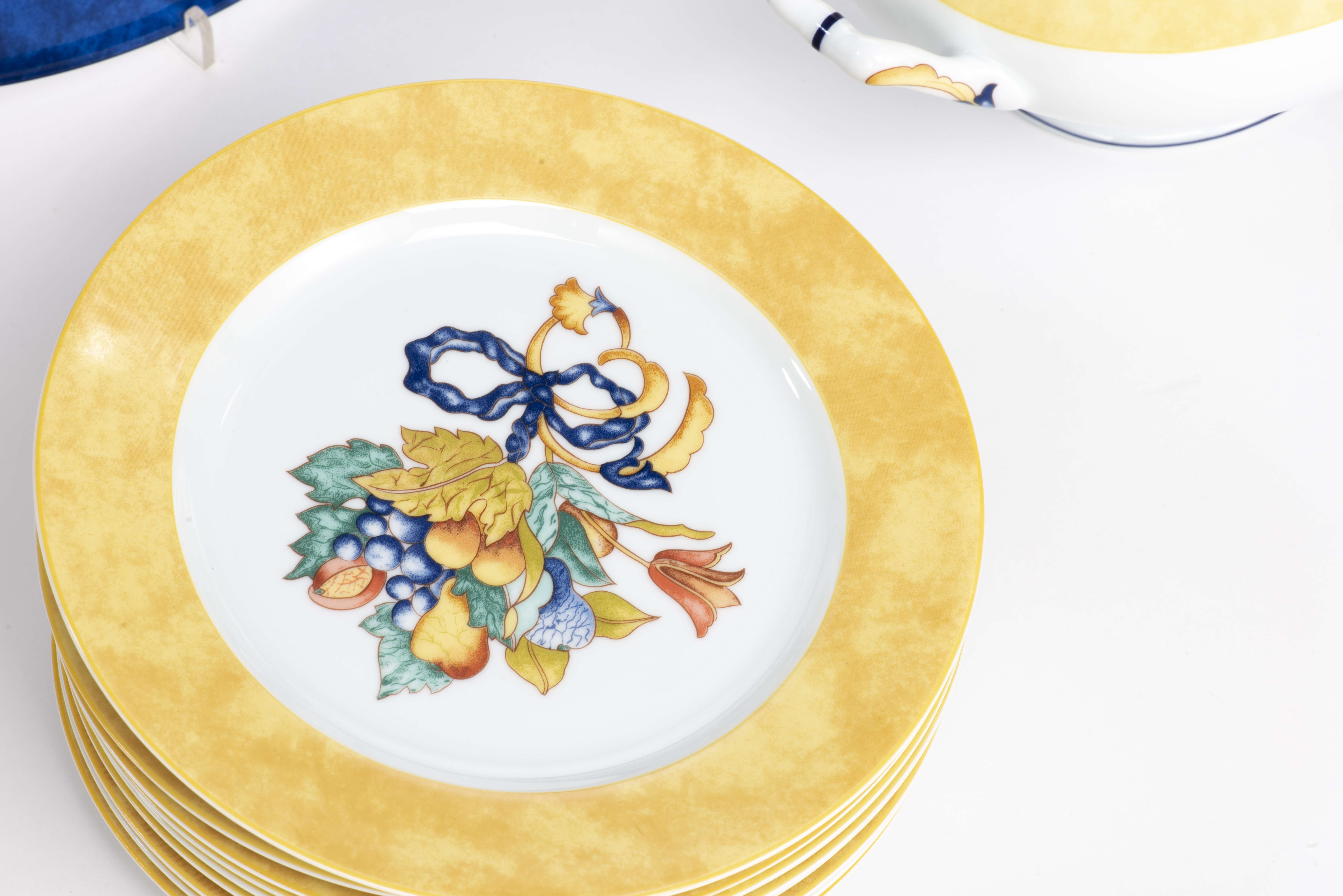 Service en porcelaine de Limoges Bernardaud motif " Borghèse" jaune et blanc avec ruban bleu et fleurs et raisins comprenant :