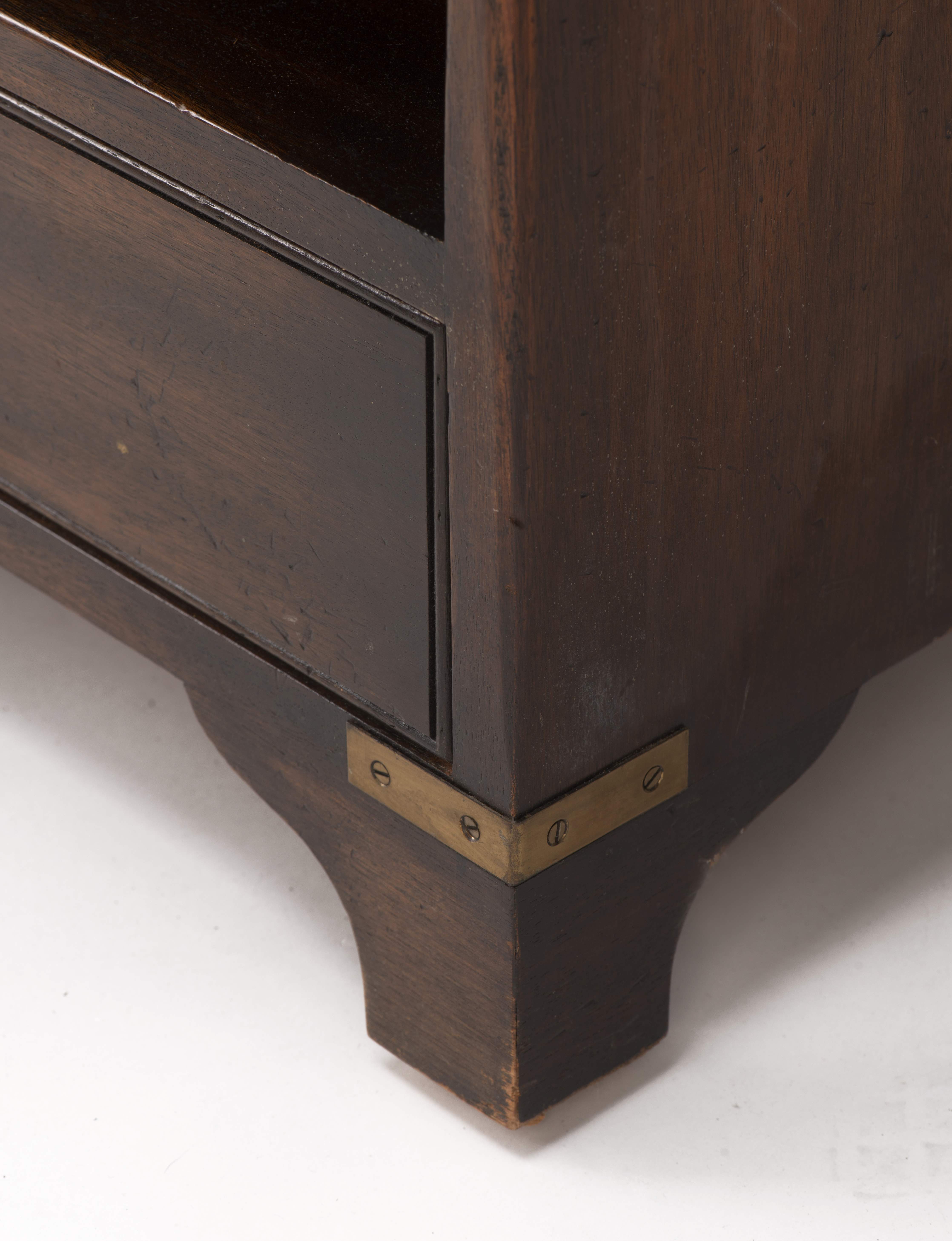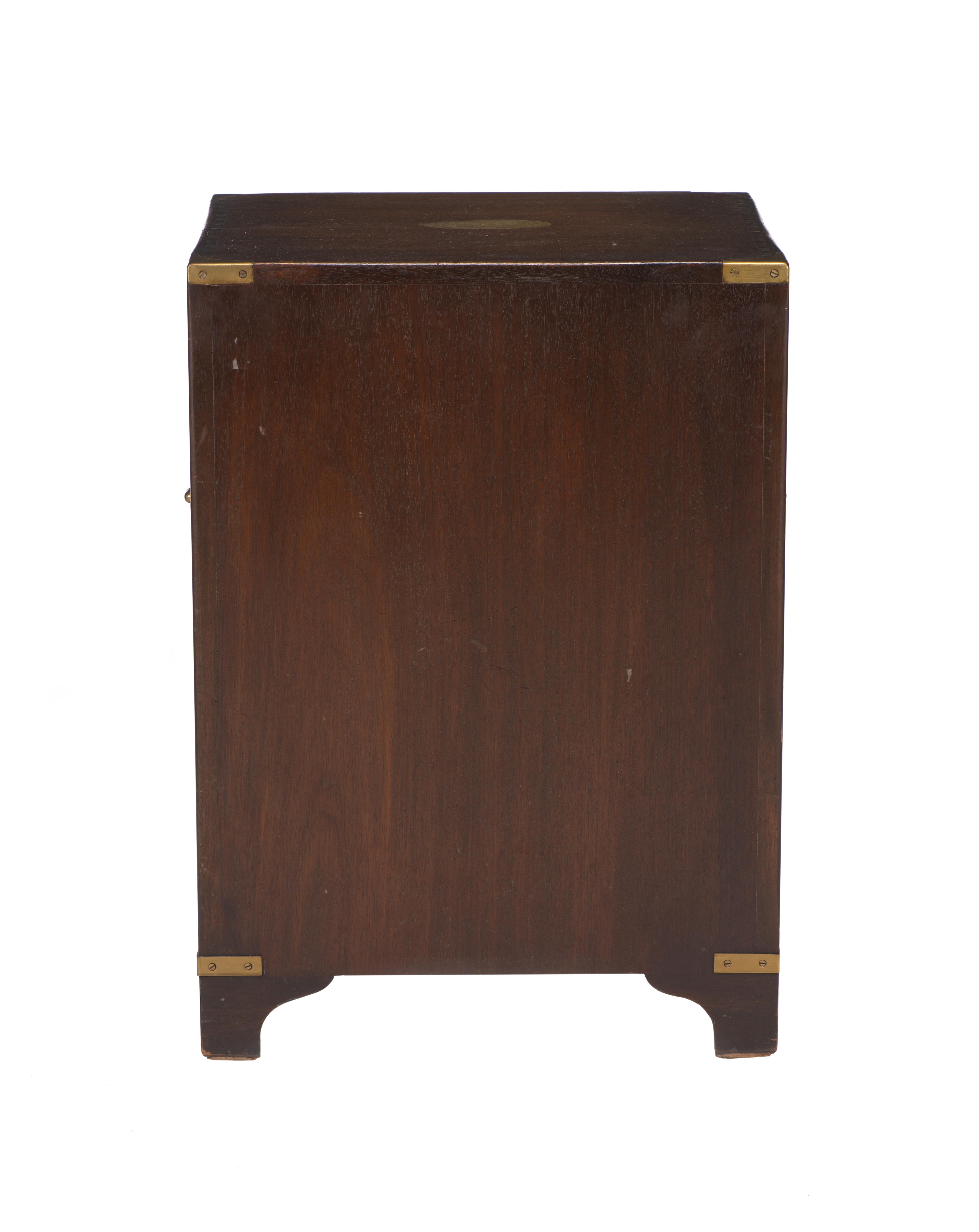 Chevet en bois teinté acajou, insert en laiton sur le dessus et les angles, poignée de chaque côté, une tablette, deux tiroirs et une case.