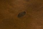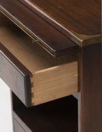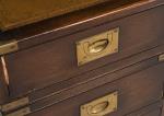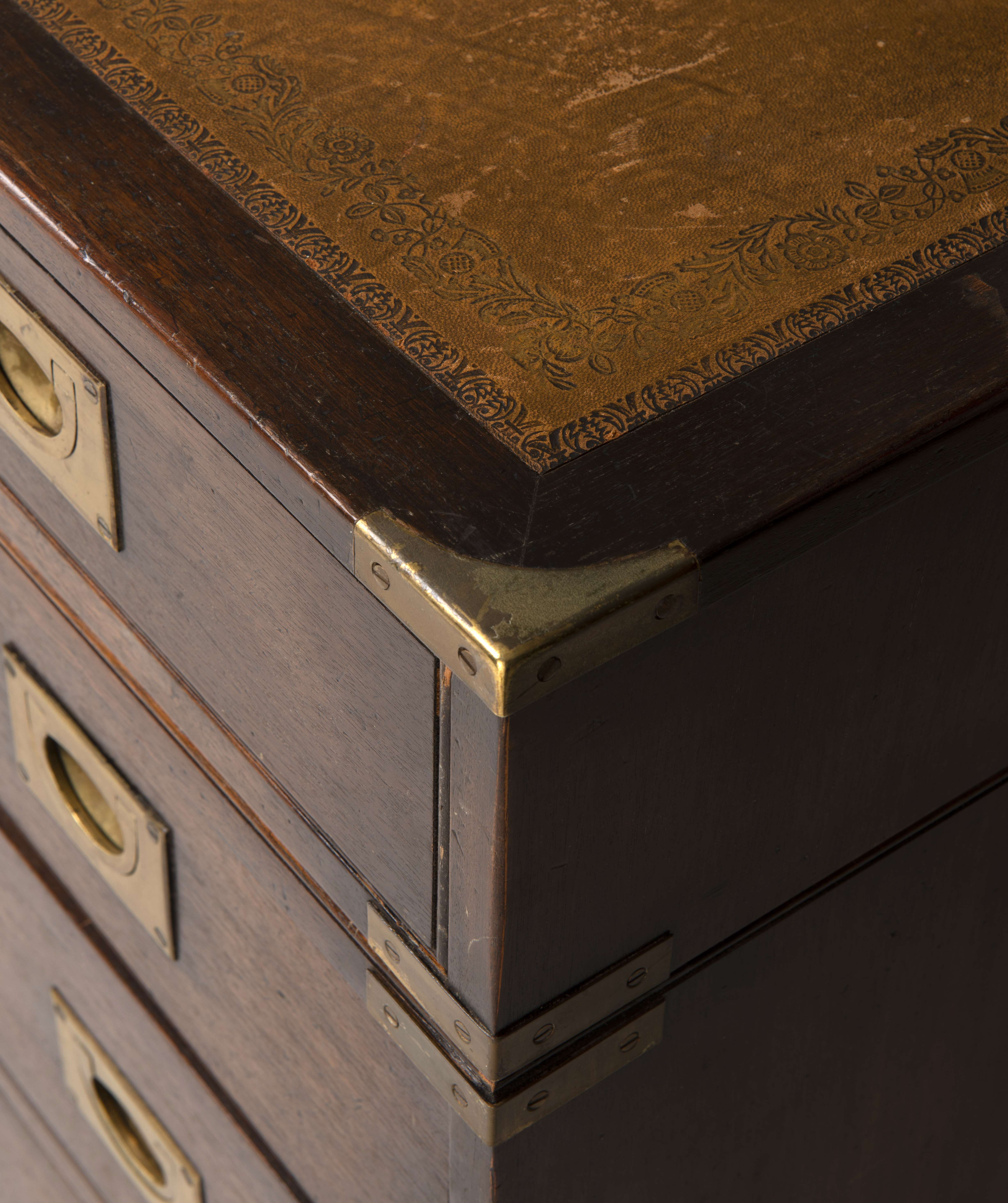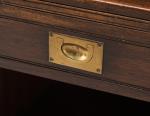Bureau de marine à deux caissons en bois teinté acajou composé de 9 tiroirs, poignées et angles en laiton, dessus de cuir gaufré.