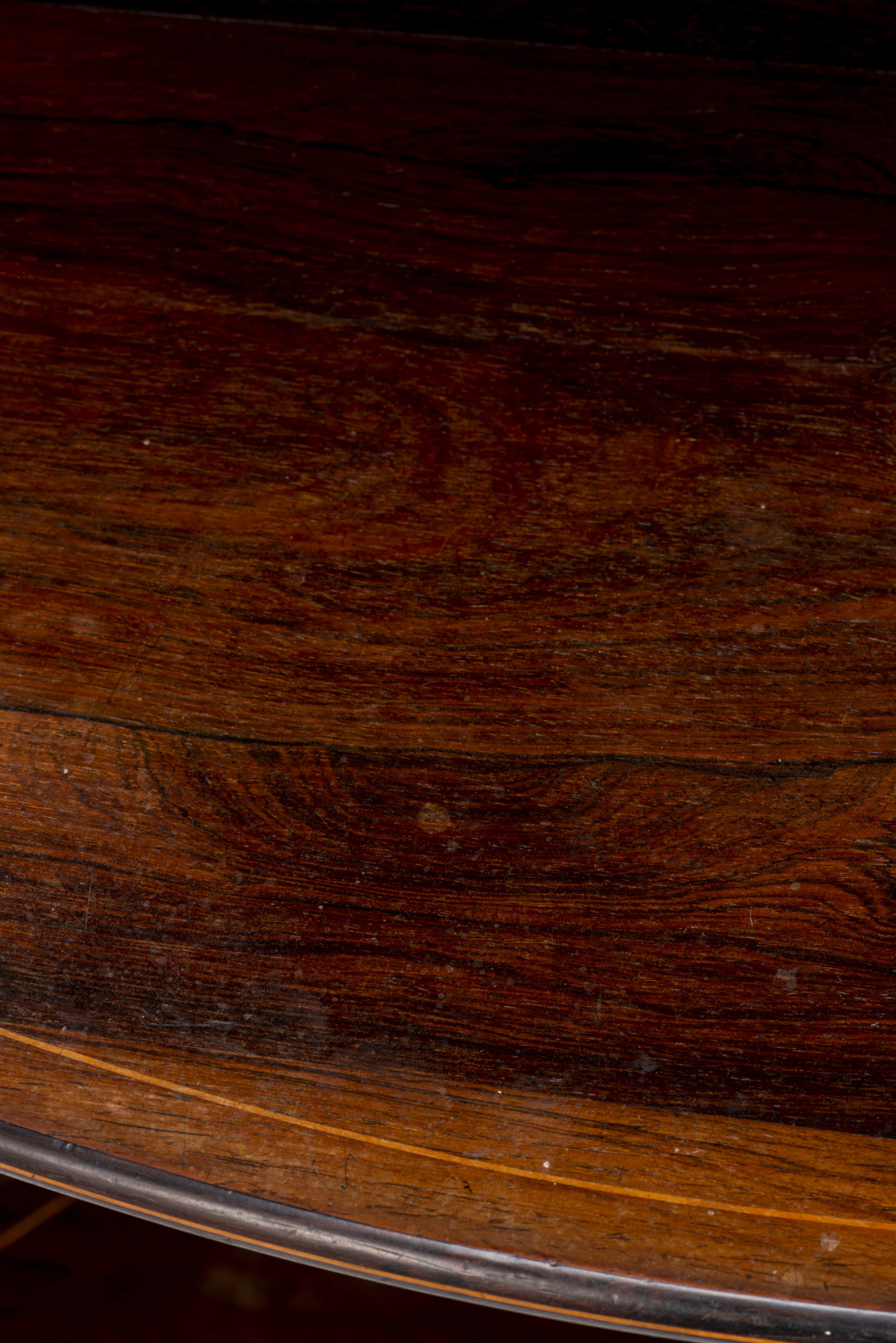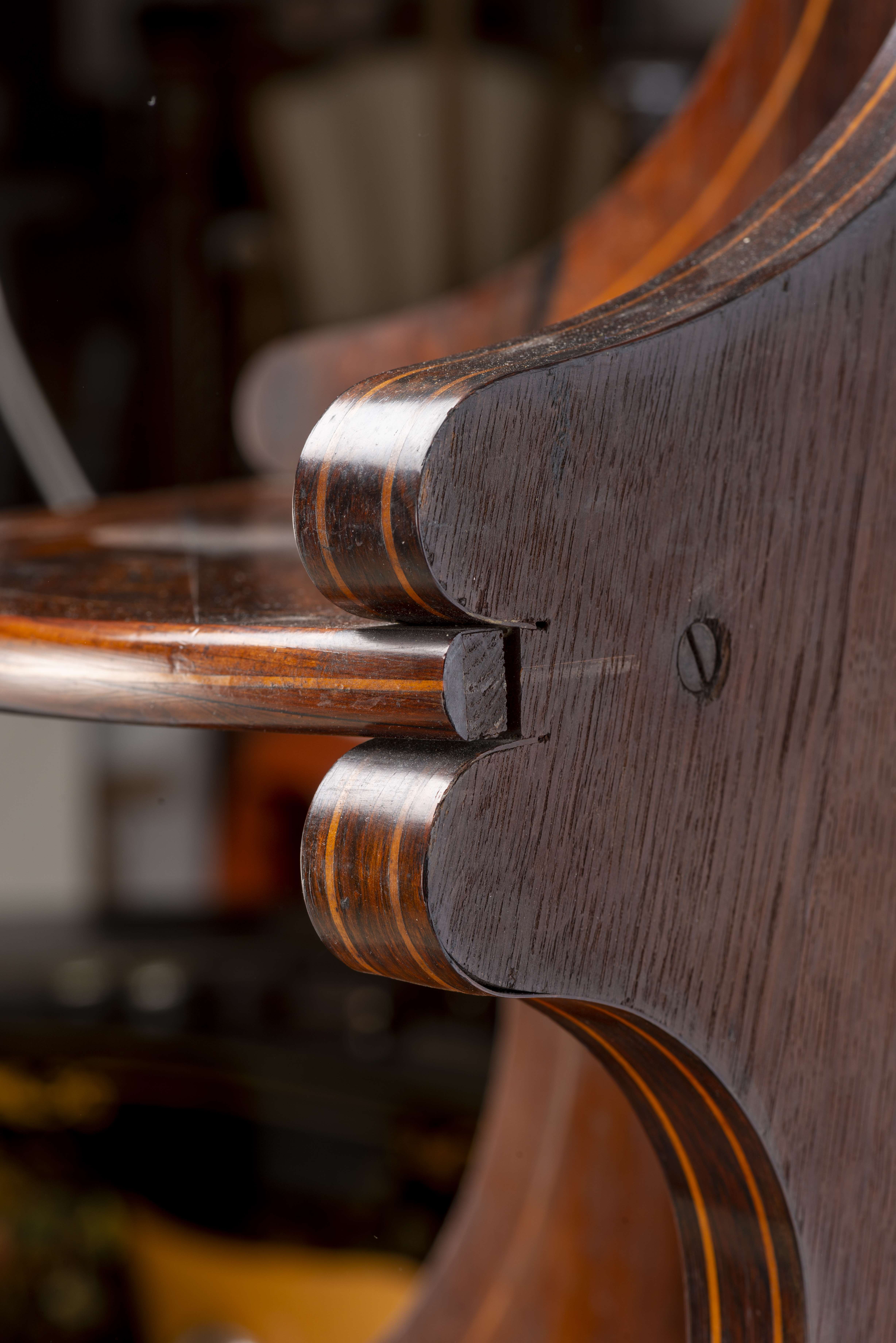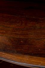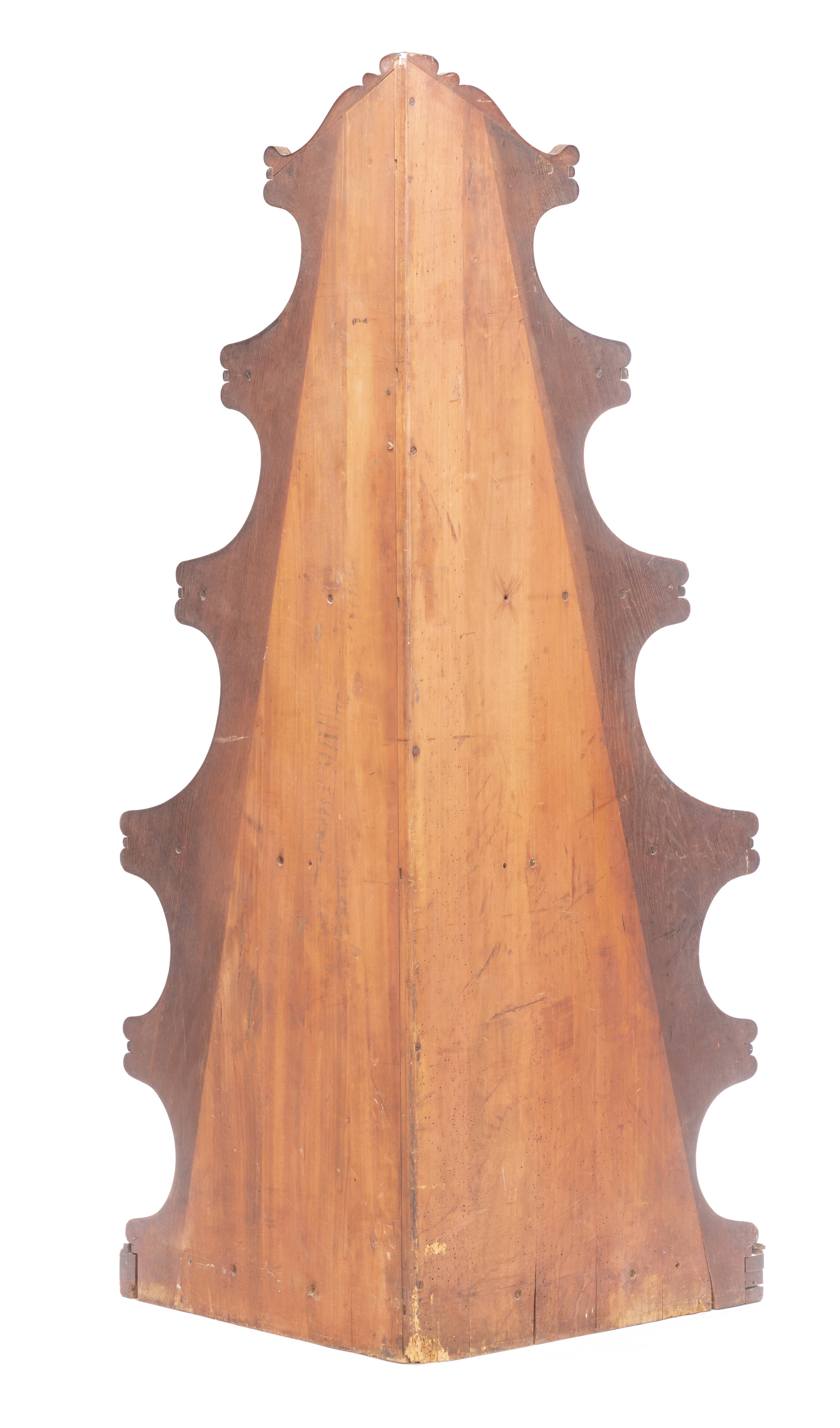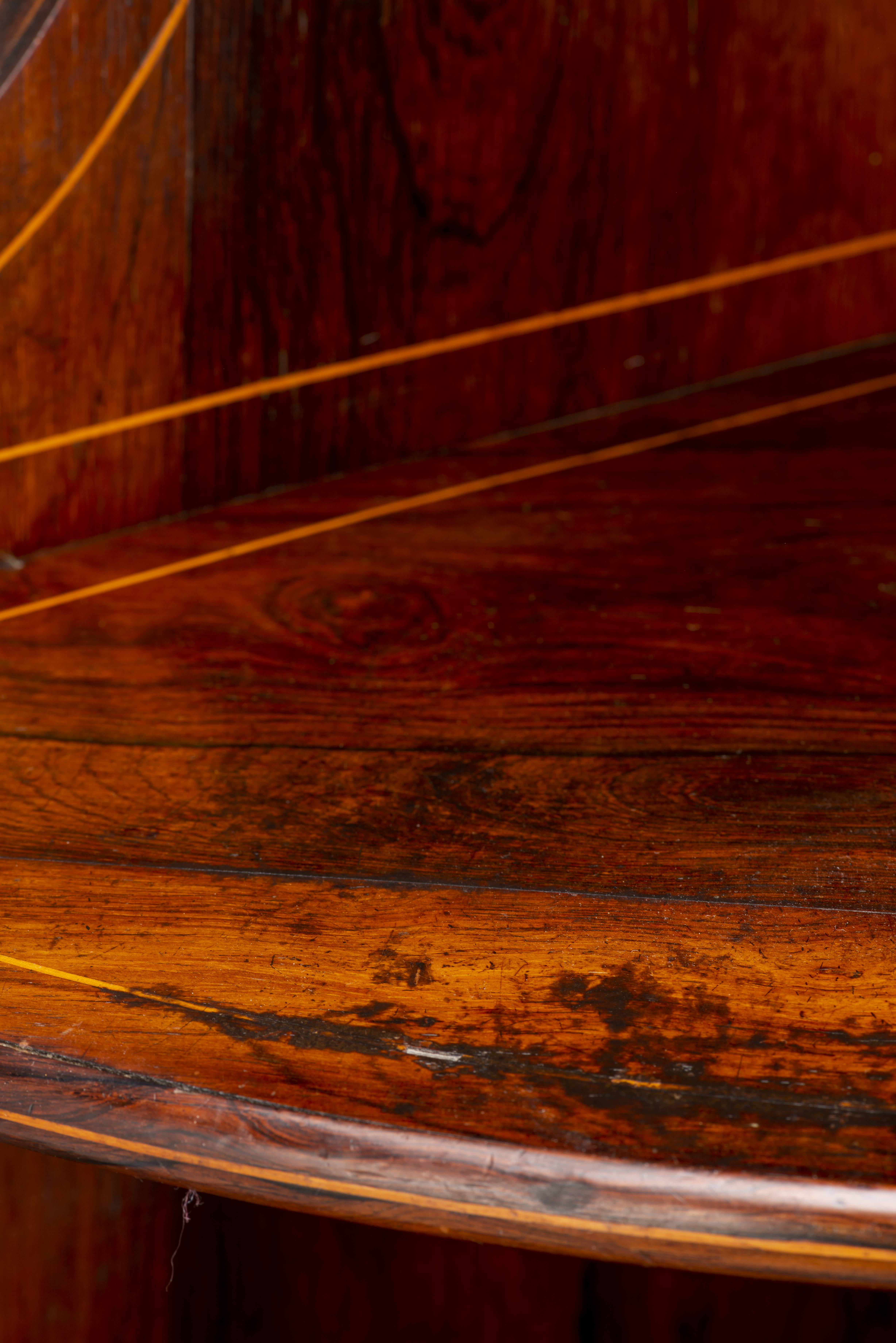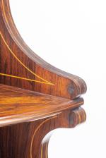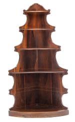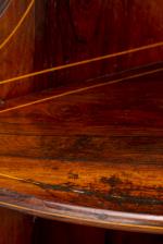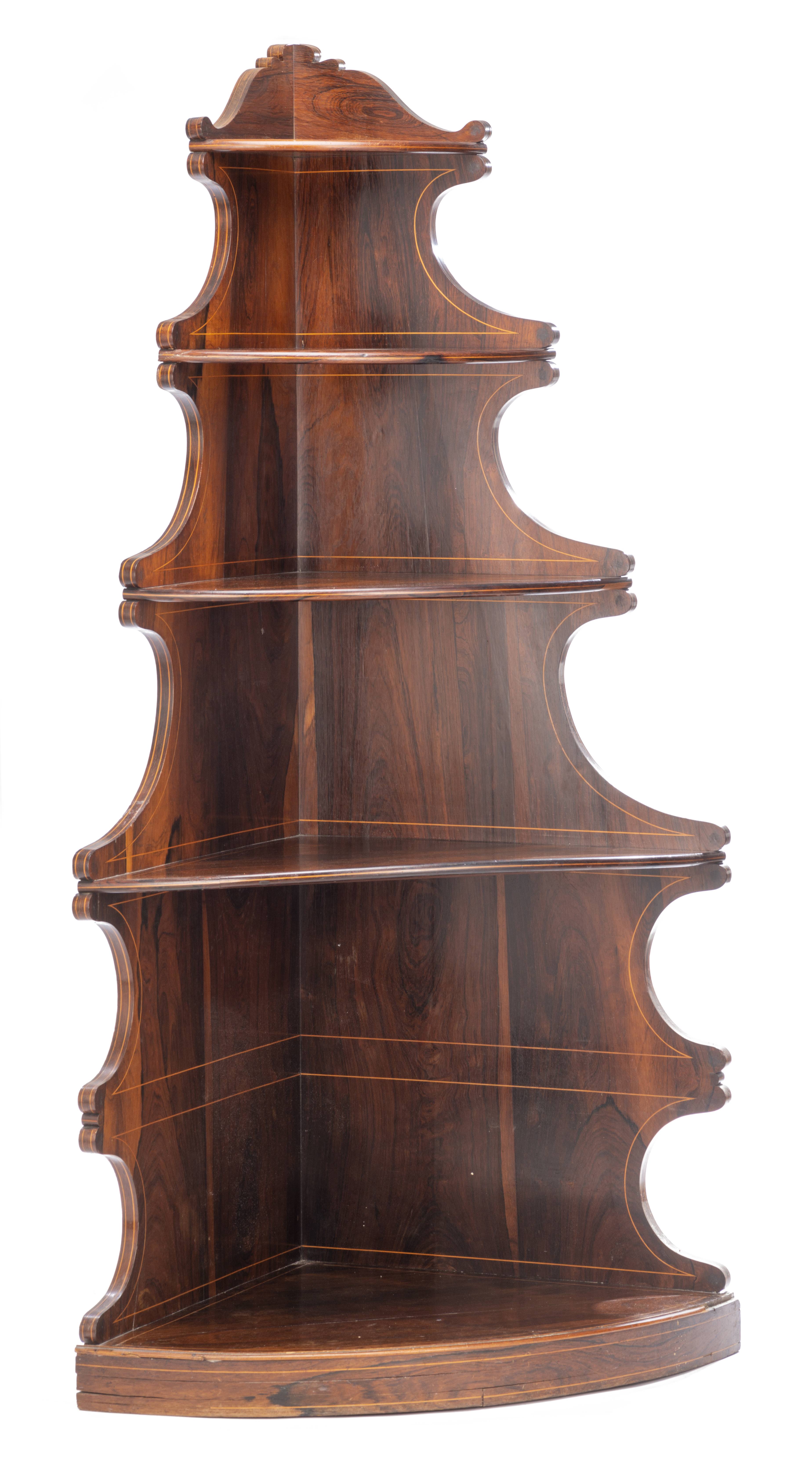 Étagère d'angle anglaise en palissandre à 5 tablards, avec incrustations de bois clair.