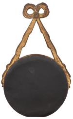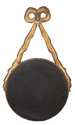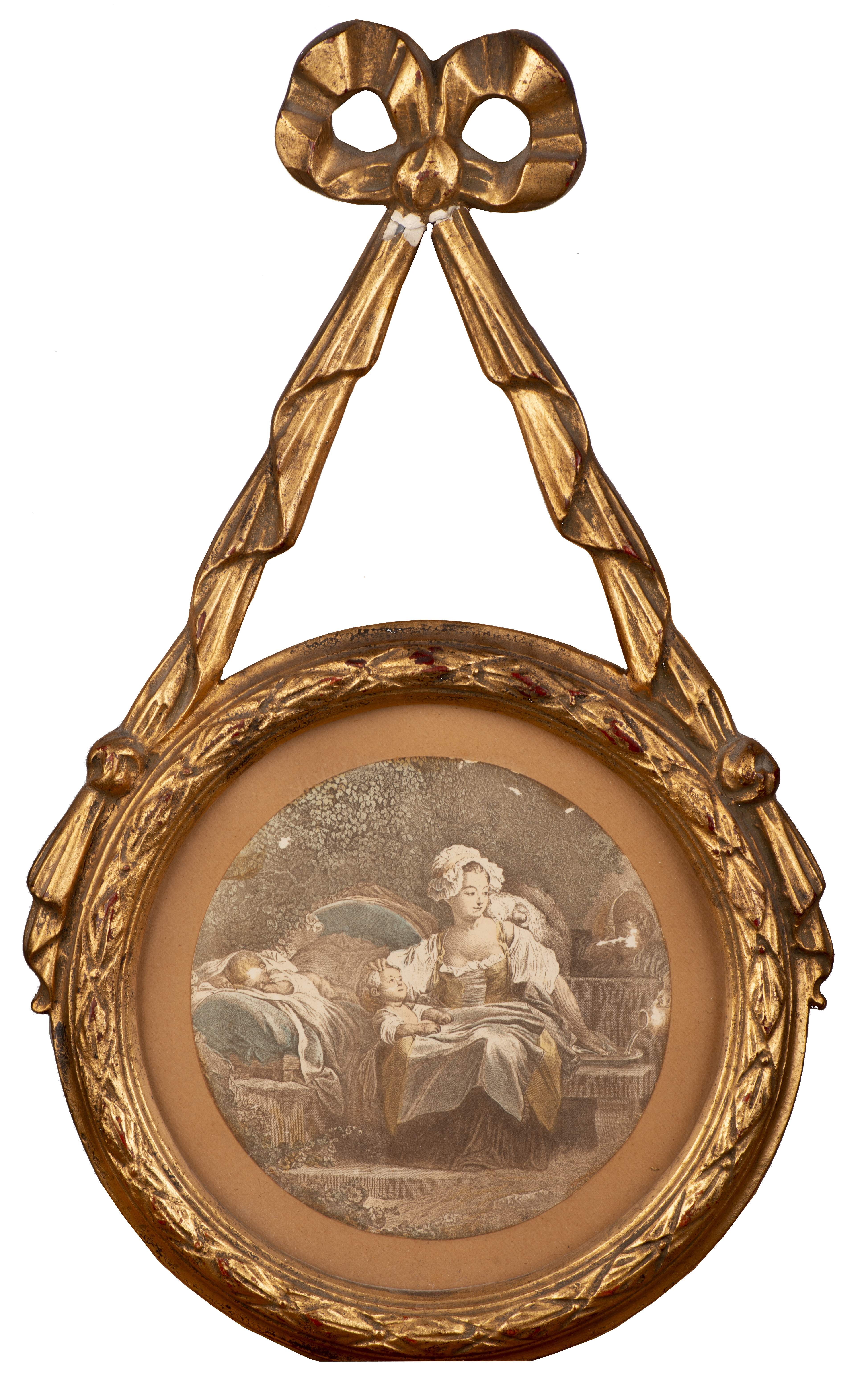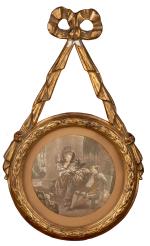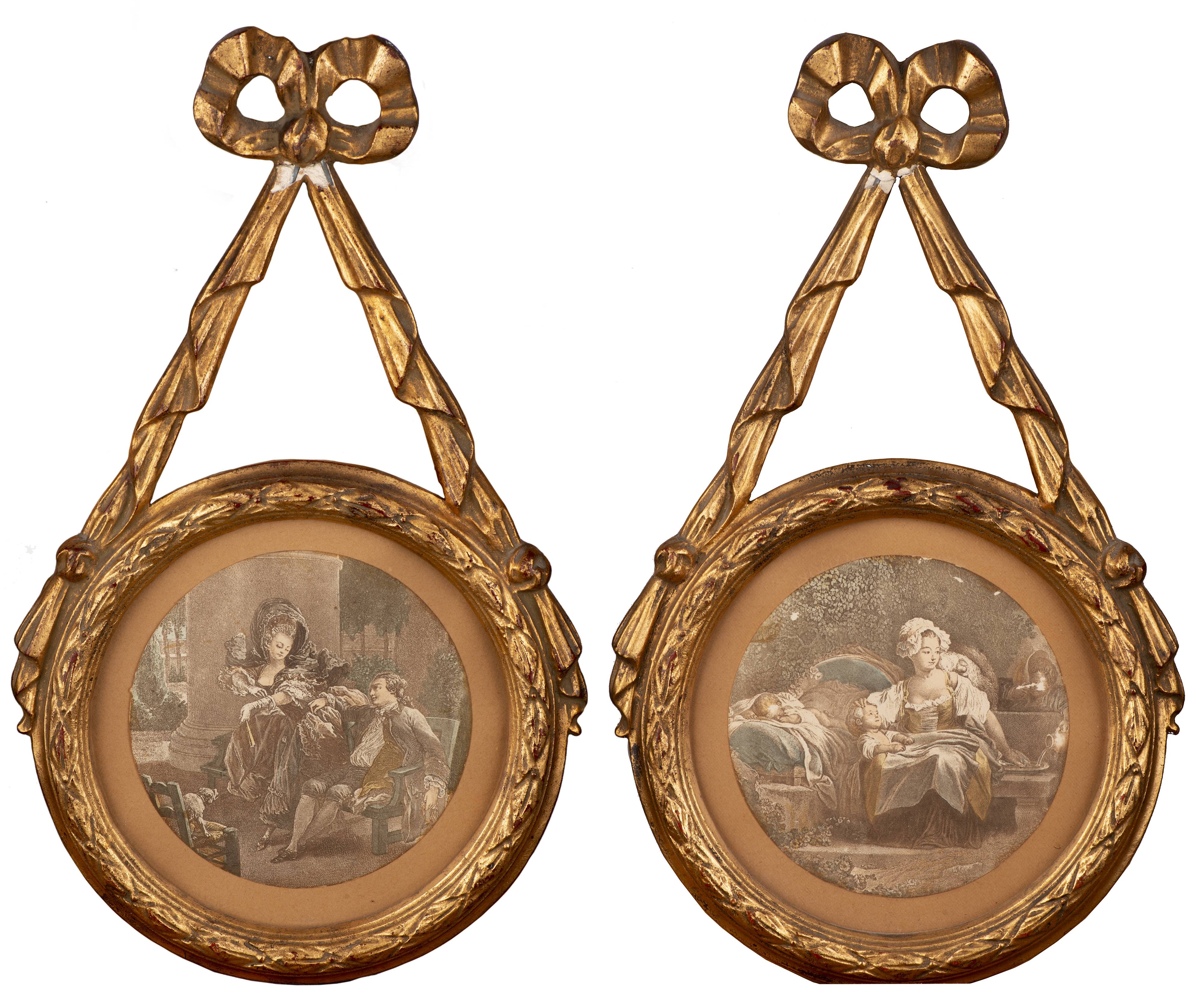 Paire de gravures en tondi dans des encadrements en stuc doré suspendus par un ruban noué. Ns.