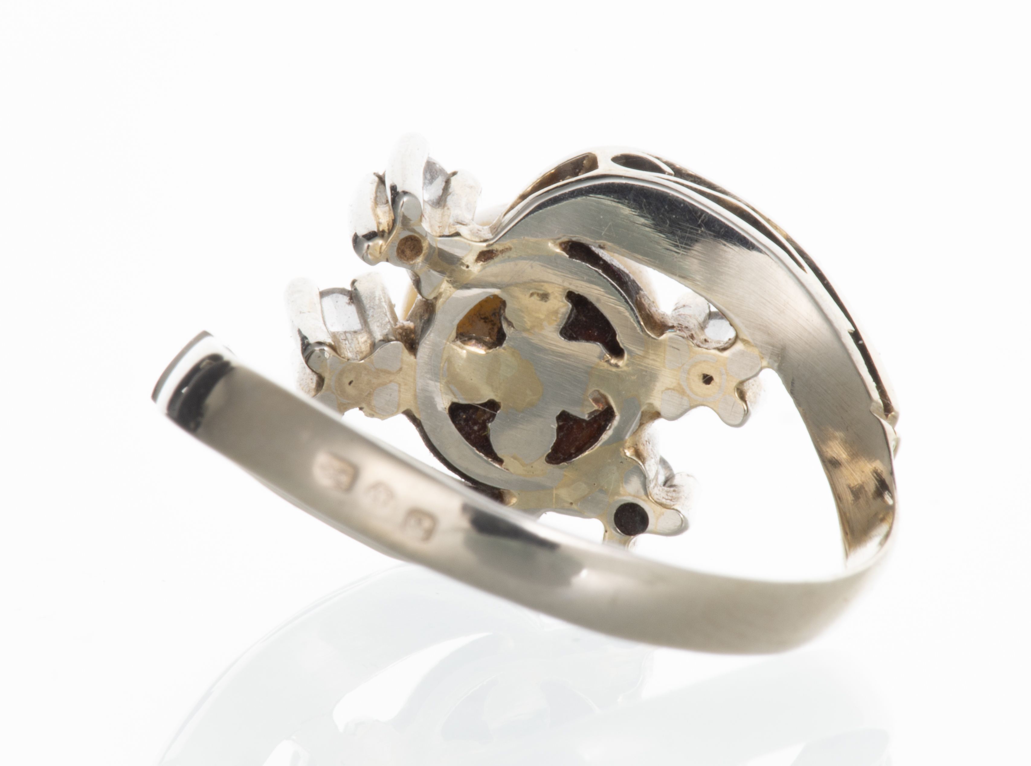 Bague en or blanc .750 de Porto du Portugal sertie au centre d'une perle de diam. ~6.7 mm et quatre pierres blanches d'imitation.