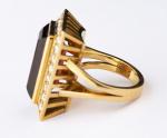 Bague en or jaune .750 sertie en son centre d'une citrine madère de taille émeraude sertie close de env. 7 cts et entourée de 26 diamants de 0.03 pt chacun pour un total de 0.75 ct.