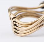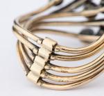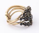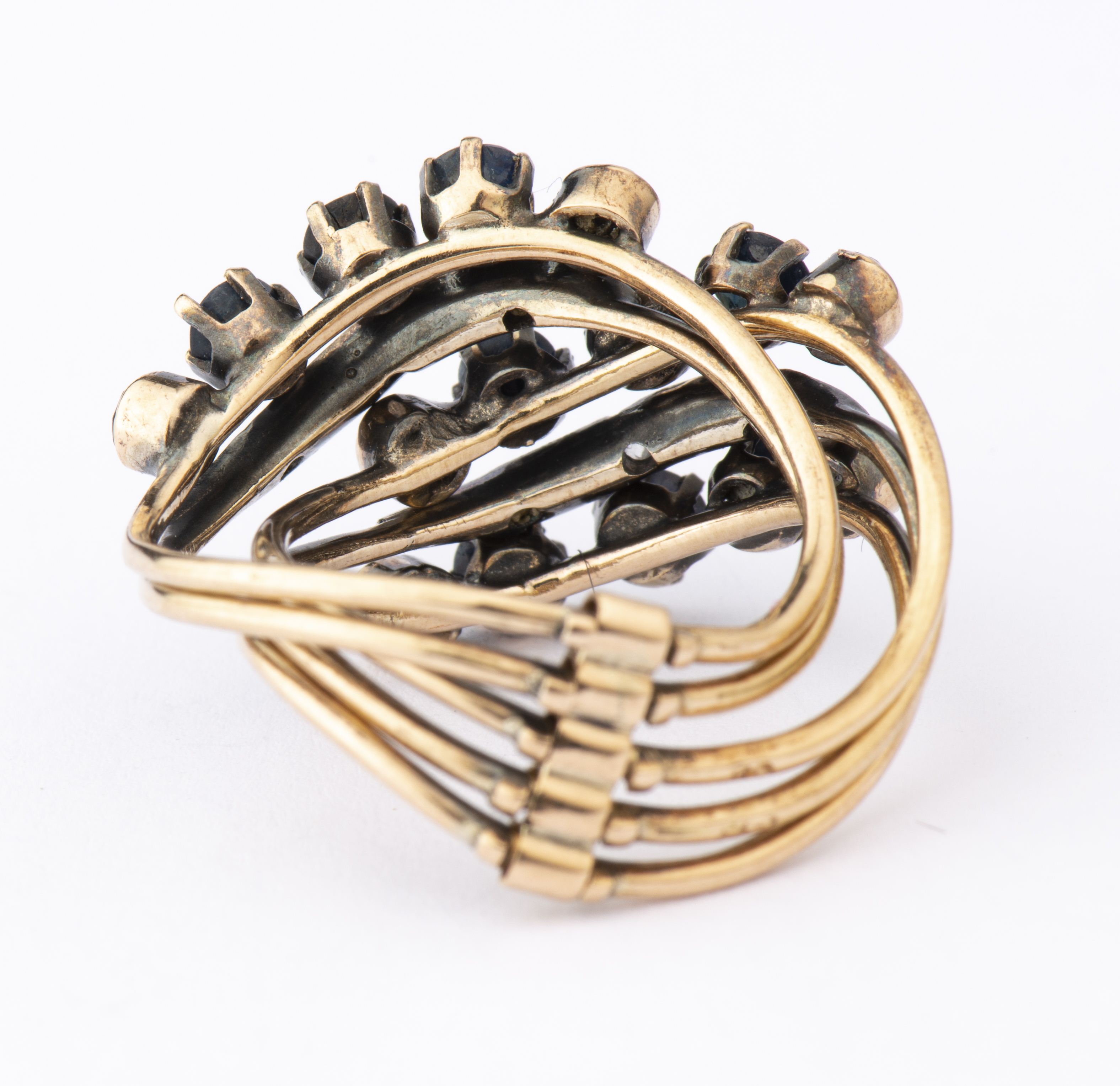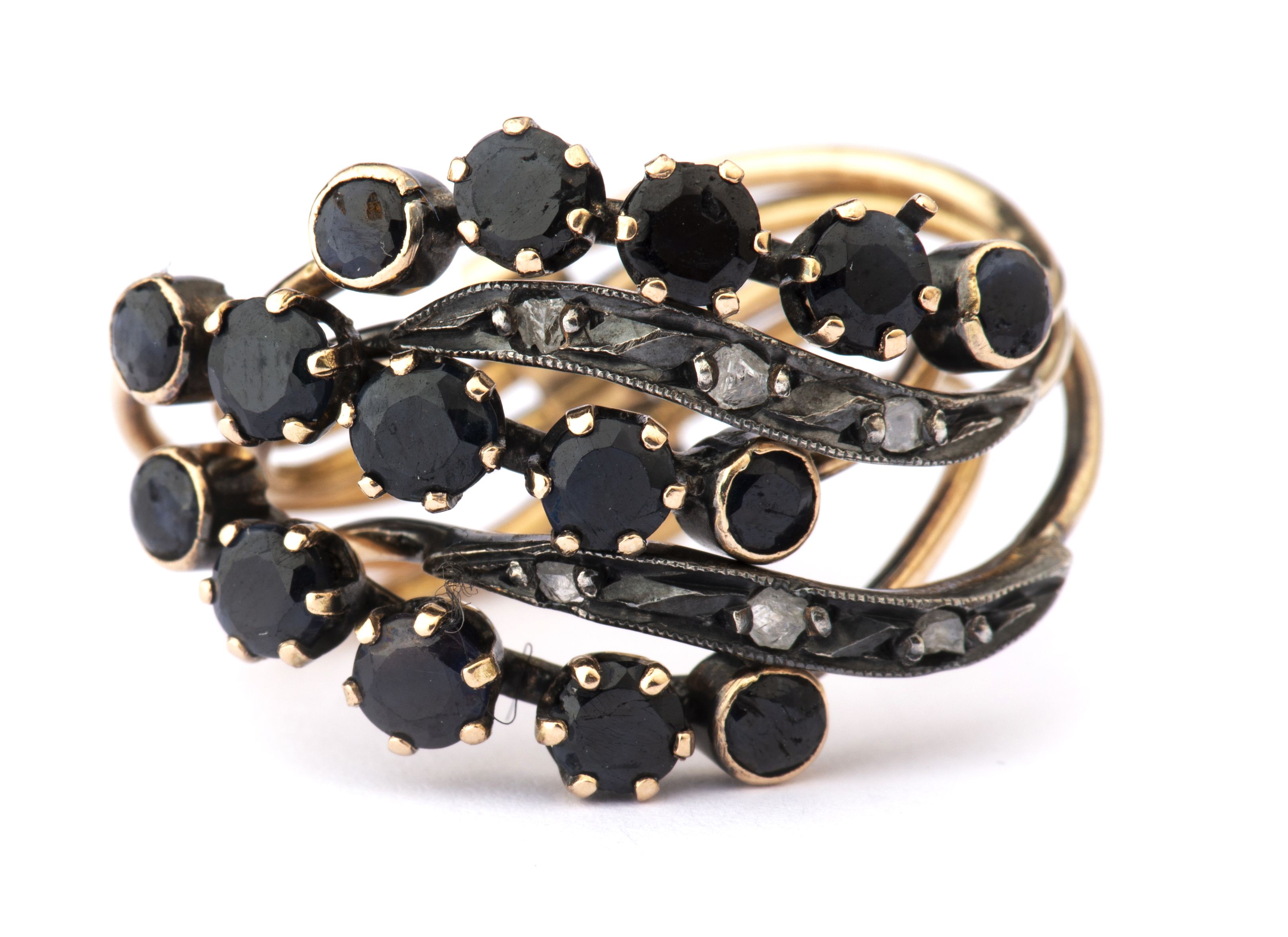Bague on or .585 composée de trois rangs de saphirs et deux rangs de diamants montés sur de l'argent de taille rose pour 0.06 pt de diamants, 15 saphirs noirs pour 0.70 ct.