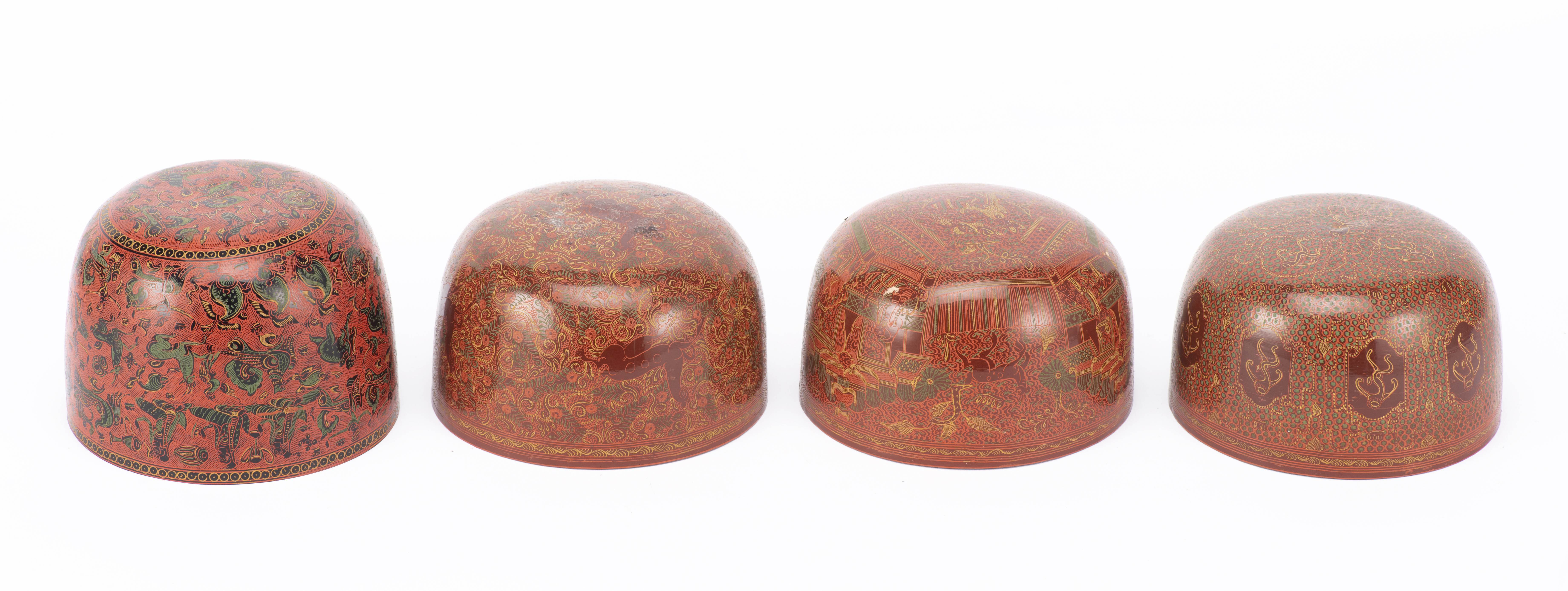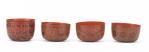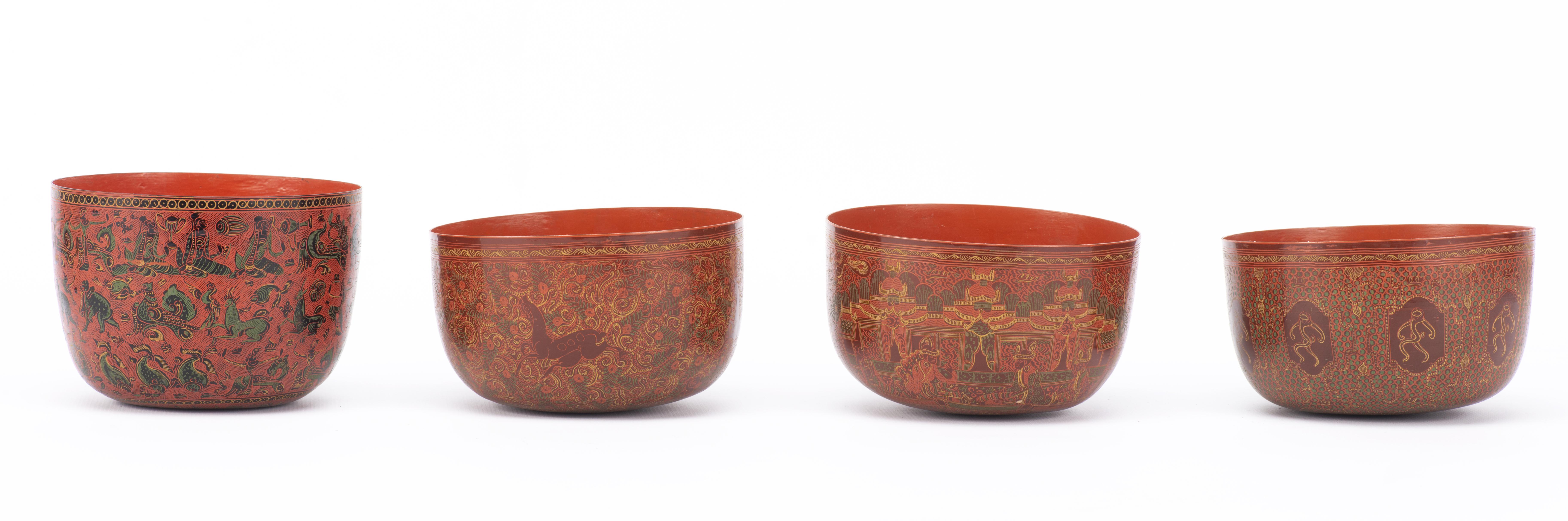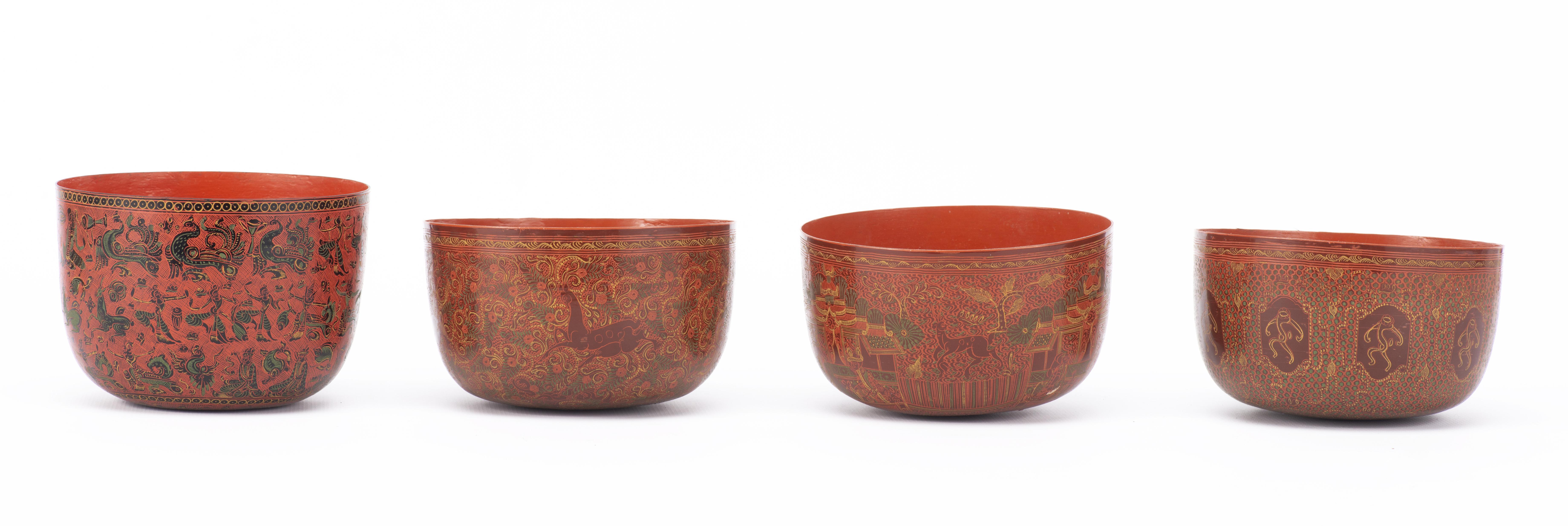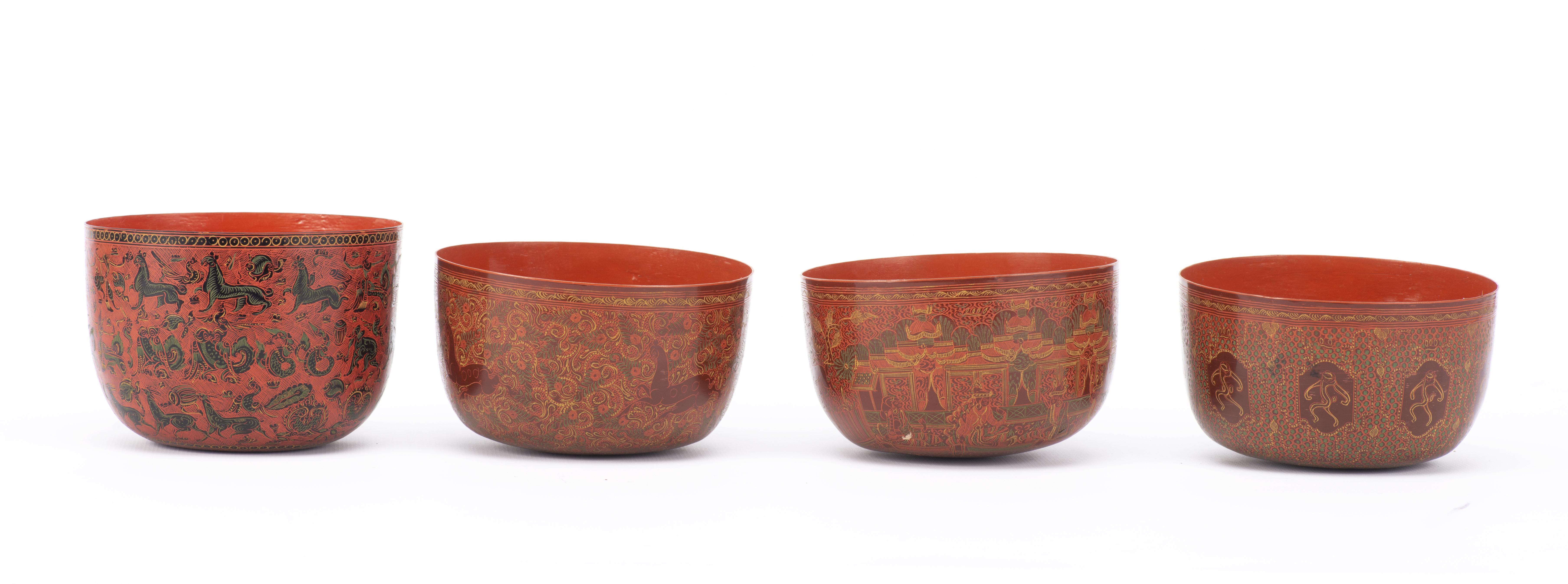 - quatre bols souples en laque de Birmanie à décor de scènes de personnages et animaux en jaune, vert, rouge et noir sur champ orange.